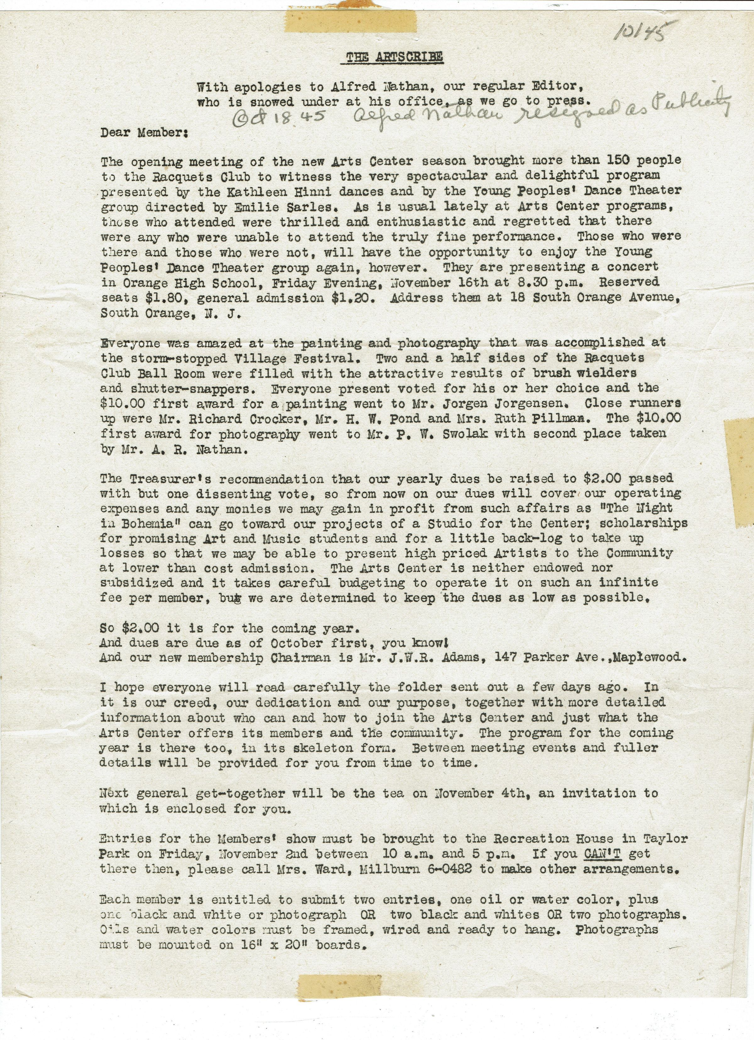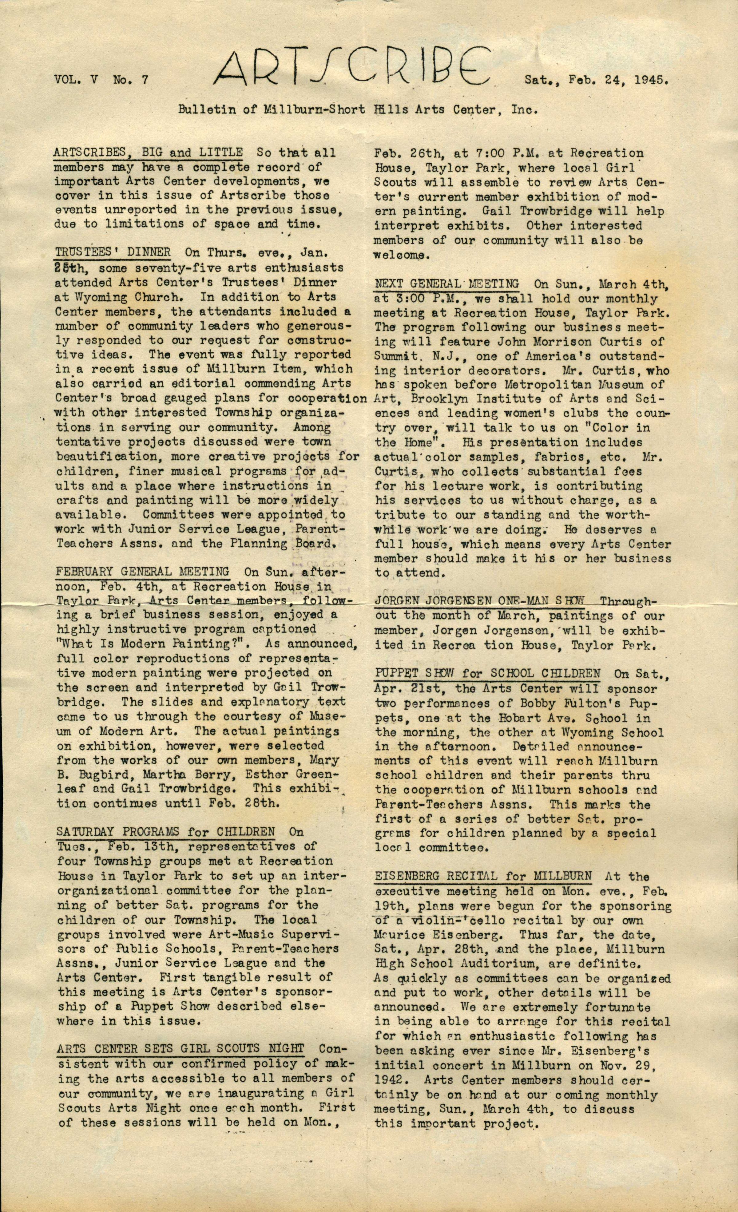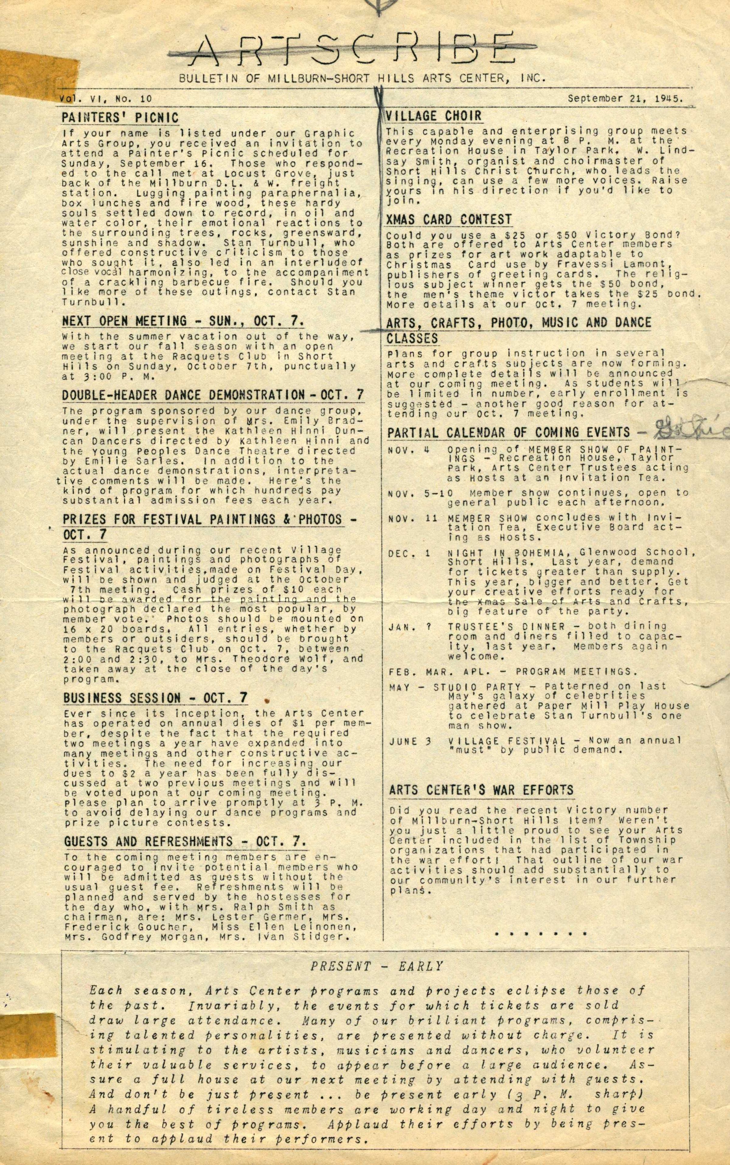 Millburn Art Center: Artscribe Newsletters, 1945
