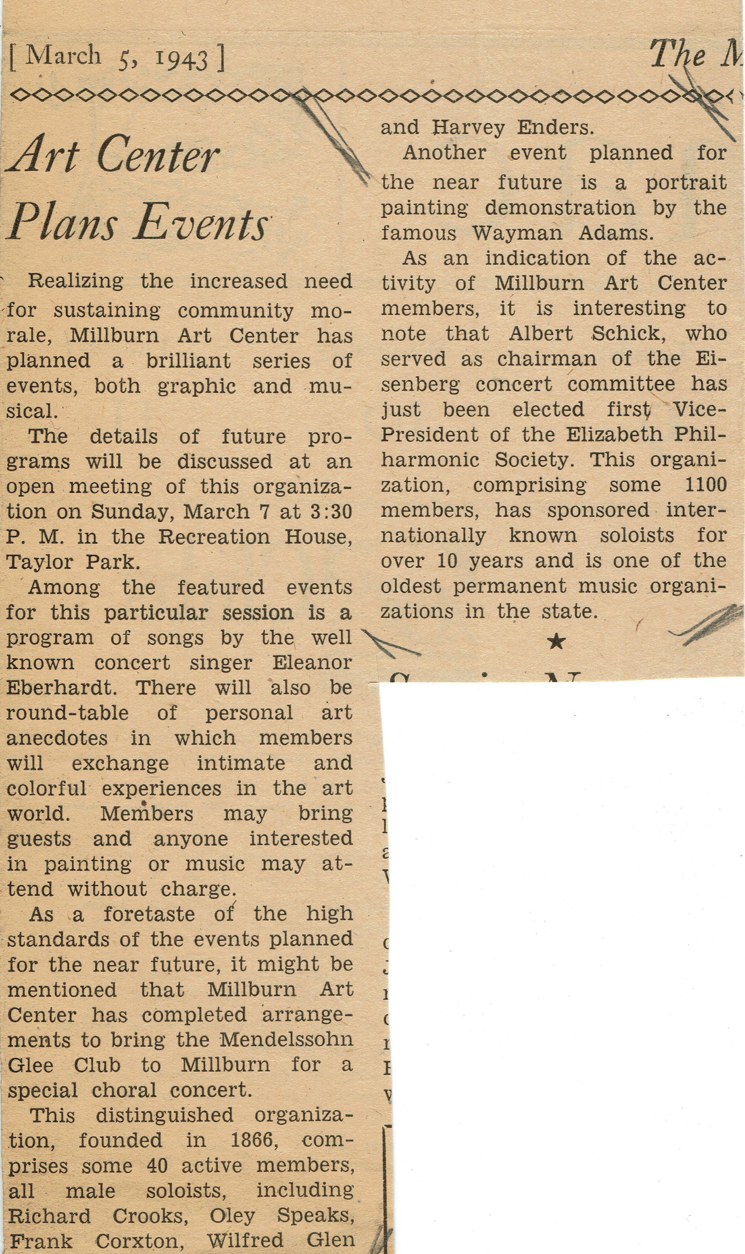 Millburn Art Center: Event Plans, 1943Entry/Object ID