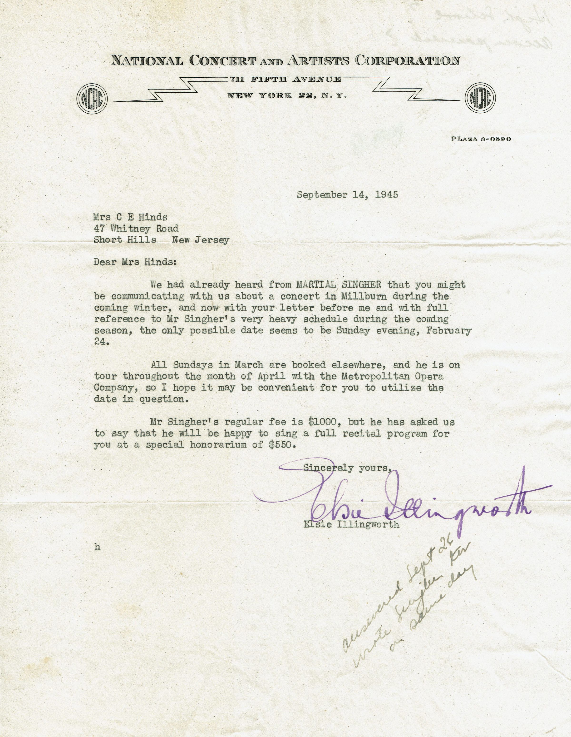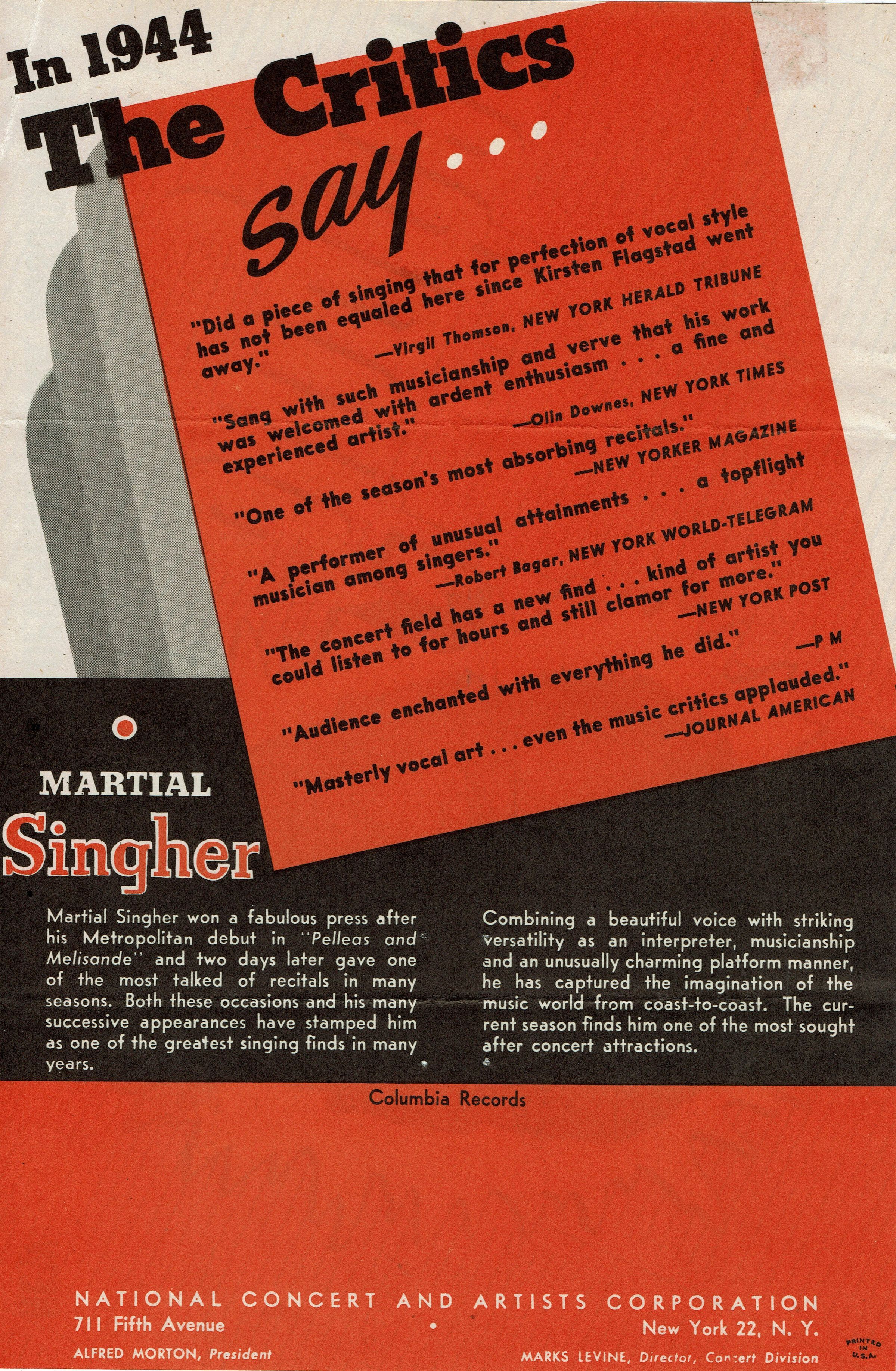 Millburn Art Center: Martial Singher Flyer, 1945