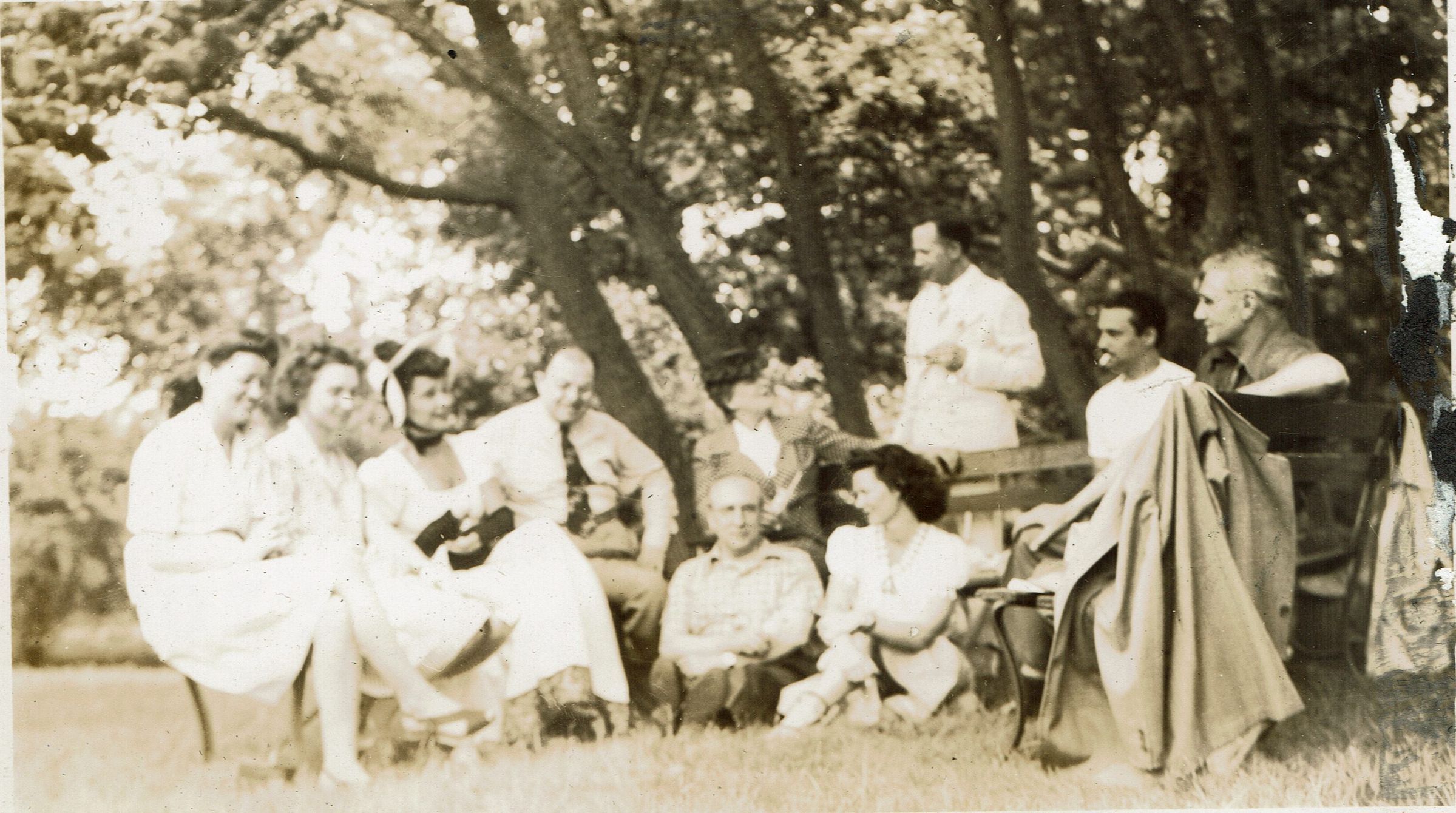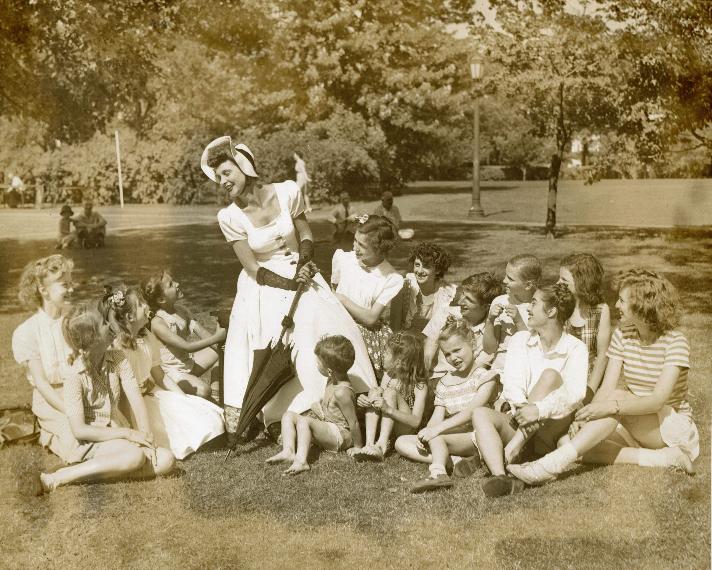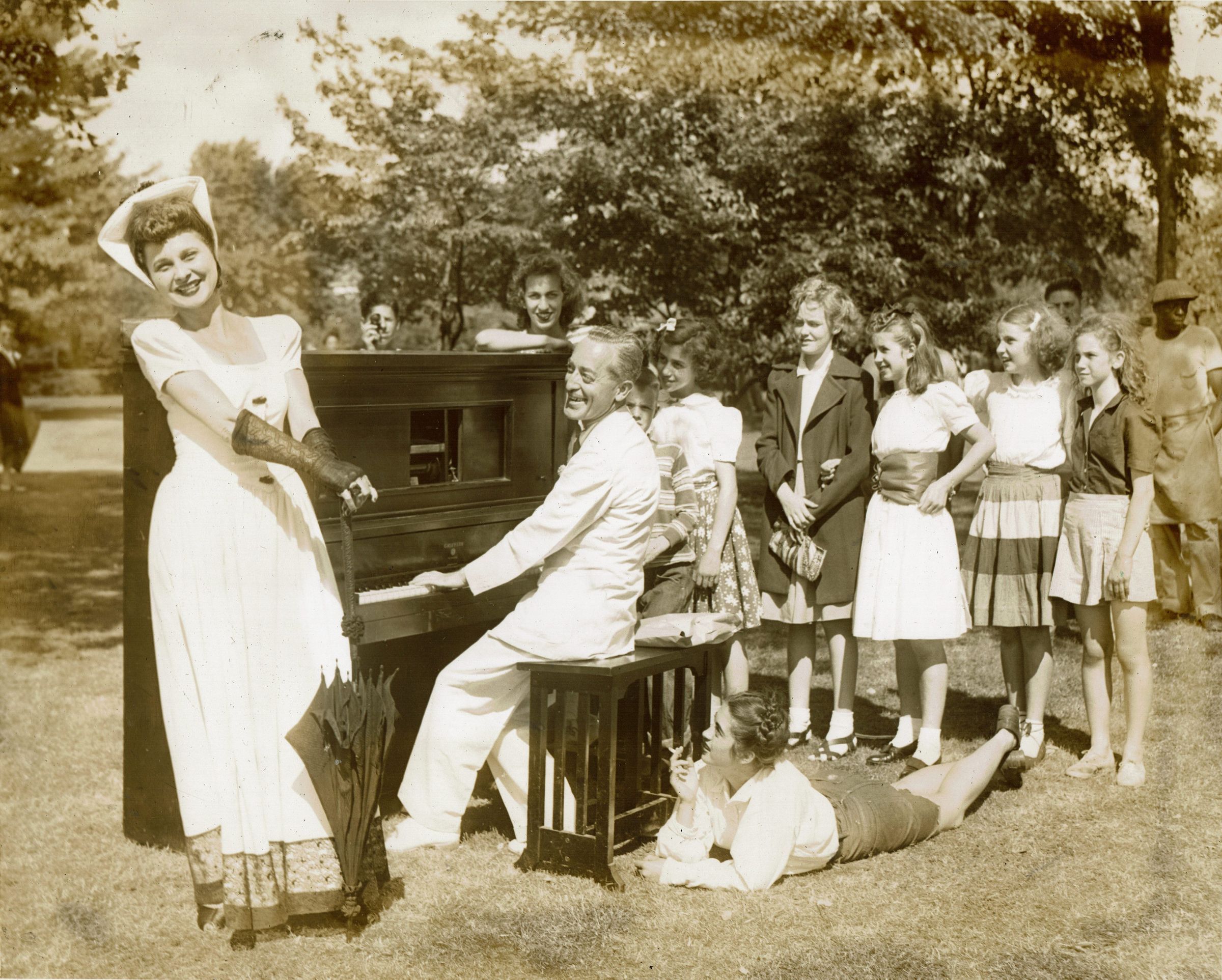 Performers from Paper Mill Playhouse at the June 3, 1944 Village Festival in Taylor Park sponsored by the Millburn-Short Hills Art Center. Two publicity shots and one photograph of performers taking a break in Taylor Park.Collection