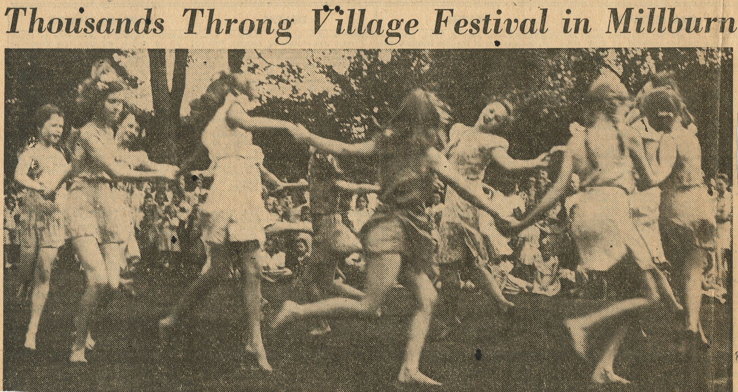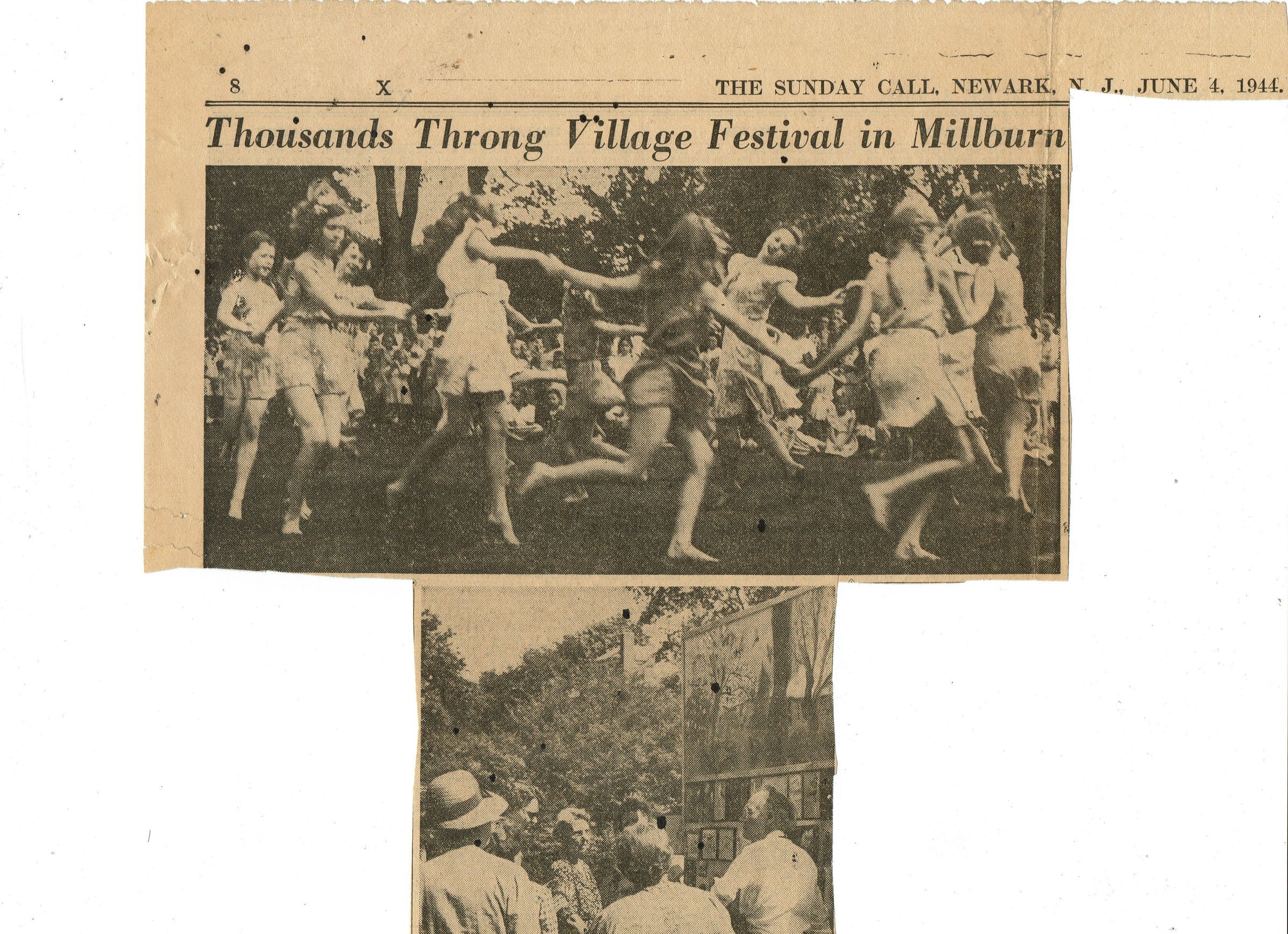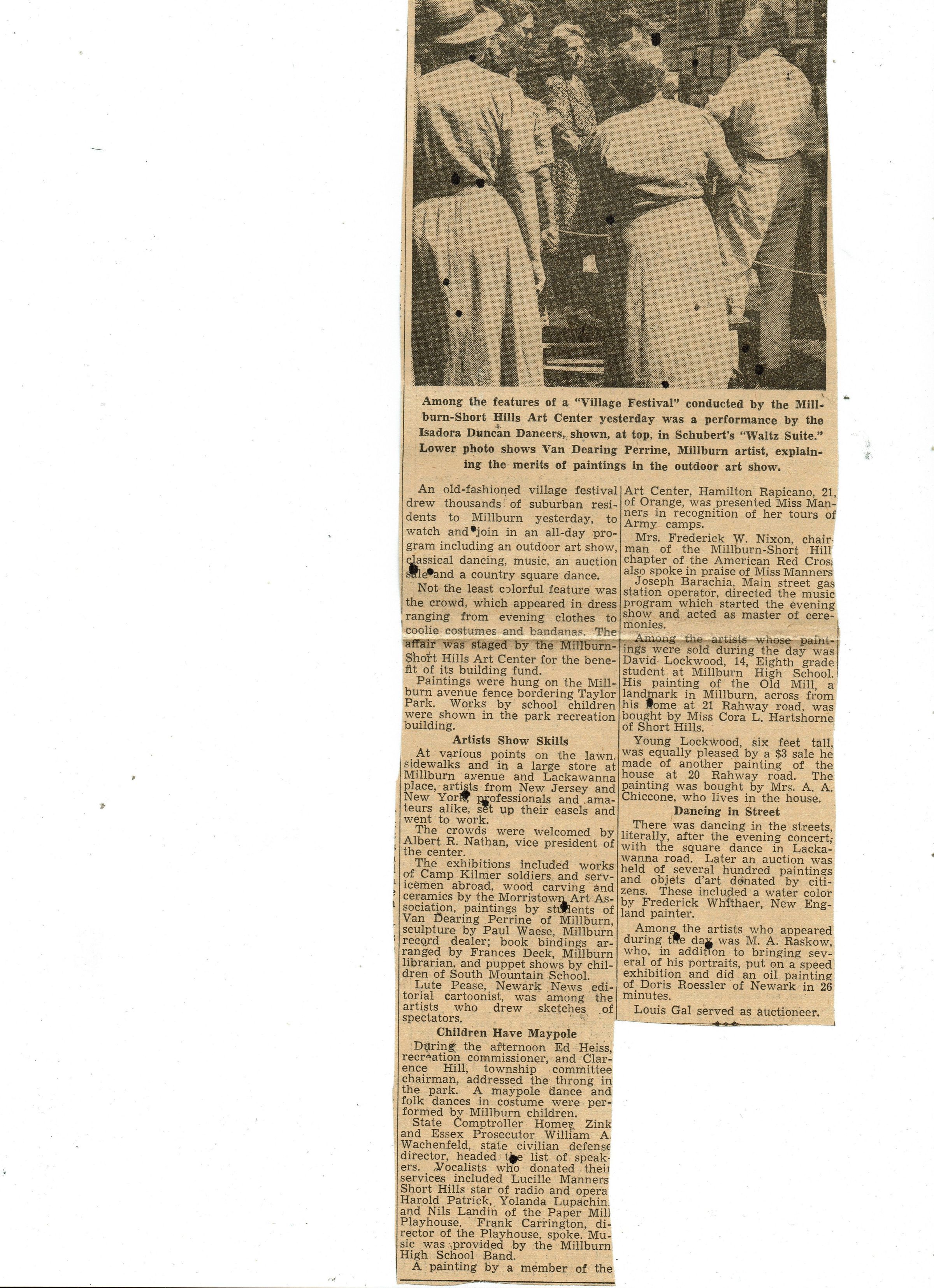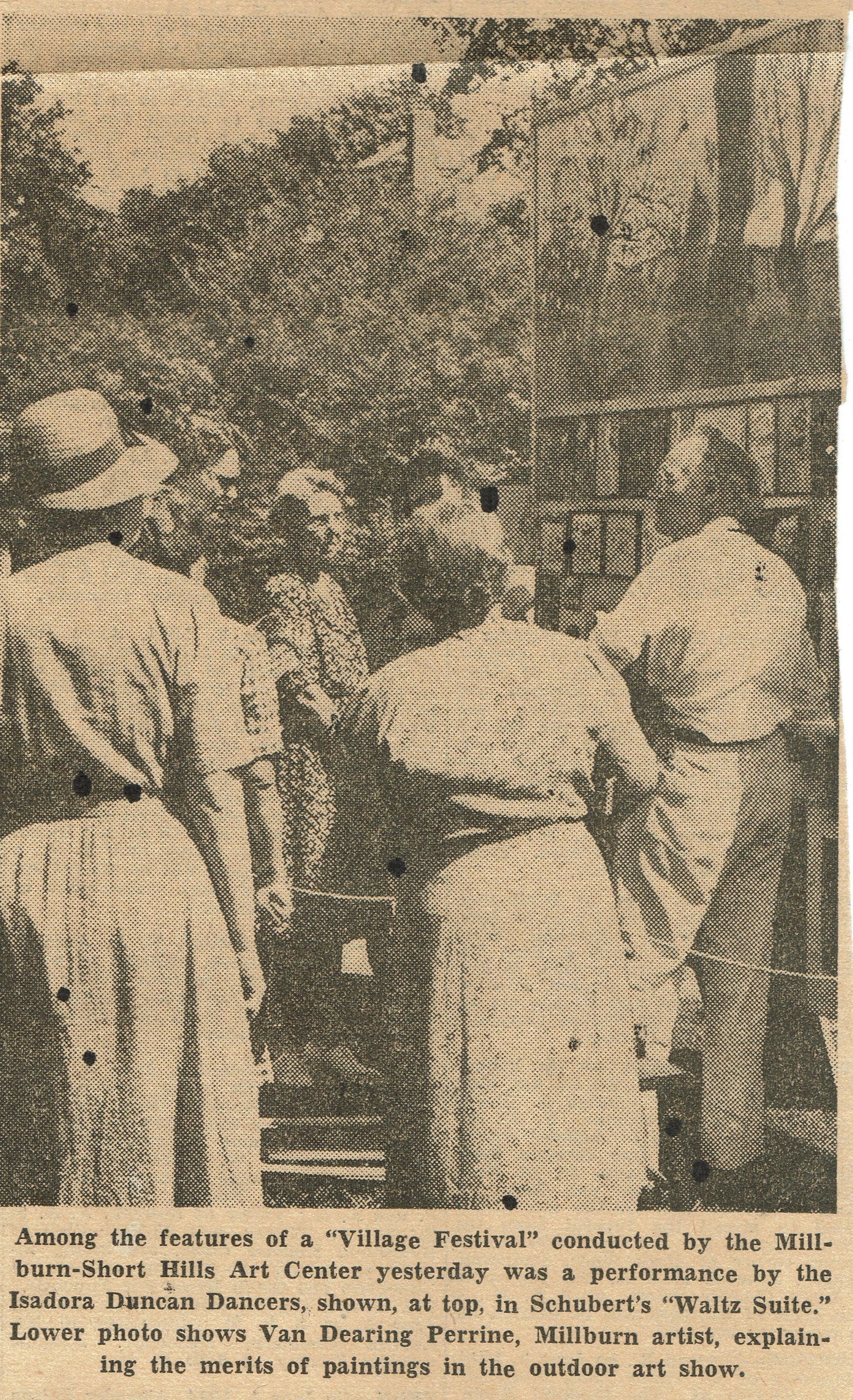Thousands Throng Village Festival in Millburn article about the June 3, 1944 Village Festival in Taylor Park, sponsored by the Millburn & Short Hills Arts Center, which appeared in the June 4, 1944 edition of The Sunday Call, Newark, N.J. Article highlights performances by the Isadora Duncan Dancers and Van Dearing Perrine's art exhibition.Collection