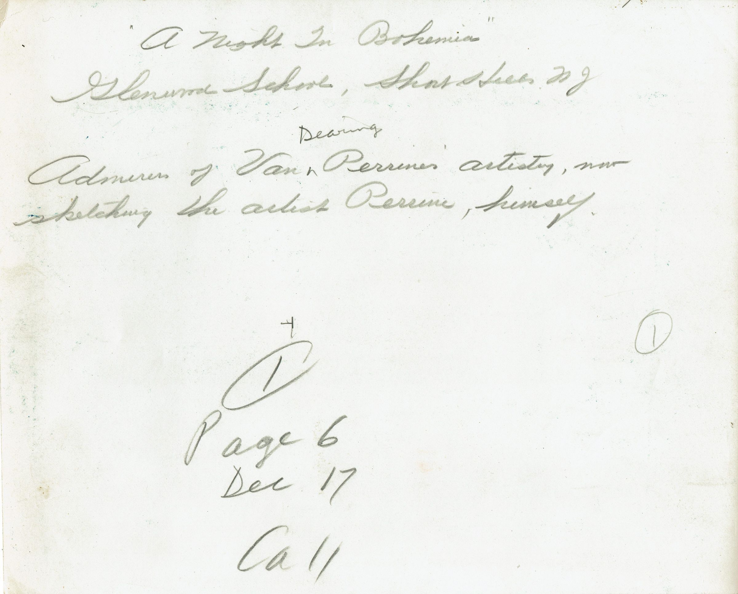 Caption on verso reads: "A Night in Bohemia, Glenwood School, Short Hills, N.J. Admirers of Van Dearing Perrine's artistry, now sketching the artist, Perrine, himself. Page 6, December 17 Call" (Probably for the Newark Evening Call).Collection
