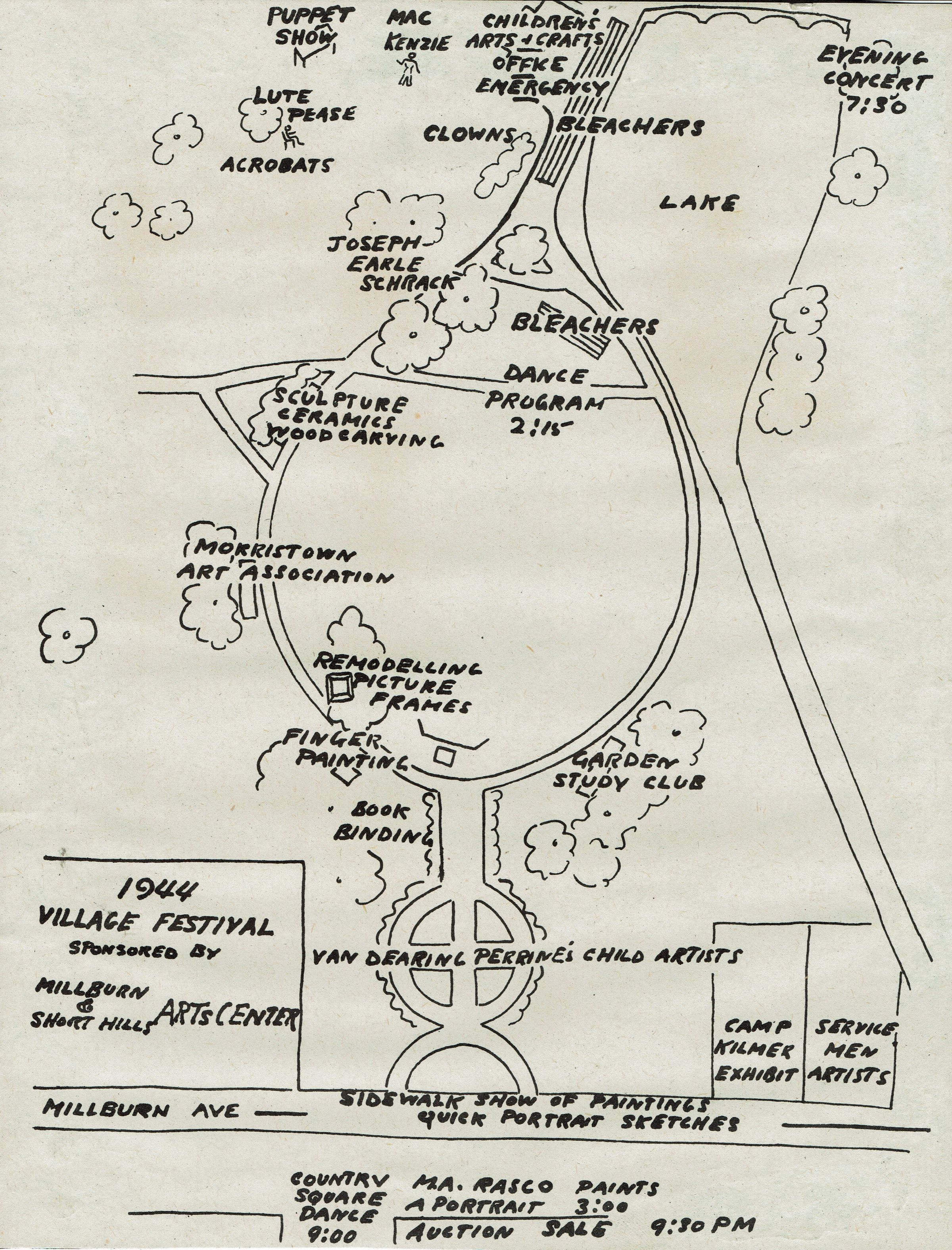 Map of the activities for the 1944 Village Festival Sponsored by the Millburn & Short Hills Arts Center on June 3, 1944 in Taylor Park. Among the events shown on the map are: Van Dearing Perrine's exhibition of works by child artists, Joseph Earle Schrack's exhibition and M.A. Rasco's portrait painting demonstration.Collection