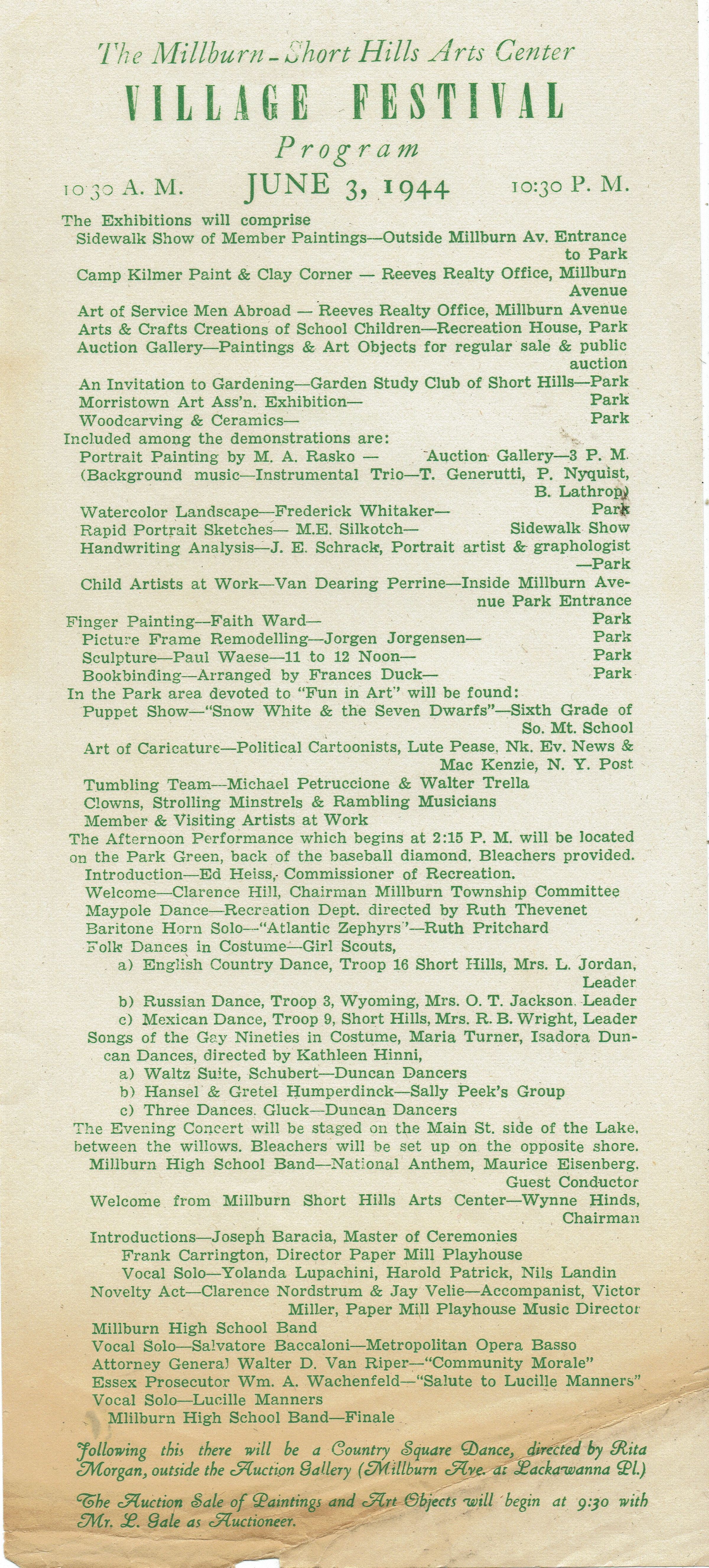 Single page program for the Millburn-Short Hills Arts Center Village Festival, June 3, 1944. Program details the times and events taking place in Taylor Park and Millburn Avenue.Collection