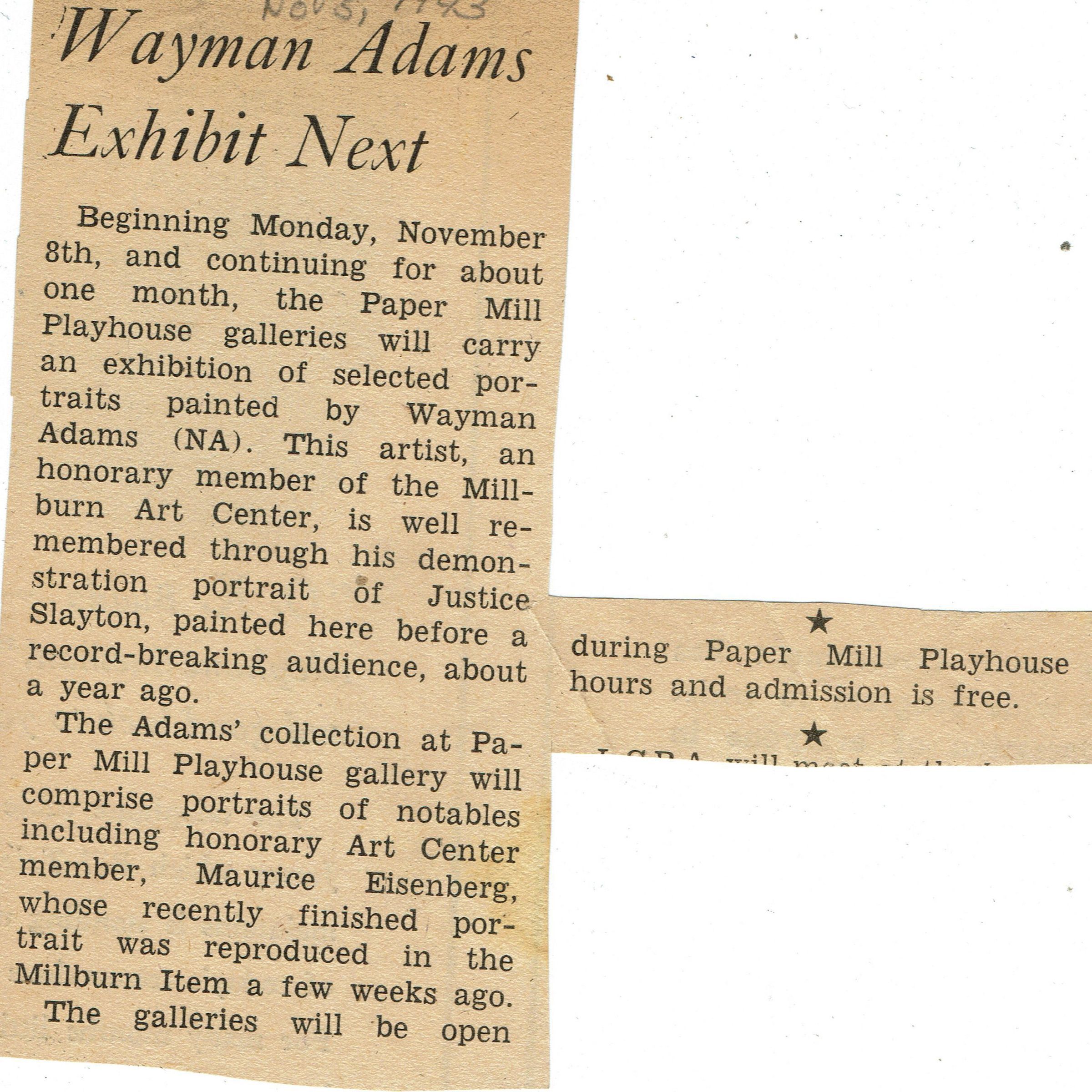 Millburn Art Center: Wayman Adams Newspaper Clippings, 1943