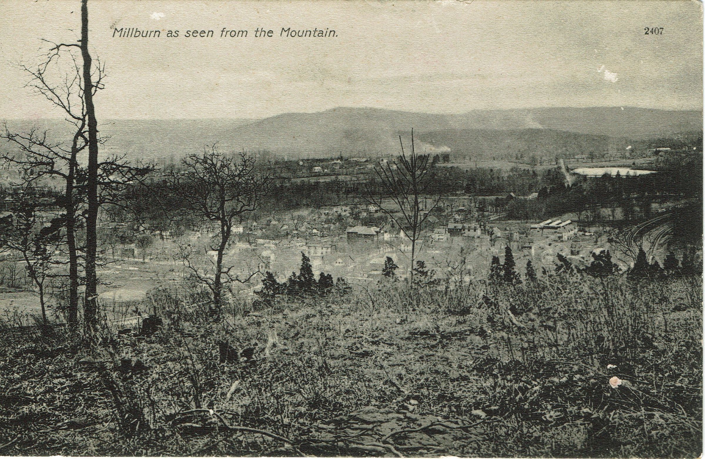 Postally unused photographic postcard of Millburn as seen from the Mountain. Visible in the middle ground, slightly right of center is the Washington School on Millburn Avenue, the First Baptist Church on Millburn Avenue and Spring Street and the Pitcher and Manda greenhouses are shown further to the right.Collection
