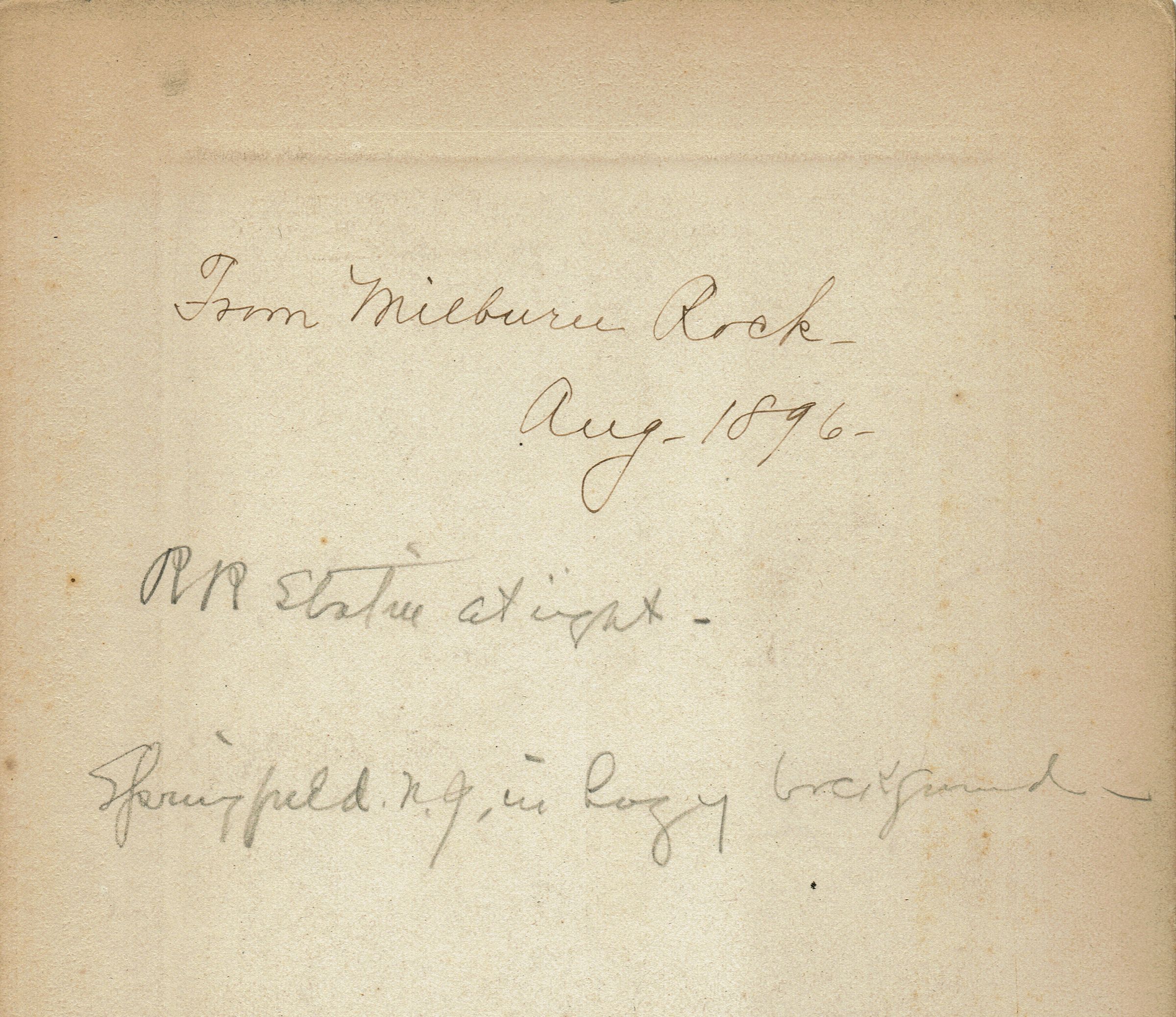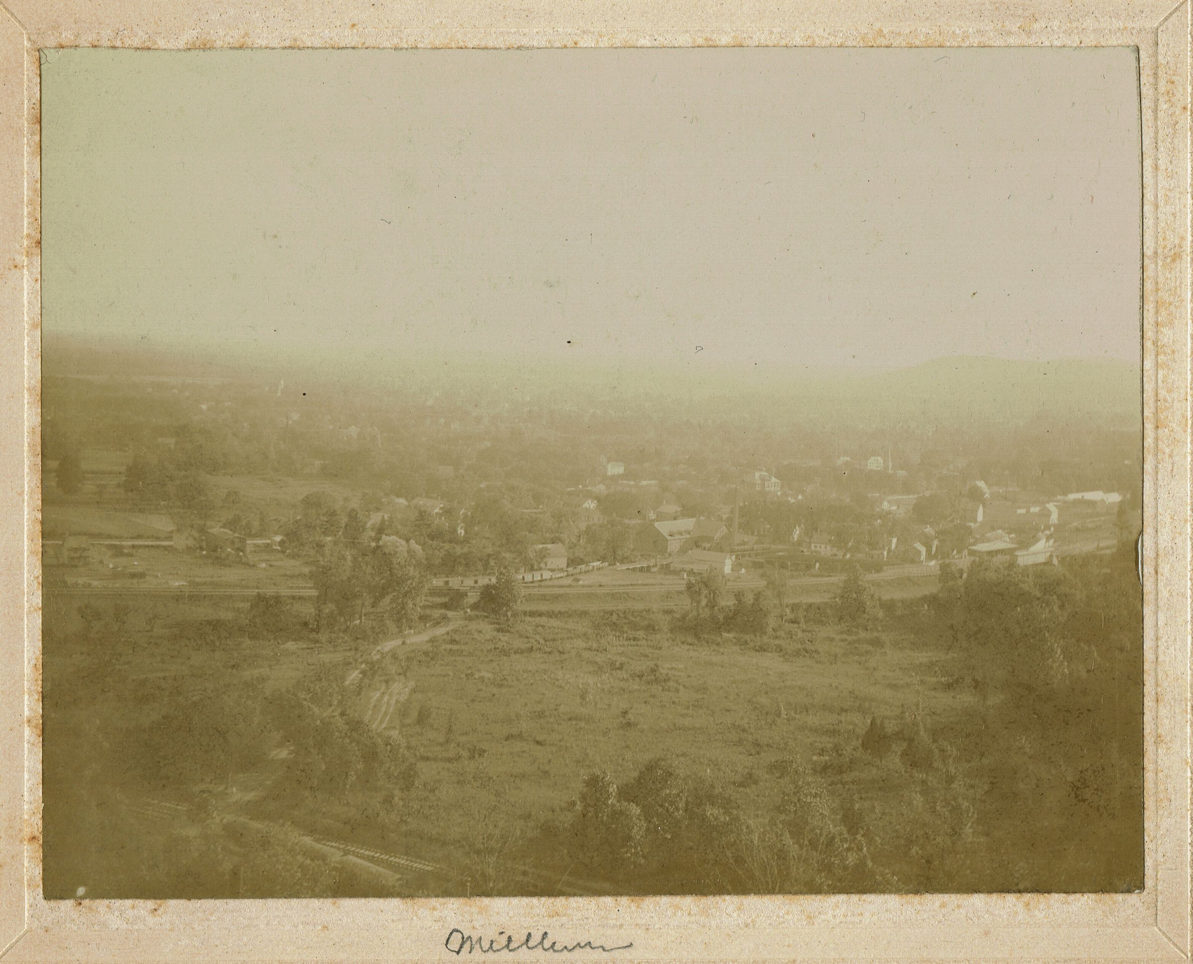 Inscription on back of photograph reads: "From Millburn Rock, 1896. Railroad Station at right. Springfield, New Jersey in the hazy background." Millburn Rock refers to Washington Rock, in what is now the South Mountain Reservation.Collection
