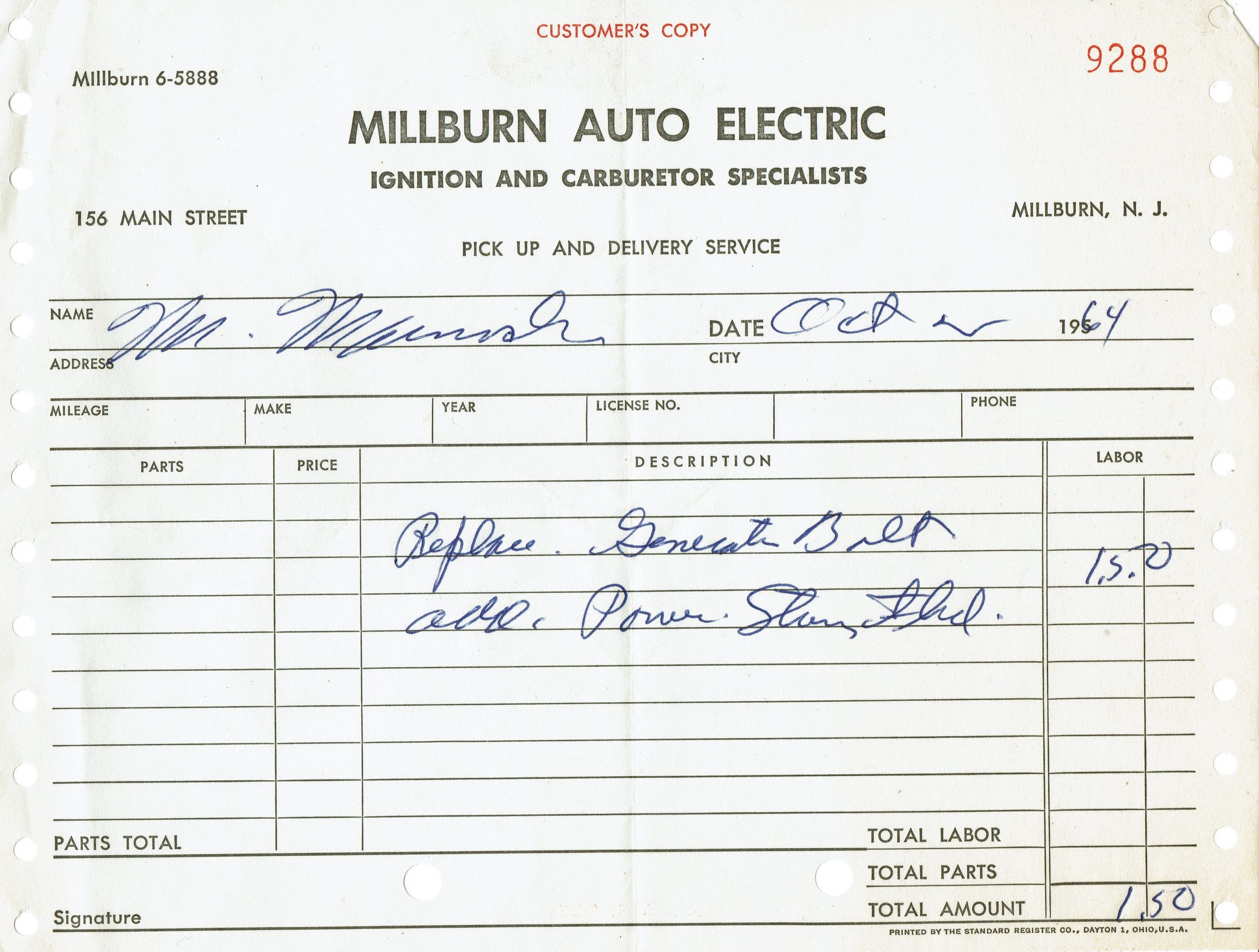 Millburn Auto Electric: Receipt, 1964Entry/Object ID