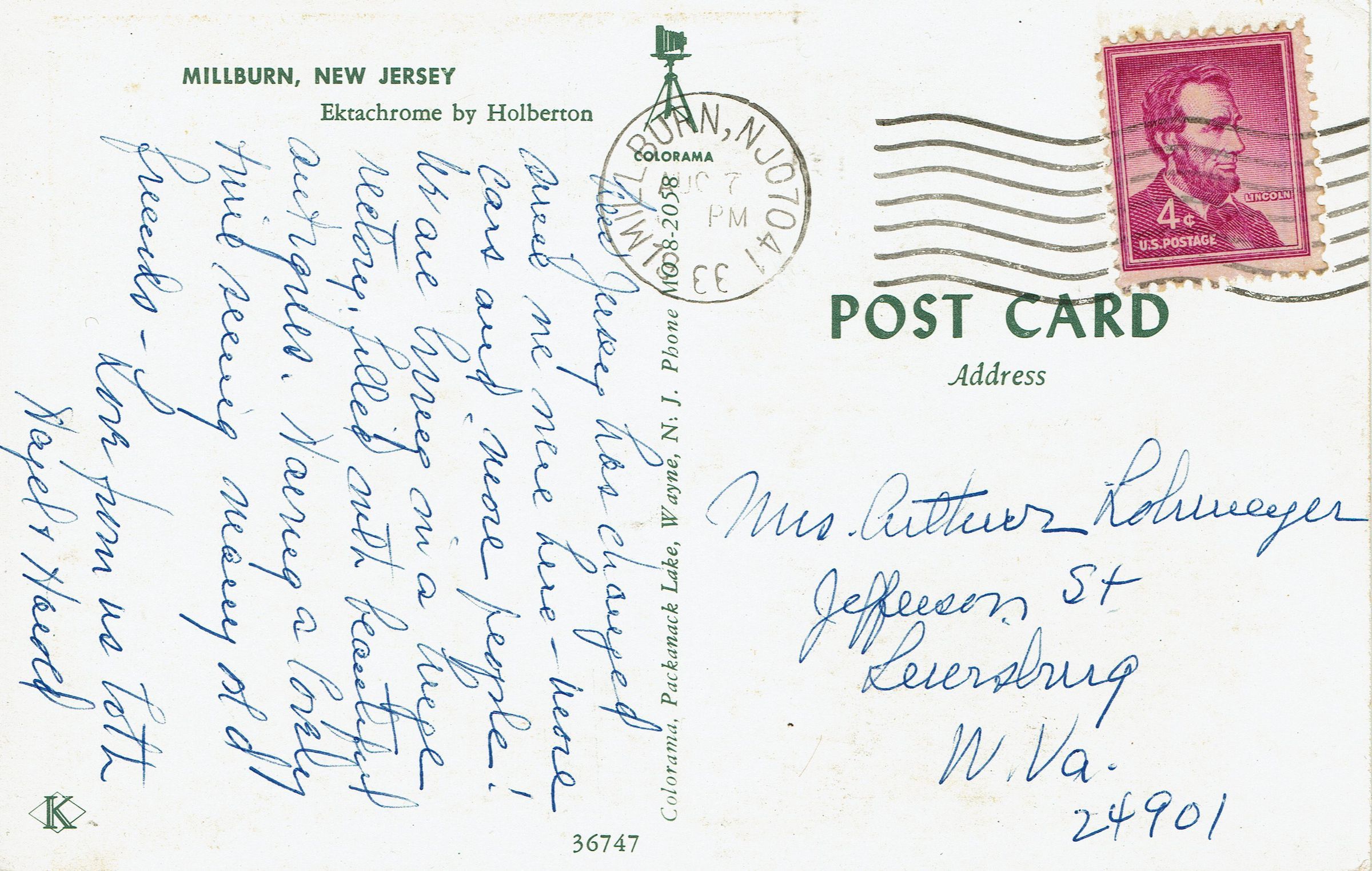 Postally used, color photographic postcard of Millburn avenue looking towards Lackawanna Place. Marks Brothers Radio Sales Store at 325-327 Millburn Avenue is in the center of the image.Collection
