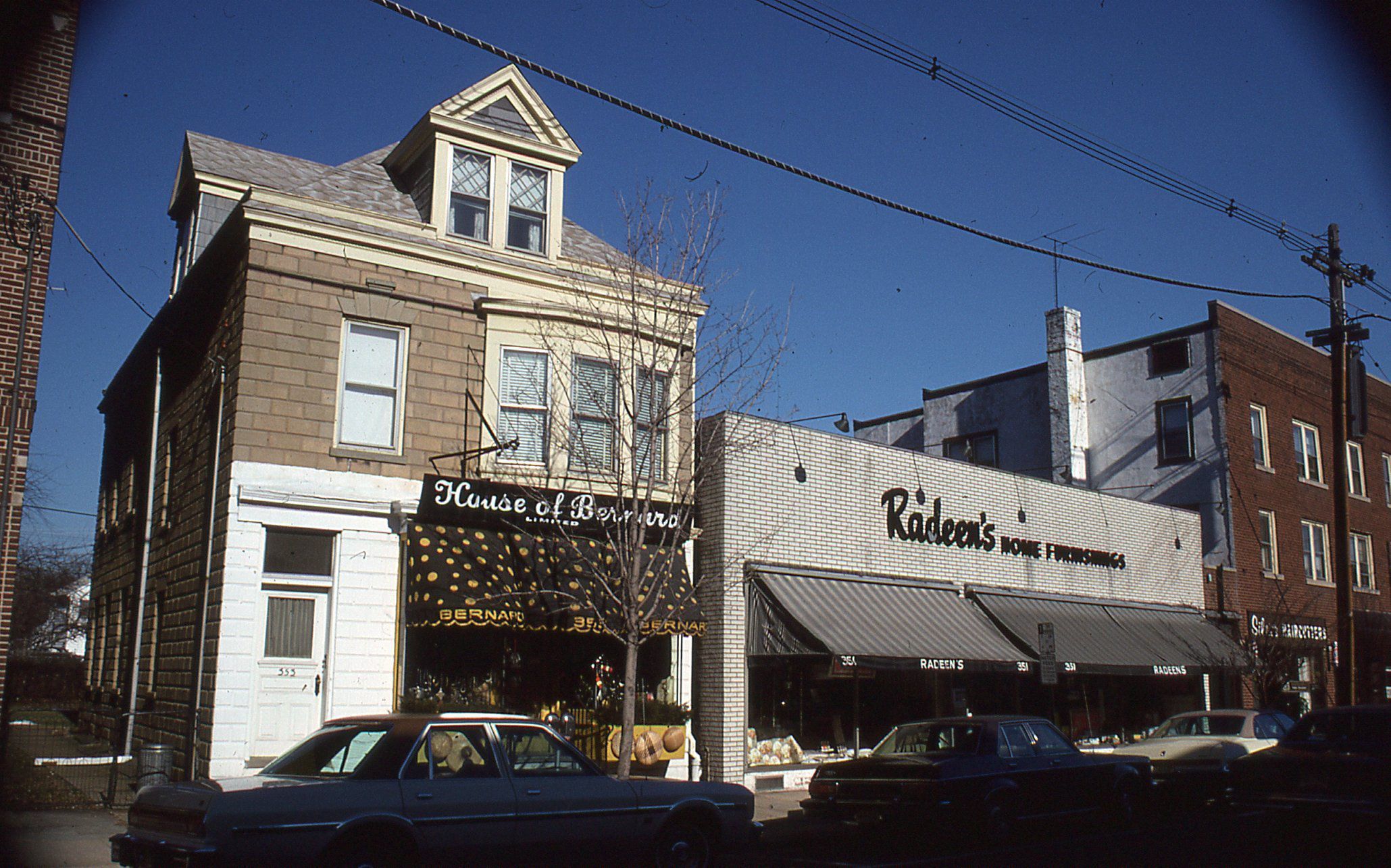 Photograph of Millburn Avenue showing numbers 353-351 Millburn Avenue taken by Owen Lampe in January 1979. At that time, the locations were occupied by the "House of Bernard" and "Radeen's Home Furnishings." House of Bernard opened on October 12, 1961 and operated in Millburn for 26 years.Photograph Details