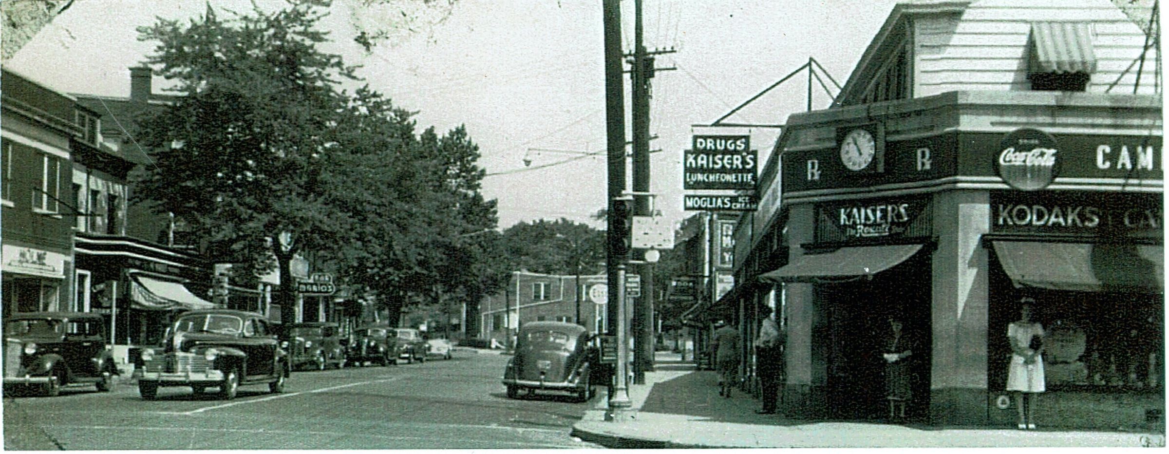 Photograph of the corner of Millburn Avenue and Main Street with Kaiser's Drugs at 341 Millburn Avenue. Photo from the early 1940s.Dimensions