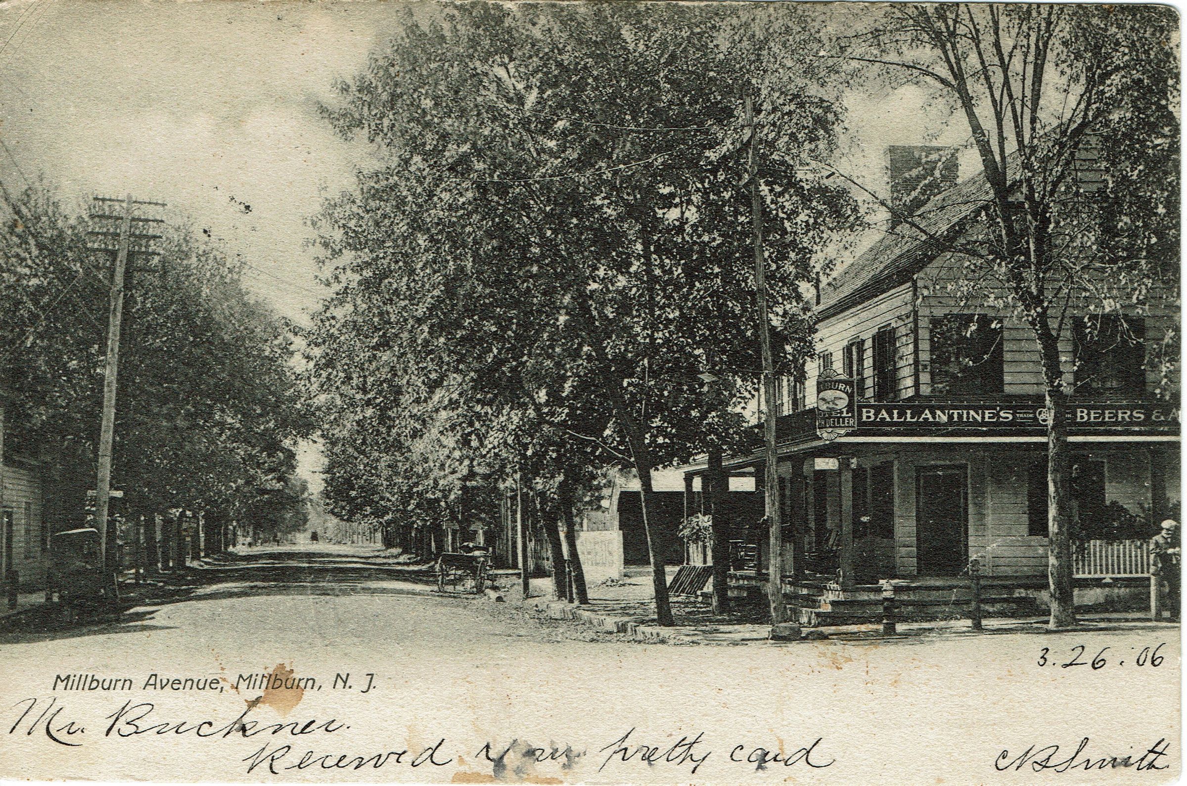 Postcard of image #432, from the centennial collection looking east on Millburn, Avenue. The building in the right side, with the Ballantine's Beer Sign is the Millburn Hotel. The store located at what is now 344 Millburn Avenue, was run by the McCollum Brothers (William E., William W. and William H. McCollum) and sold groceries and dry goods.