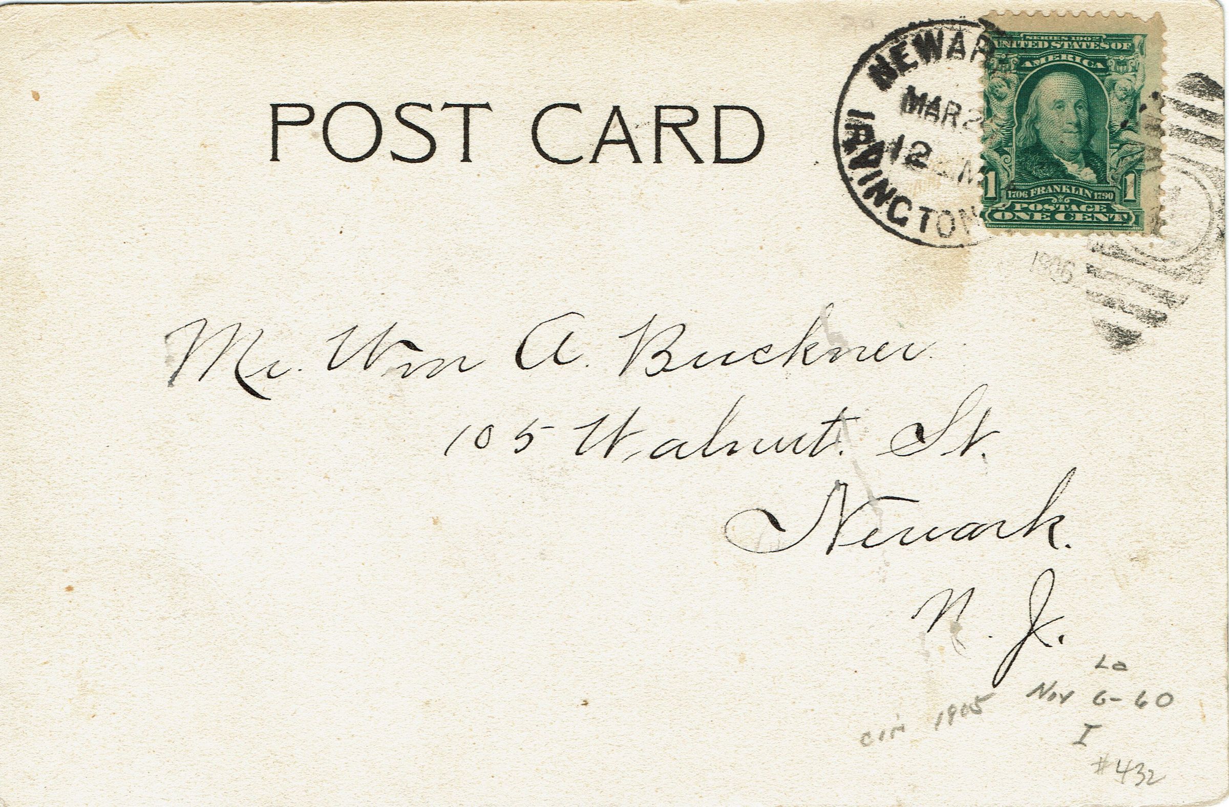 Postmarked Newark, March 1906. Addressed to Mr. William A. Buckner, 105 Walnut Street, Newark, NJ. Message on front of card reads: Mr. Buckner-received your pretty card. 3.26.06 N. (?) Smith.Collection