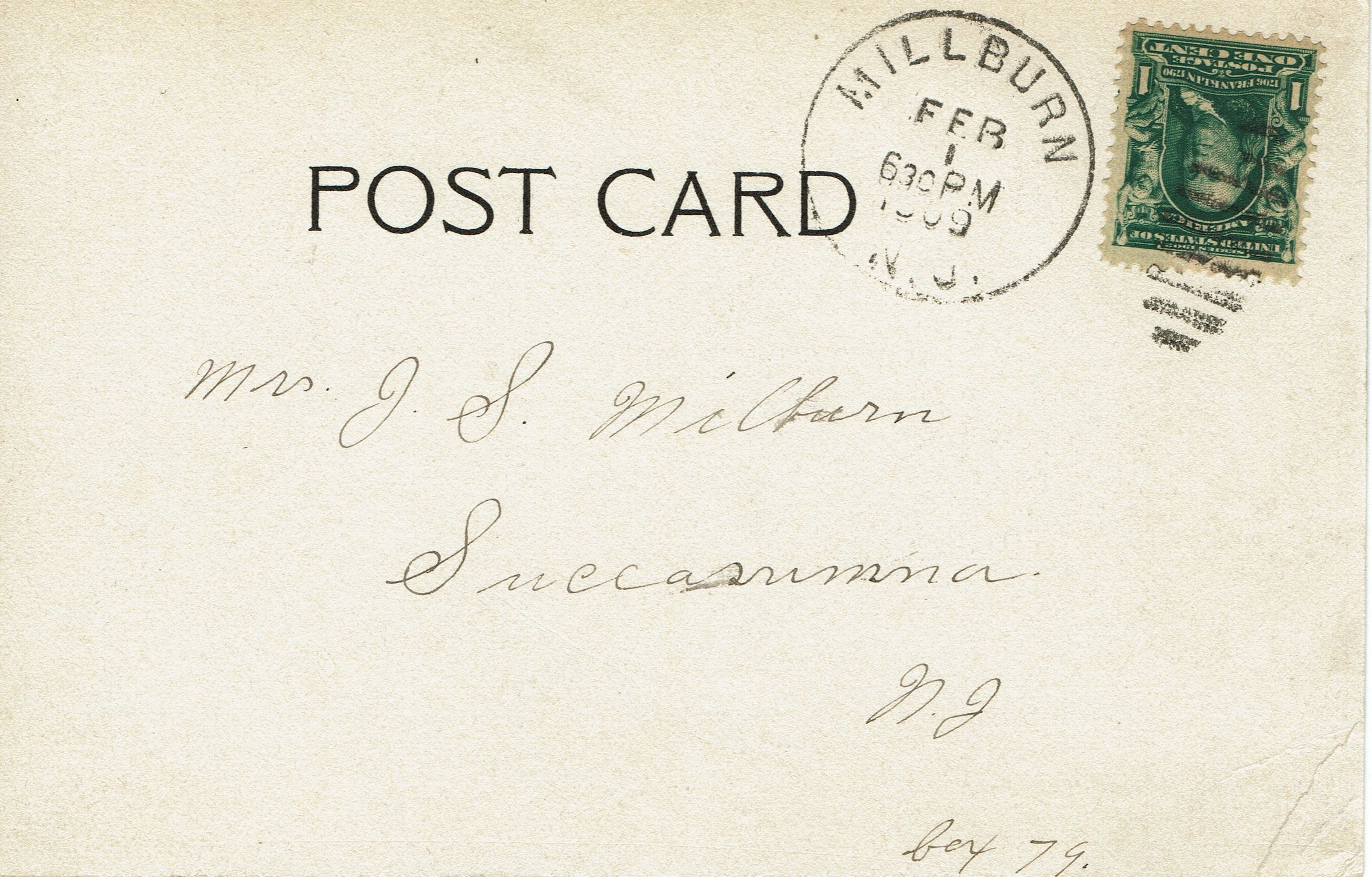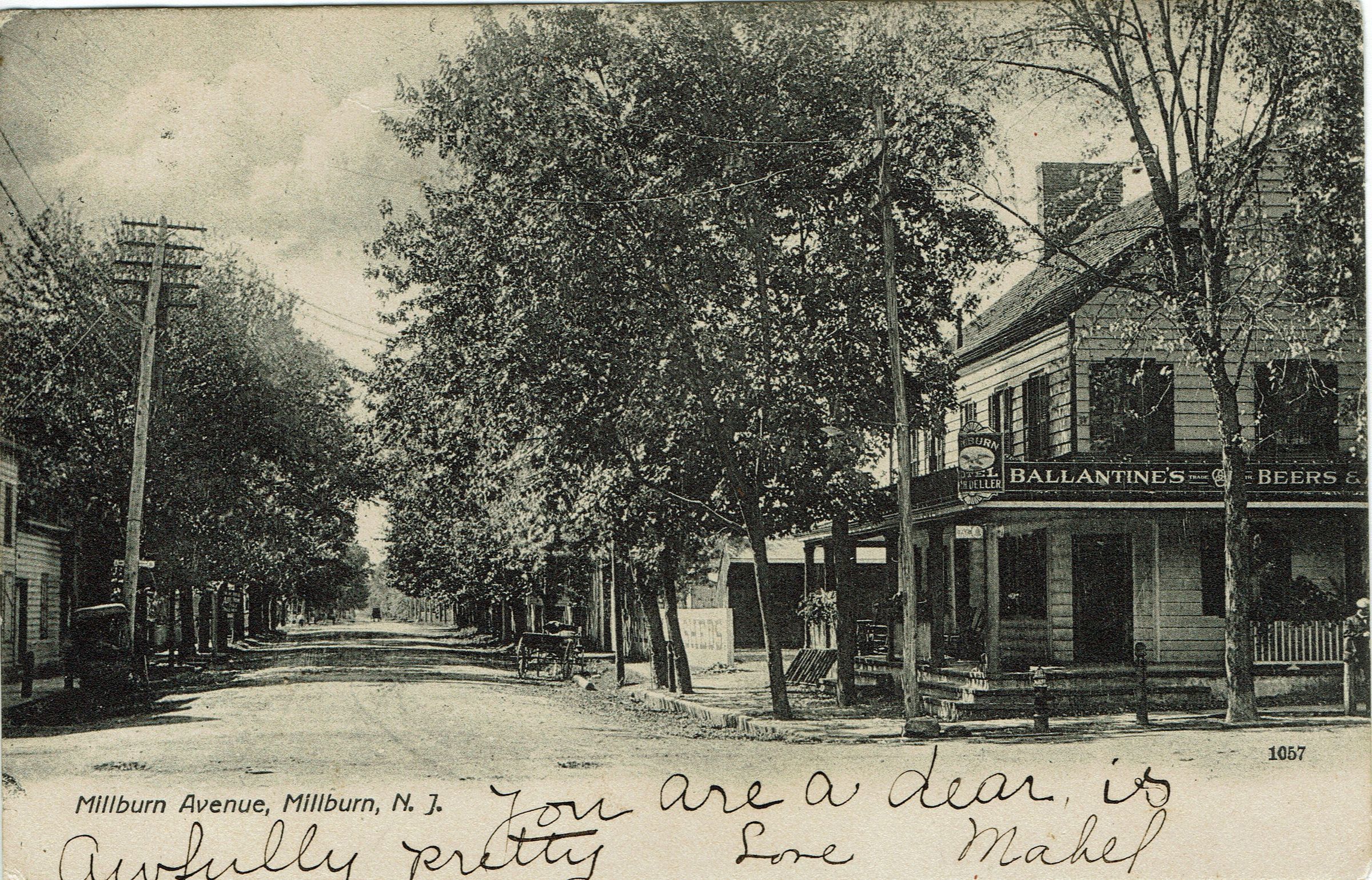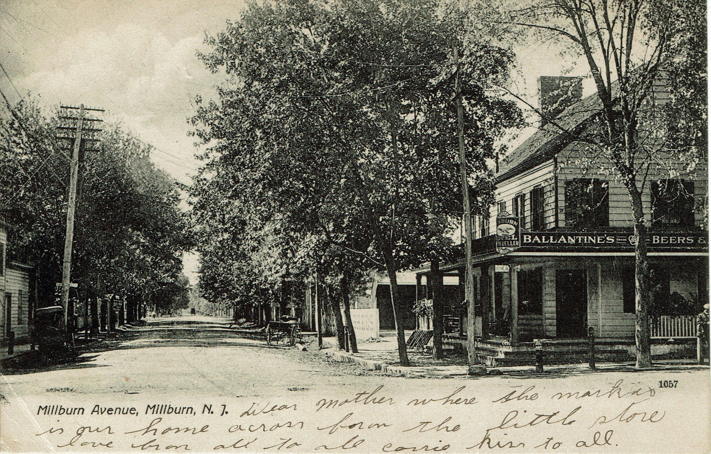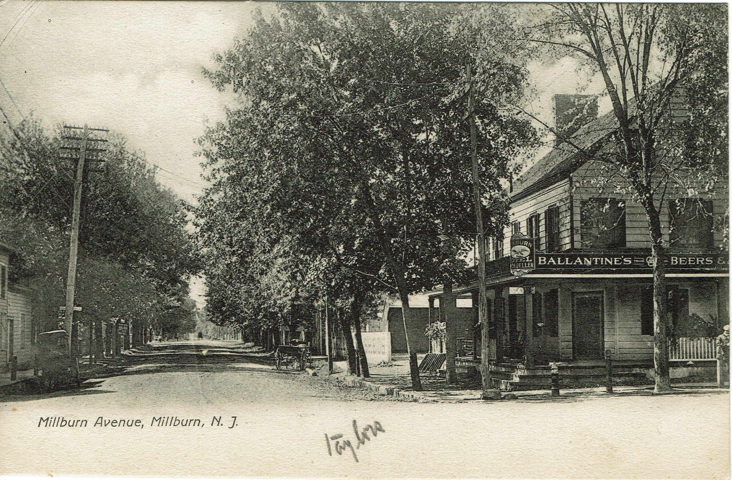 3 B&W photographic postcards of the intersection of Millburn Avenue and Main Street. Two postally used, postmarked Millburn, November 19, 1905 and February 1, 1909. Third postcard is unused. The building in the right side, with the Ballantine's Beer Sign is the Millburn Hotel. The store located at what is now 344 Millburn Avenue, was run by the McCollum Brothers (William E., William W. and William H. McCollum) and sold groceries and dry goods.Collection