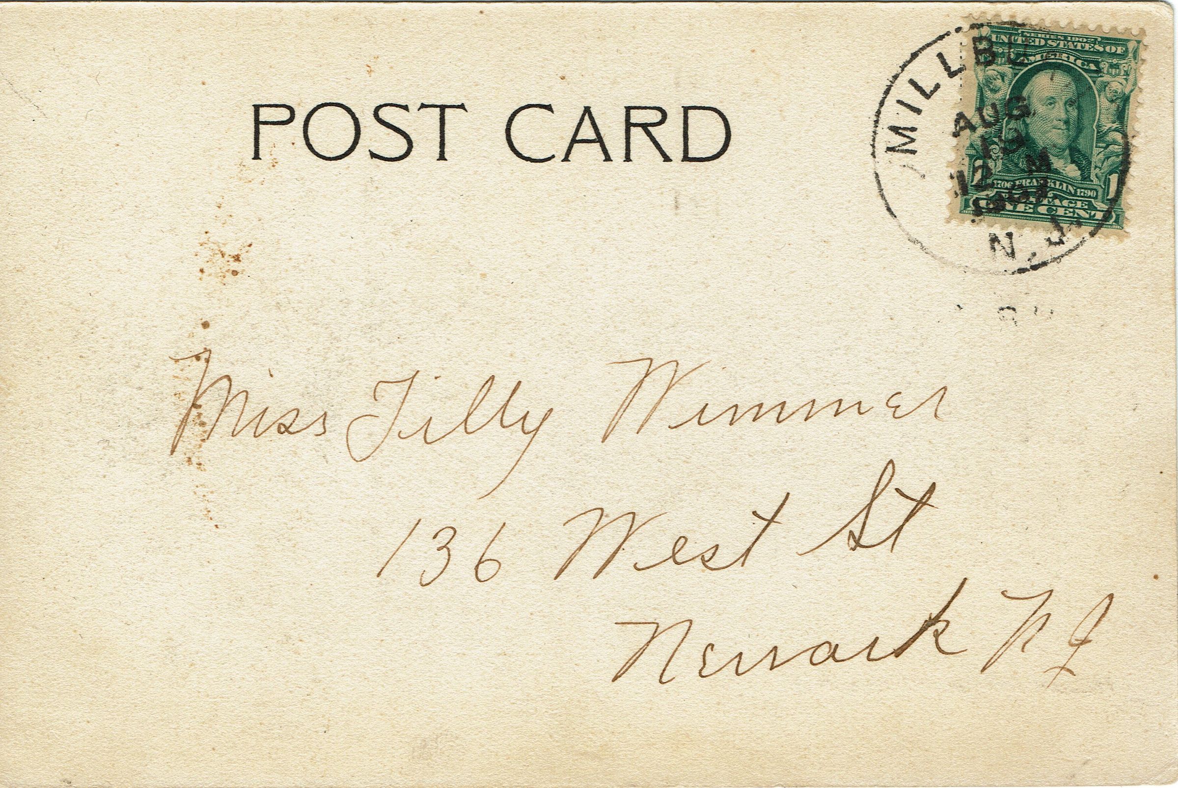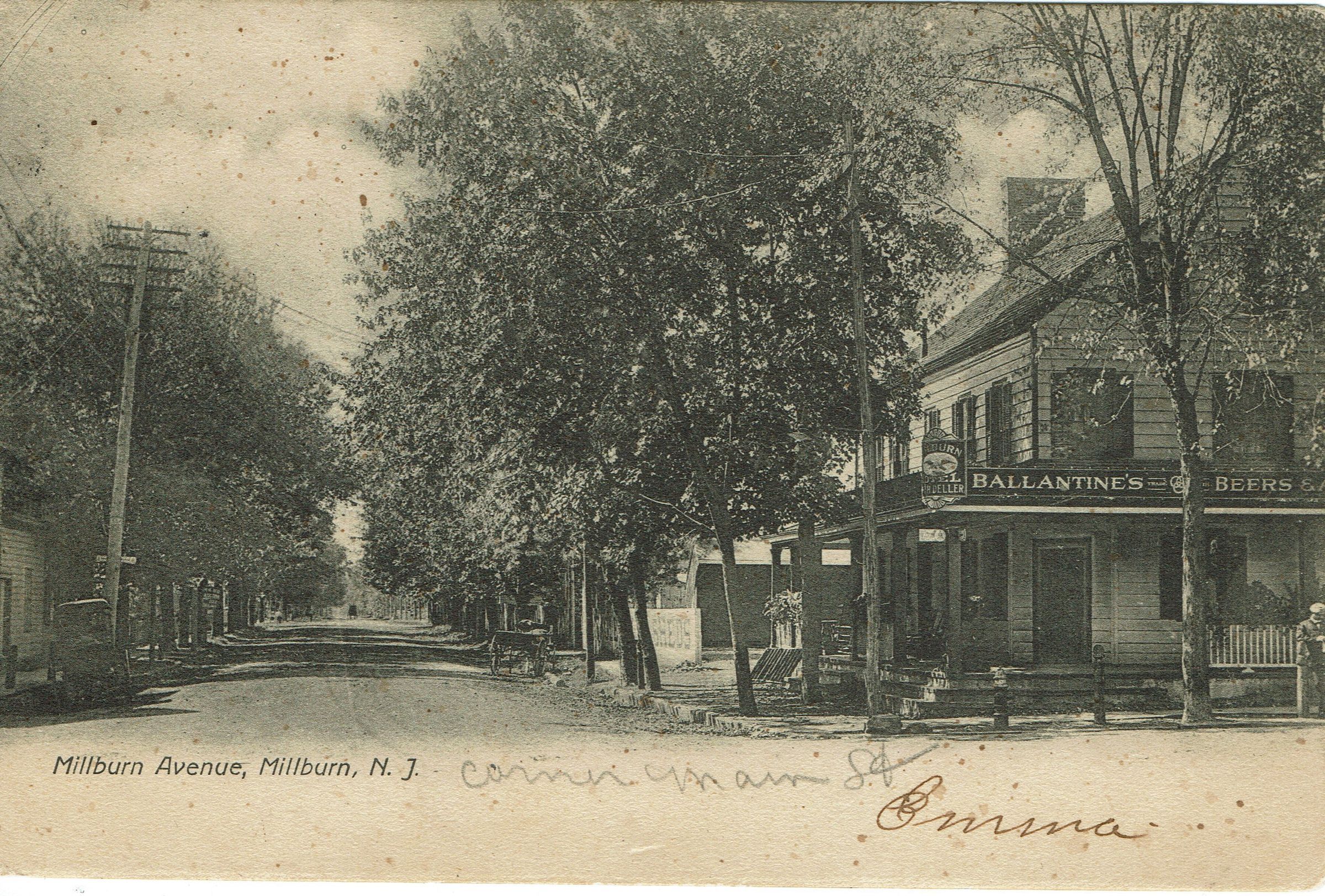 Postally used B&W photographic postcard of the corner of Millburn Avenue and Main Street. Postmarked Millburn, August 19, 190 (?) 12 M. Addressed to Miss Tilly Wimmer, 136 West Street, Newark, NJ. Writing on front of card reads corner Main street, signed Emma (Wimmer).The building in the right side, with the Ballantine's Beer Sign is the Millburn Hotel. The store located at what is now 344 Millburn Avenue, was run by the McCollum Brothers (William E., William W. and William H. McCollum) and sold groceries and dry goods.Collection