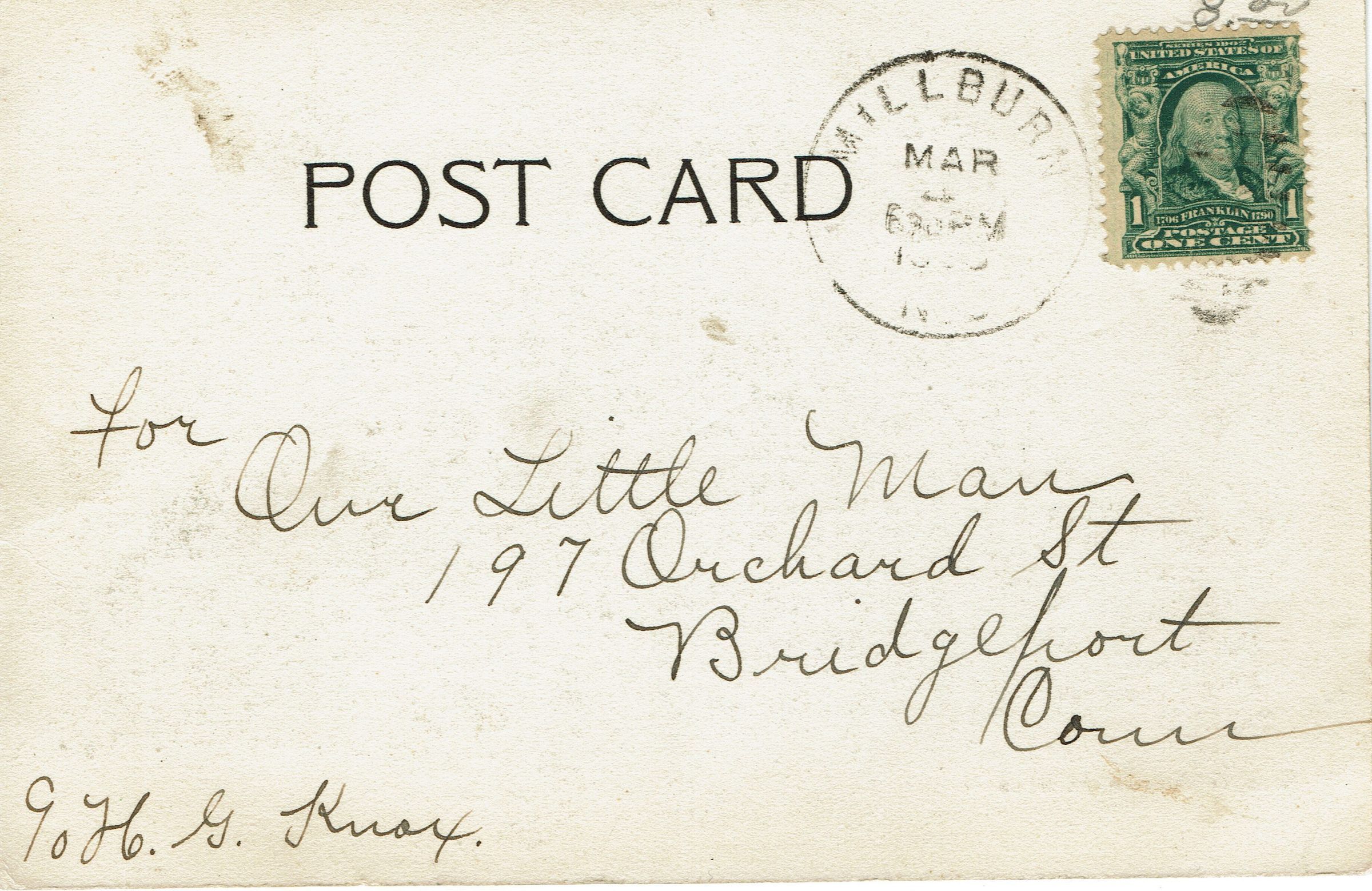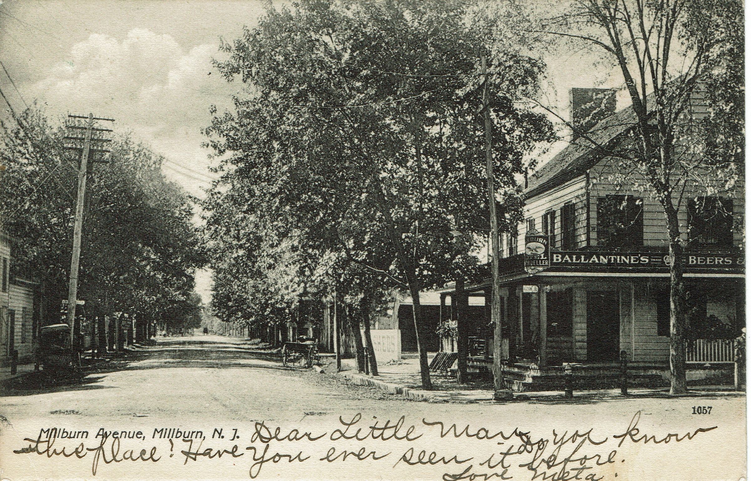 Used postcard of image #432, from the centennial collection looking east on Millburn, Avenue addressed to "Our Little Man" 197 Orchard Street, Bridgeport Connecticut. c/o H. G. Knox. Postmarked Millburn March 4 (year is unclear) 6:30 pm. Contains message on front of card: "Dear Little Man, Do you know the place? Have you ever seen it before. Love Meta."