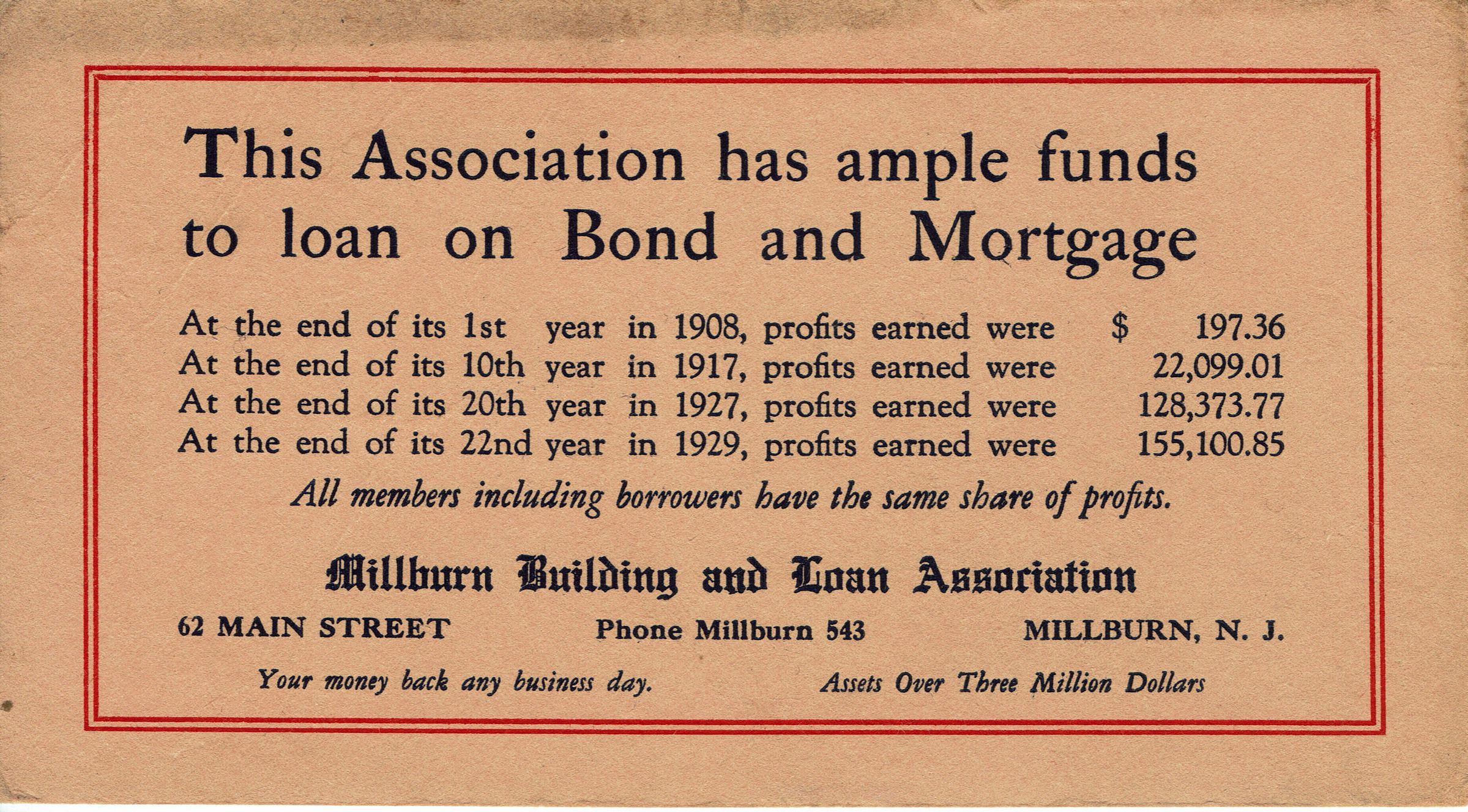 Advertisement featuring the profits earned by the Millburn Building and Loan Association from 1908 to 1929.Acquisition