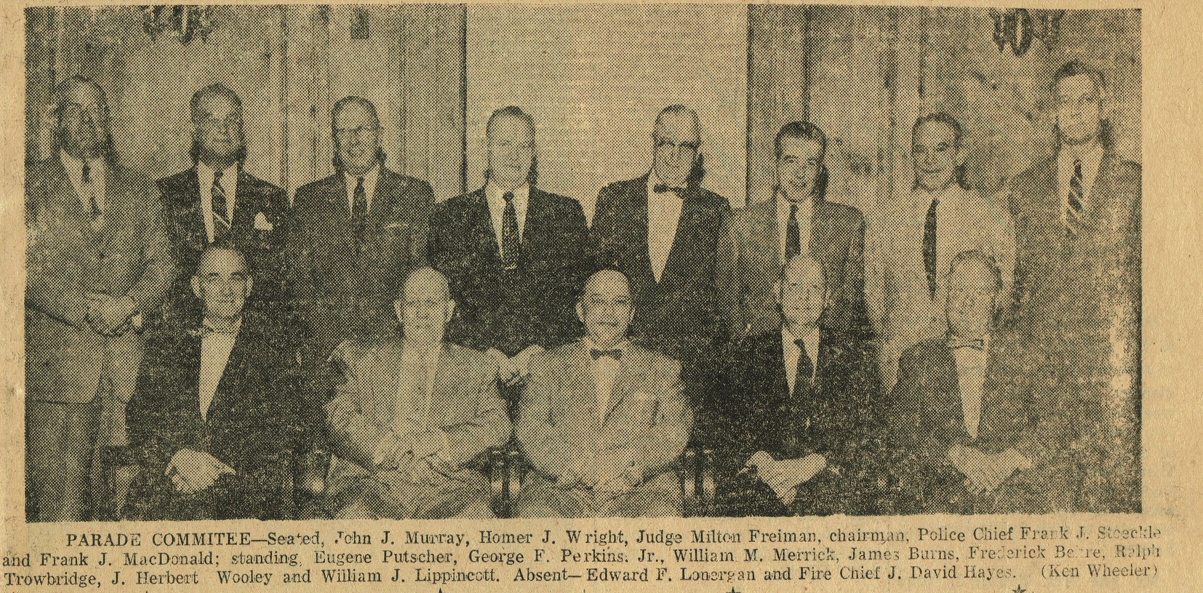 Photograph from the Item of the Millburn Centennial Parade Committee. Members pictured are: John J. Murray, Homer J. Wright, Judge Milton Freiman (Chairman), Police Chief Frank J. Stoeckle, Frank J. MacDonald, Eugene Putscher, George F. Perkins, Jr., William M. Merrick, James Burns, Frederick Behre, Ralph Trowbridge, J. Herbert Wooley and William J. Lippincott.Acquisition