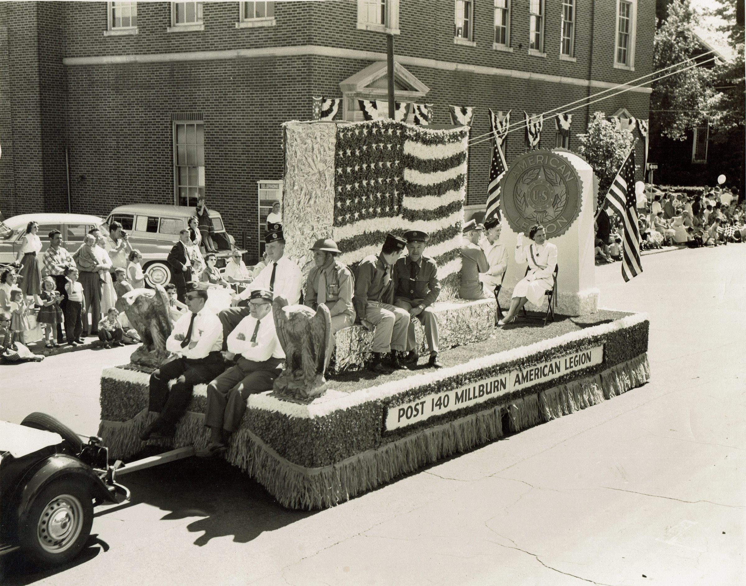 B&W photograph of Post 140 American Legion's float in Millburn's 1957 Centennial parade on Millburn Avenue taken by Ken Wheeler, 73Main Street, Millburn. Float is decorated with an American flag and the American Legion seal. Members of the Legion are seated on the float.Acquisition