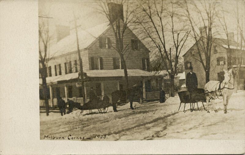 Real-photo postcard view of Millburn center. Handwritten and printed on the front of the card is "Milburn Corner-1900." Card is postally unused; light overall foxing; corners bumped; minor edgewear on all edges.Dimensions