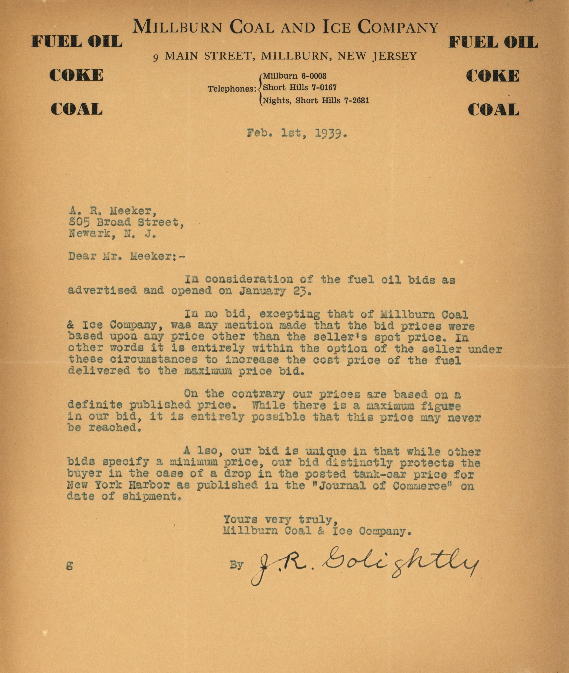 Typed and signed letter on company letterhead from Joshua R. Golightly, Manager of the Millburn Coal and Ice Company, 9 Main Street, Millburn to Township Committee member A. Ross Meeker dated February 1, 1939 regarding the company's fuel oil bid made on January 23, 1939.Acquisition
