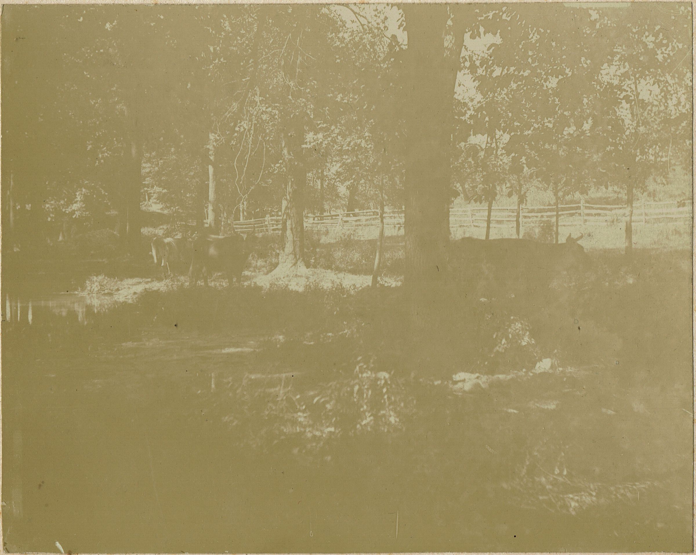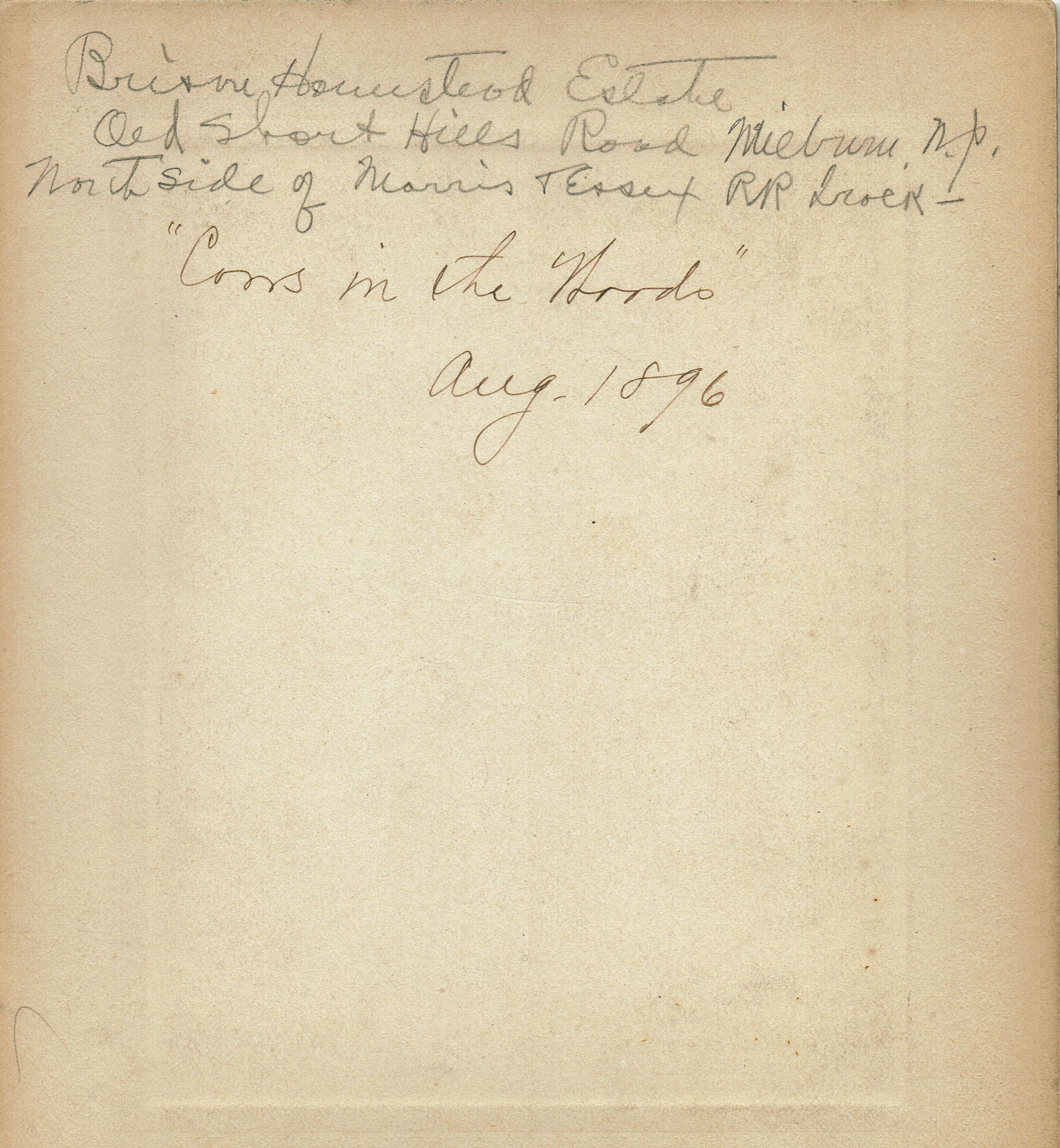 Inscription on verso of photograph reads: "Brison Homestead Estate, Old Short Hills road, Millburn, N.J. North side of Morris & Essex Railroad Branch. Cows in the Woods, August 1896."Collection