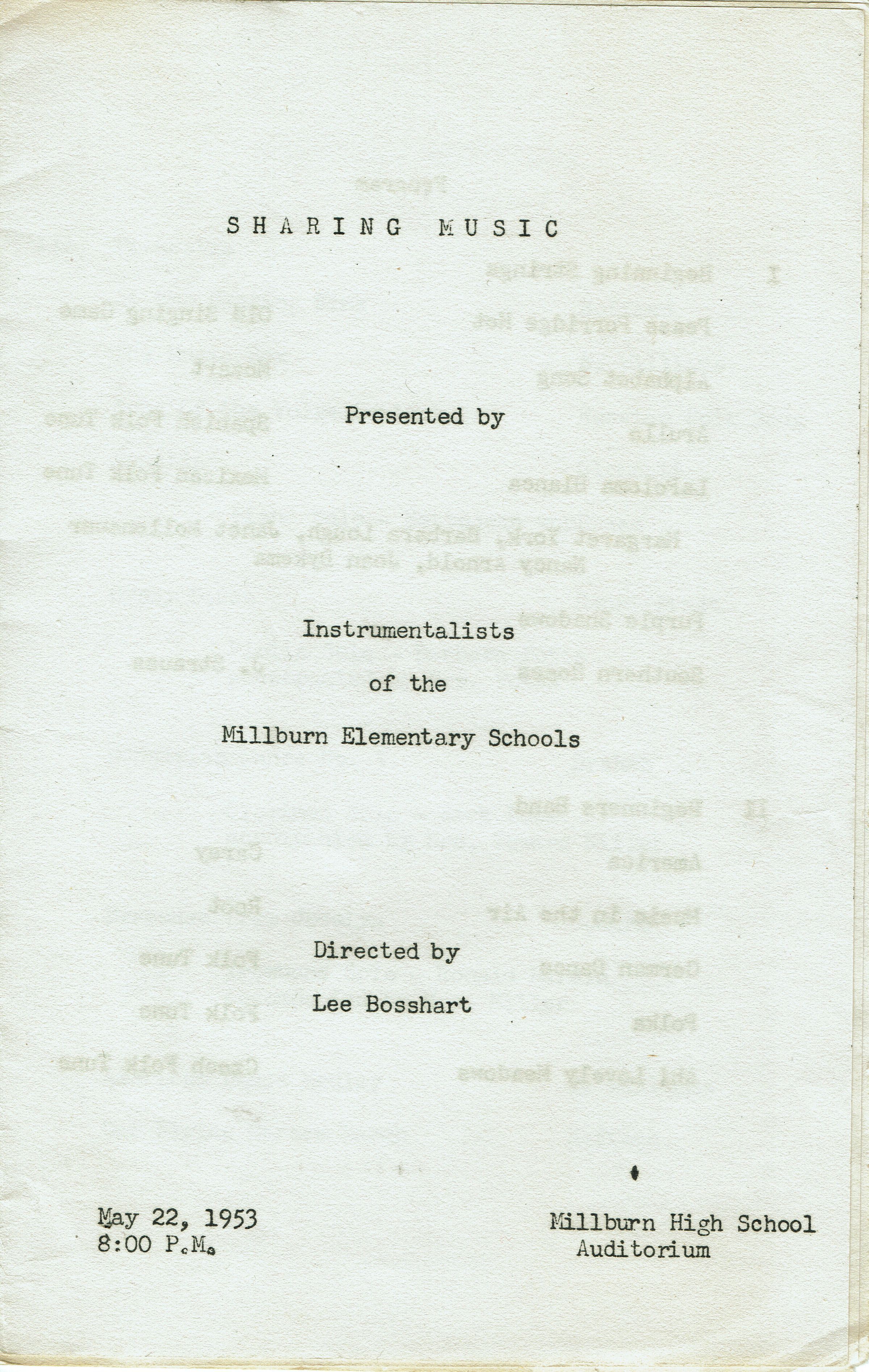 Sharing Music program featuring students from the Millburn Elementary Schools on May 22, 1953 at the Millburn High School Auditorium. Beginner Strings, Beginner Band and Orchestra students listed in the 10 page program.Collection