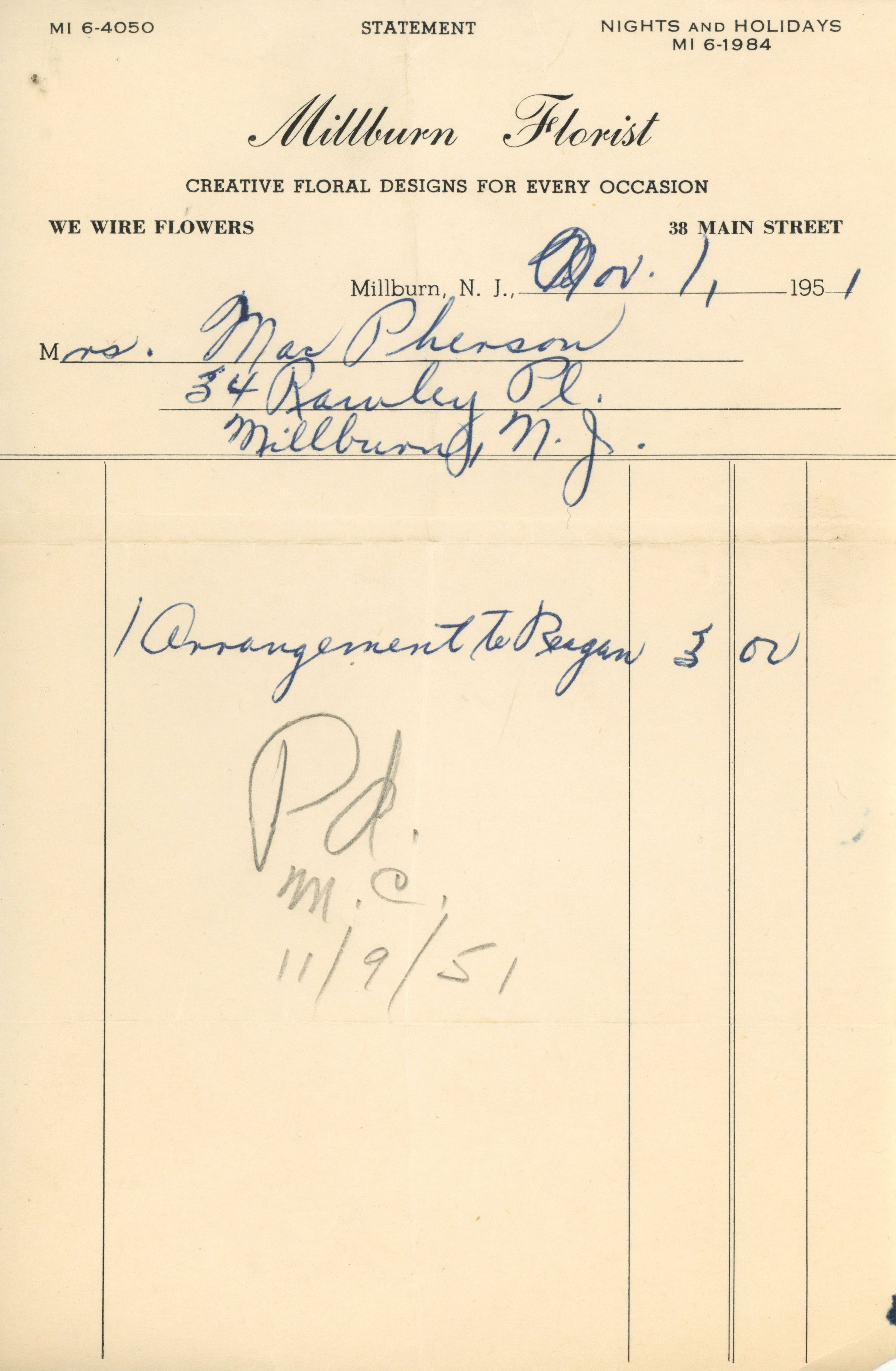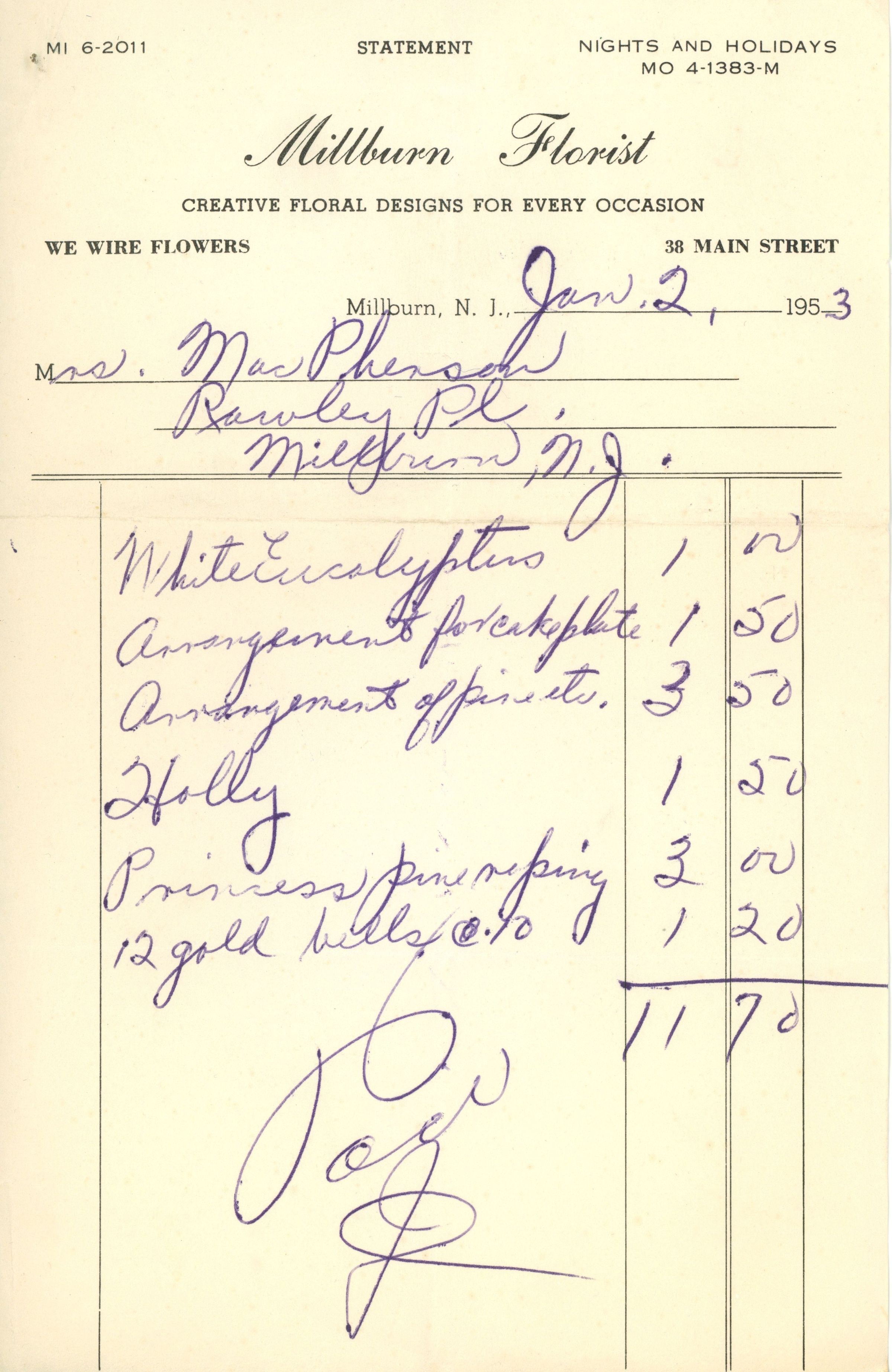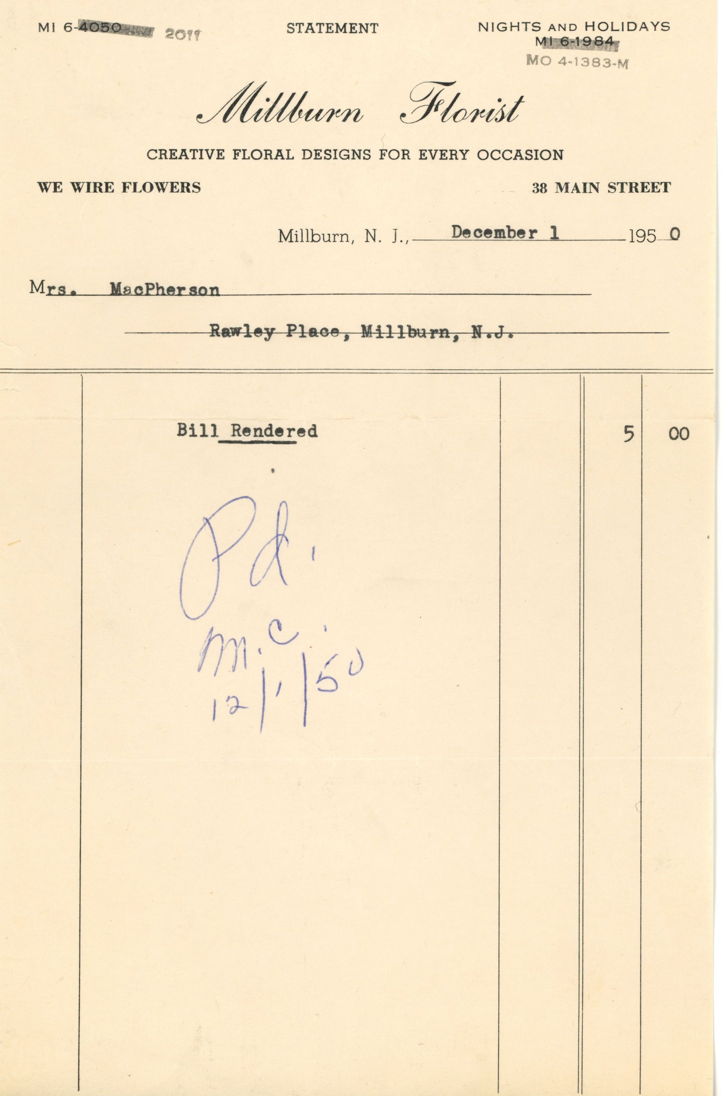Receipts (5) from Millburn Florist, 38 Main Street, Millburn, NJ from December 1950-January 1953 for flowers purchased by Mrs. Elwood MacPherson, Rawley Place, Millburn.Collection