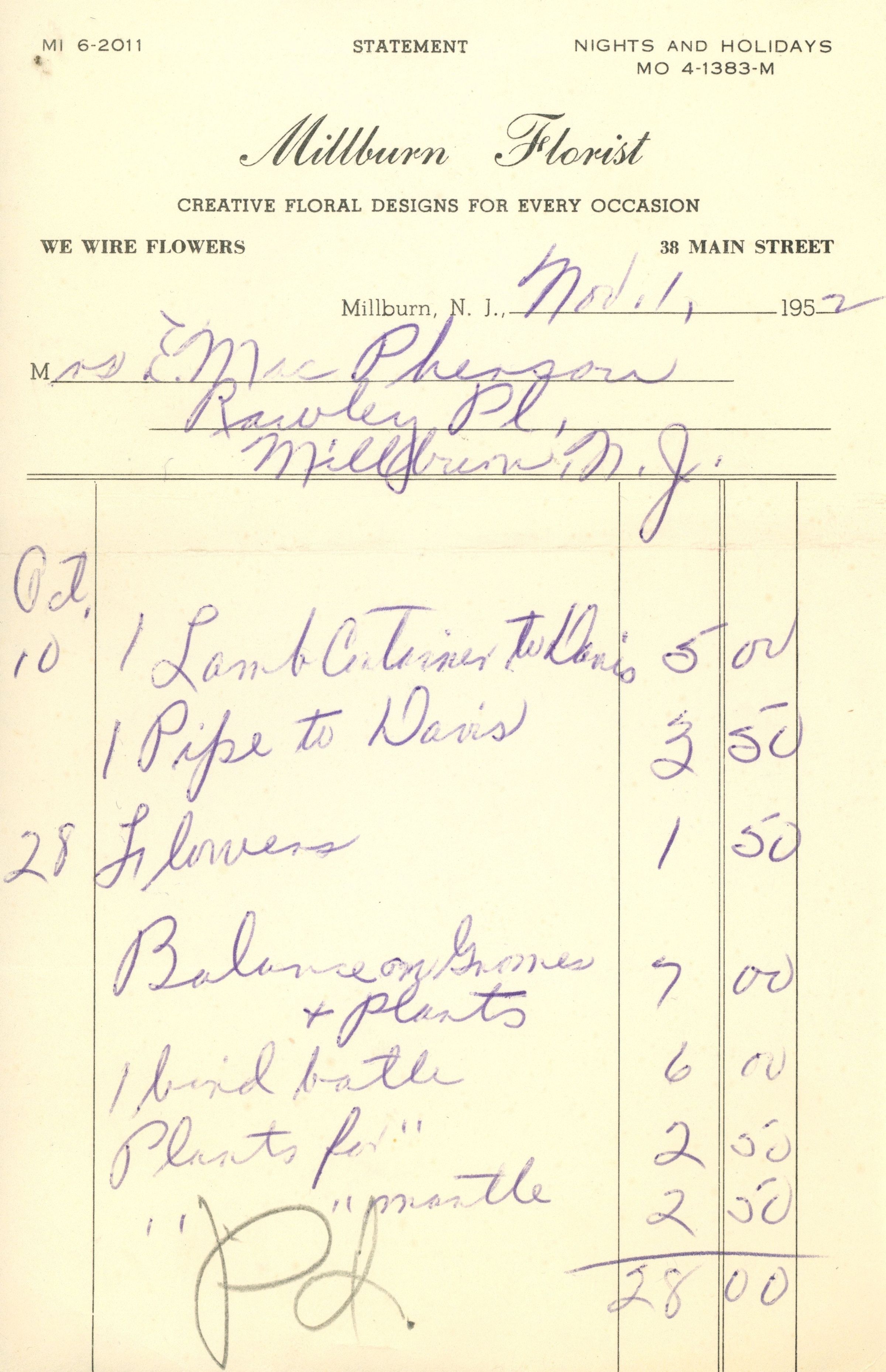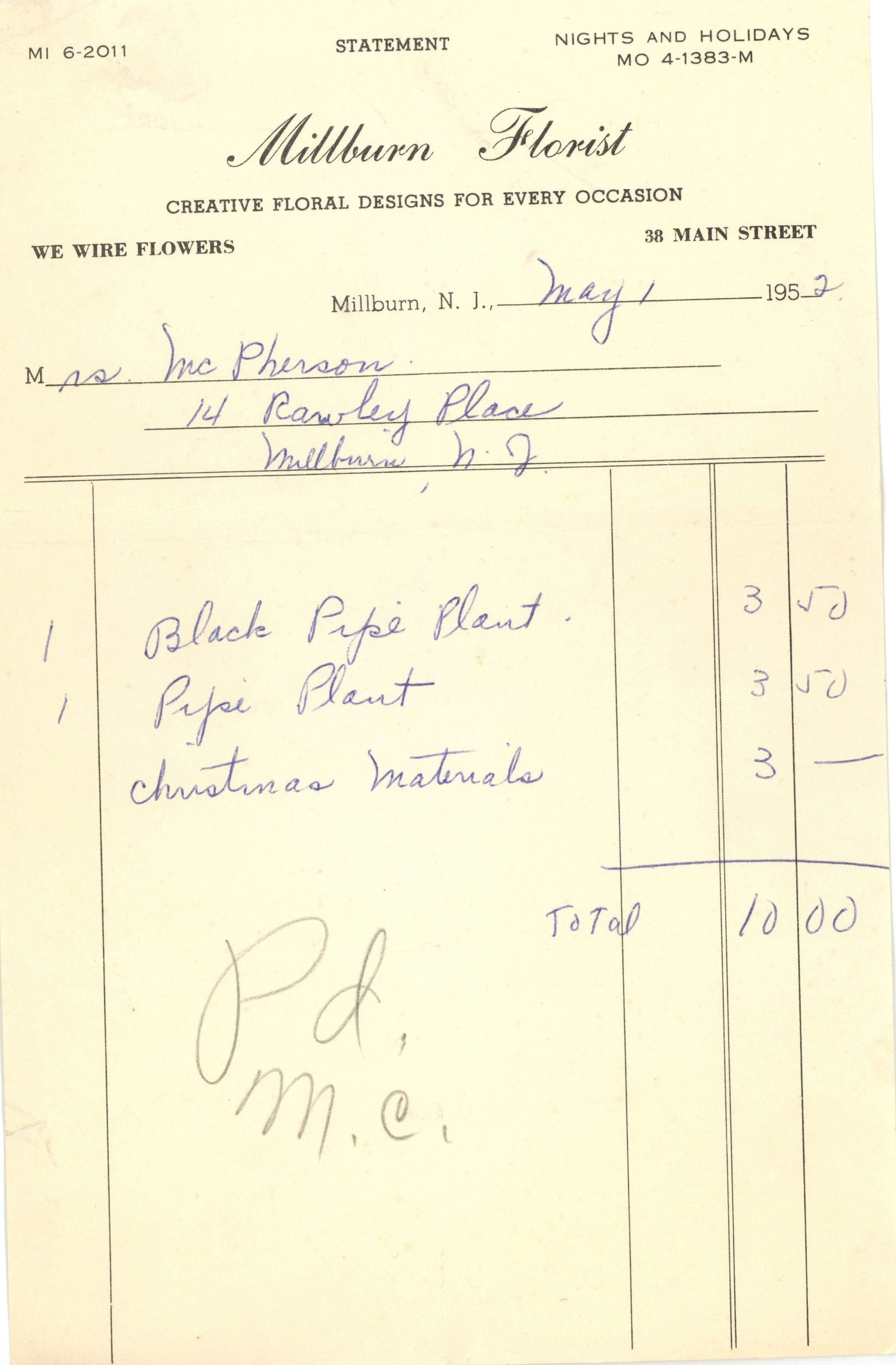 Millburn Florist: Receipts 1950-1953Entry/Object ID