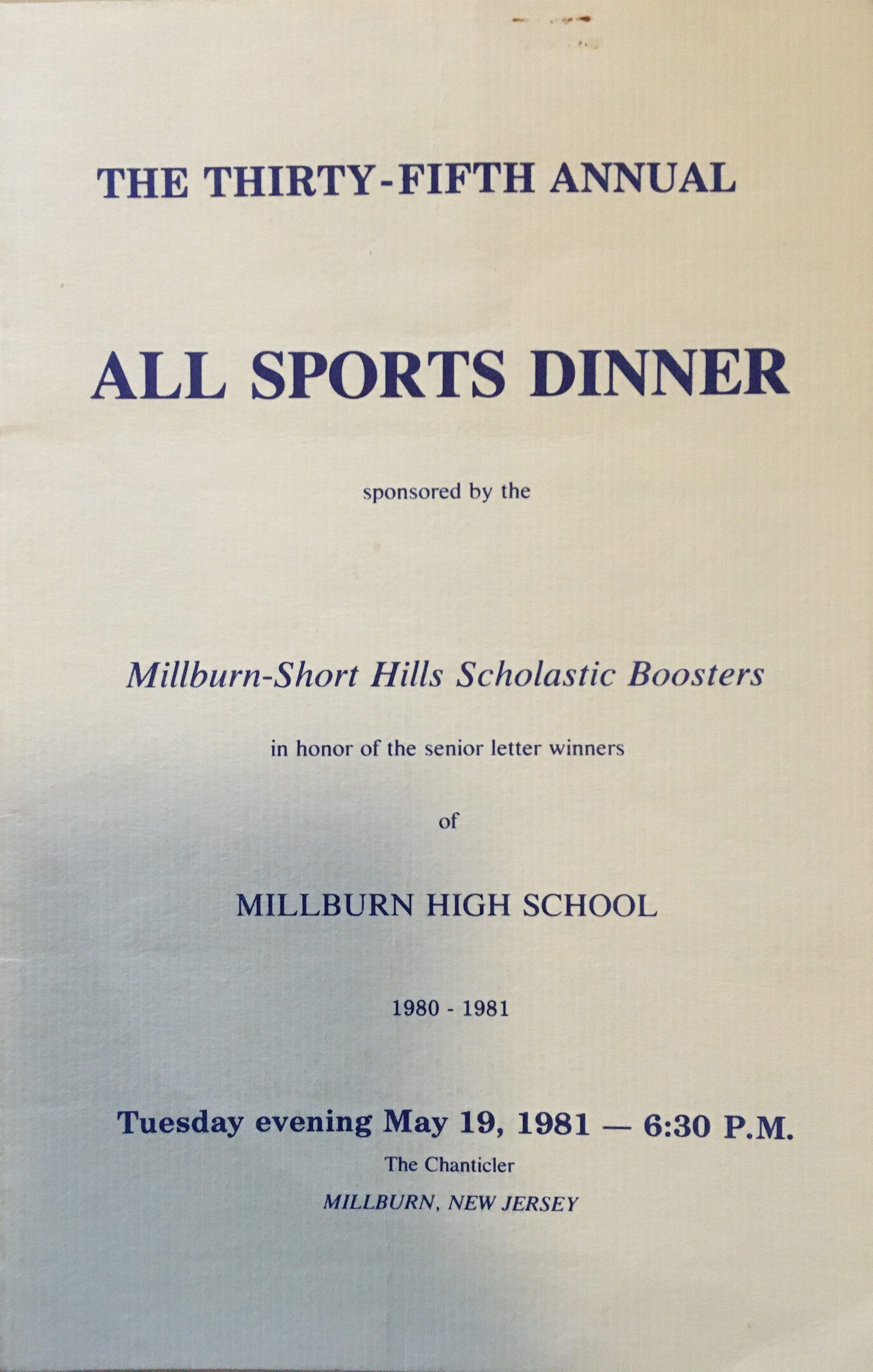 Program for the 35th annual Millburn High School All Sports Dinner on Tuesday, May 19, 1981 at the Chanticler. 4 pp., Includes a list of the Senior Lettermen and Women. Among those who spoke at the event were: W. Donald Horn (Master of Ceremonies), Reverend David B. Earnest, Maureen Ognen, Paul Tighe (President of Millburn-Short Hills Scholastic Boosters), Paul Beck (Athletic Director), Billy Taylor (New York Giants Running Back)Acquisition