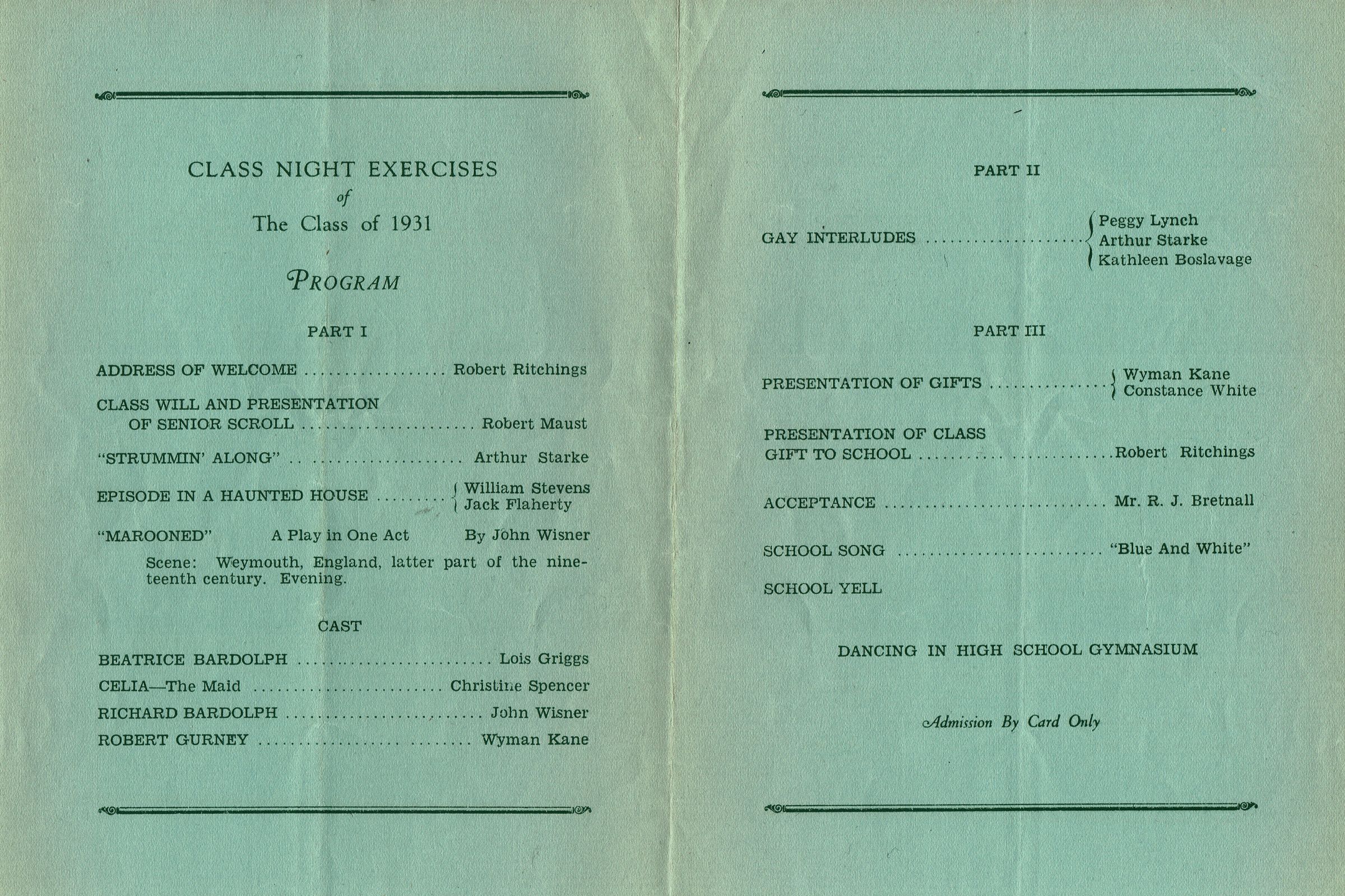 Program for the class night exercises at Millburn High School on Tuesday, June 16, 1931 held at the Short Hills School Auditorium. 4 pp. Insert found in Bill Barr's 1931 Yearbook.Acquisition