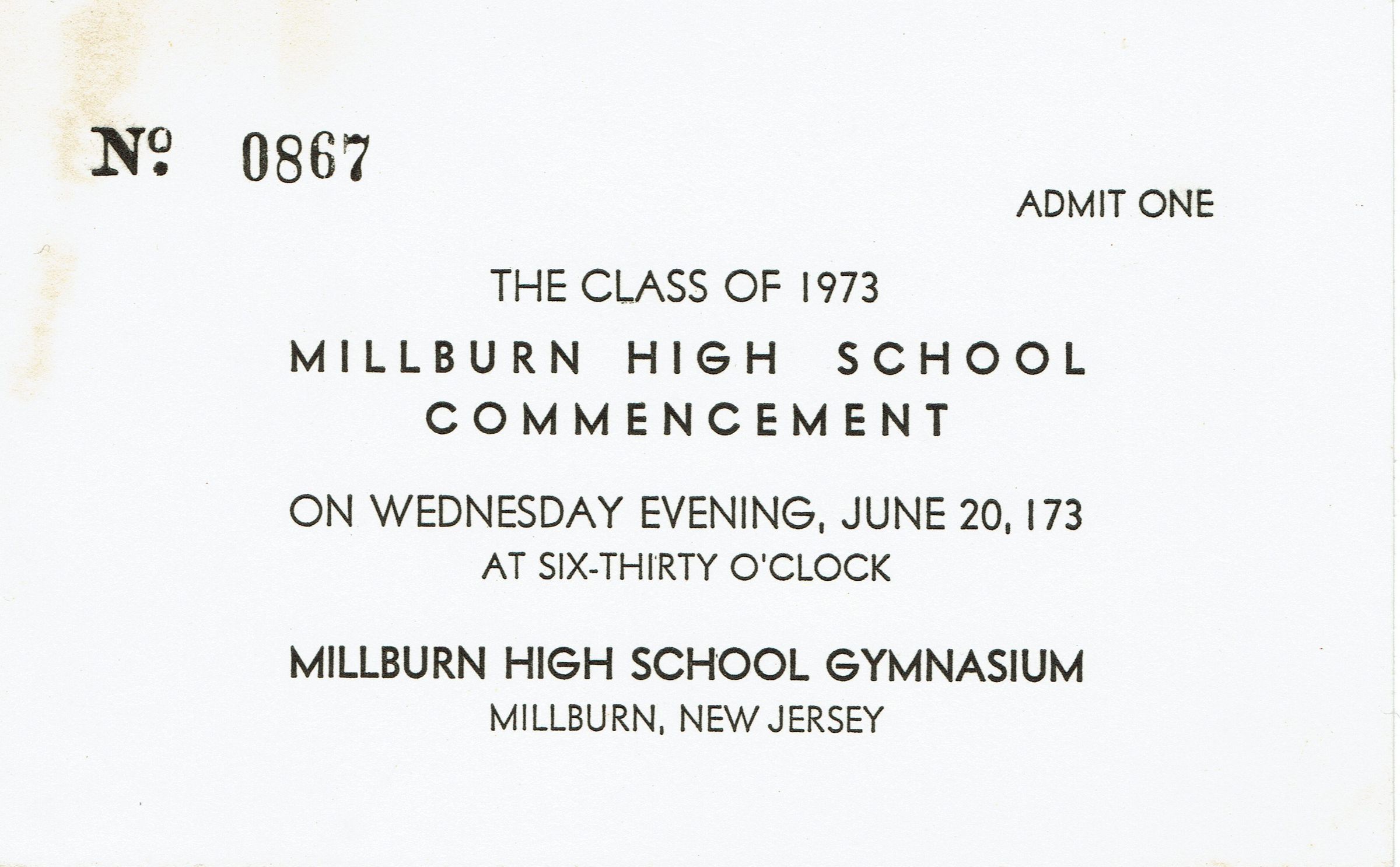Millburn High School Class of 1973 Commencement Ticket for Wednesday, June 20, 173 (sic) at 6:30 pm. Millburn High School Gymnasium.Acquisition