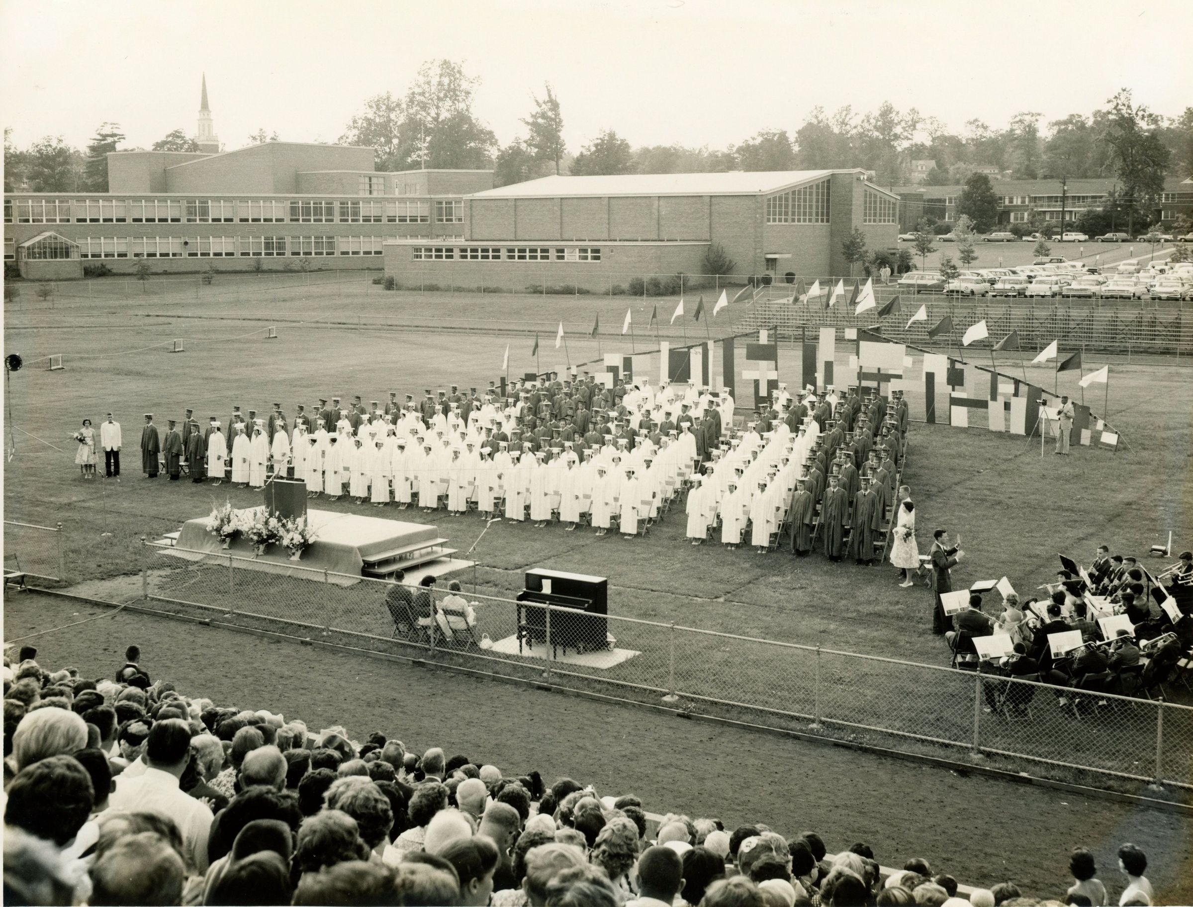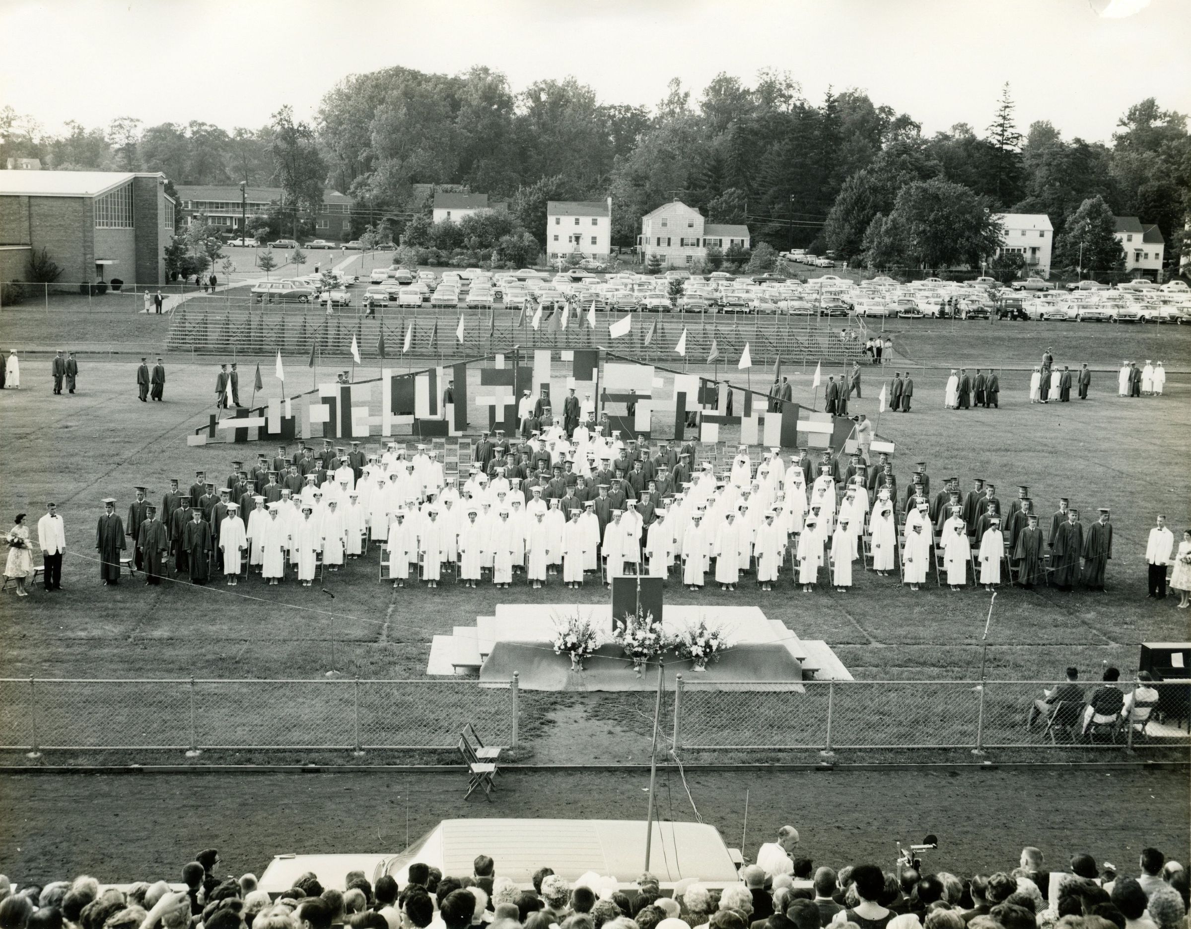 Photographs of the Millburn High School Commencement Exercises on June 22, 1961. The exercises were held on the athletic field. The MHS graduating class of 1961 had 245 students. These photographs come from the Robert Faddis testimonial binder. Faddis retired from the Millburn Public Schools in June 1961, having served the district for 37 years.Collection