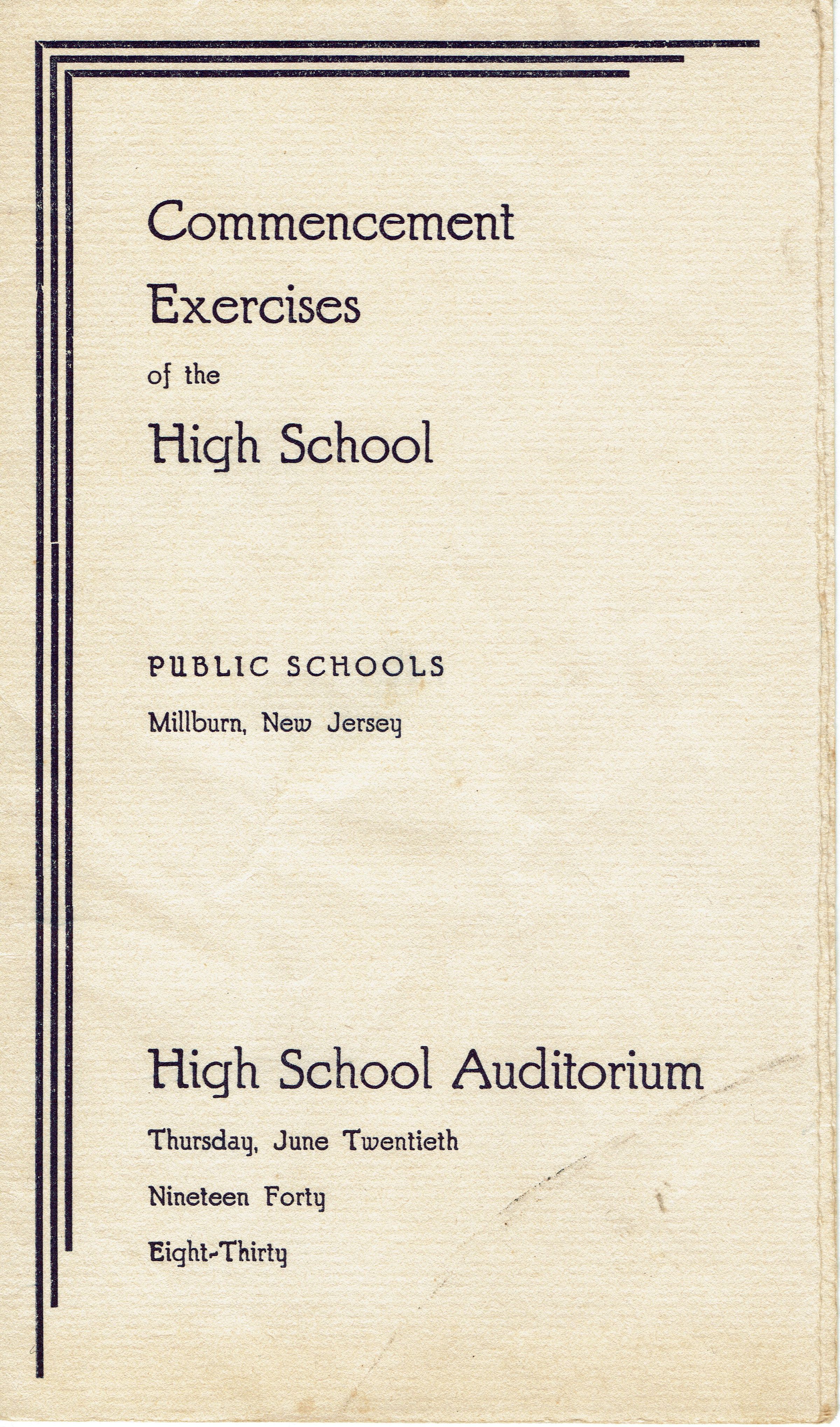 Program for the Commencement Exercises of the High School, Public Schools, Millburn. New Jersey on Thursday, June 20, 1940 at 8:30 pm. Found in Betty Cunliffe's Yearbook. 4 pp.Acquisition
