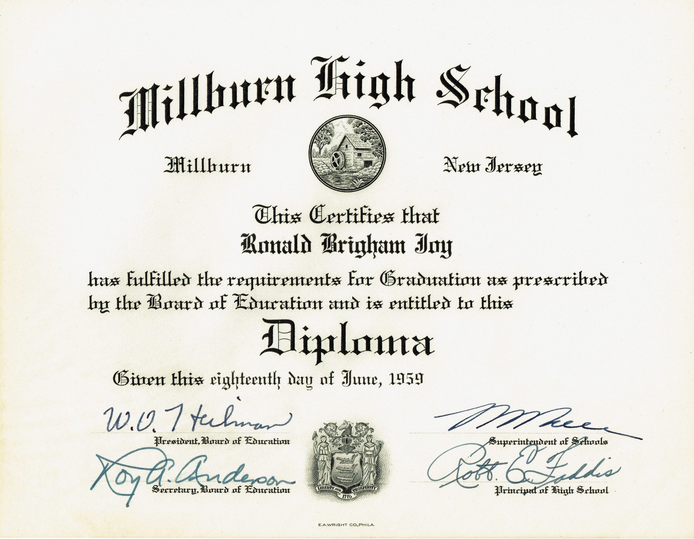 Millburn High School Diploma for Ronald Brigham Joy dated June 8, 1959.Acquisition
