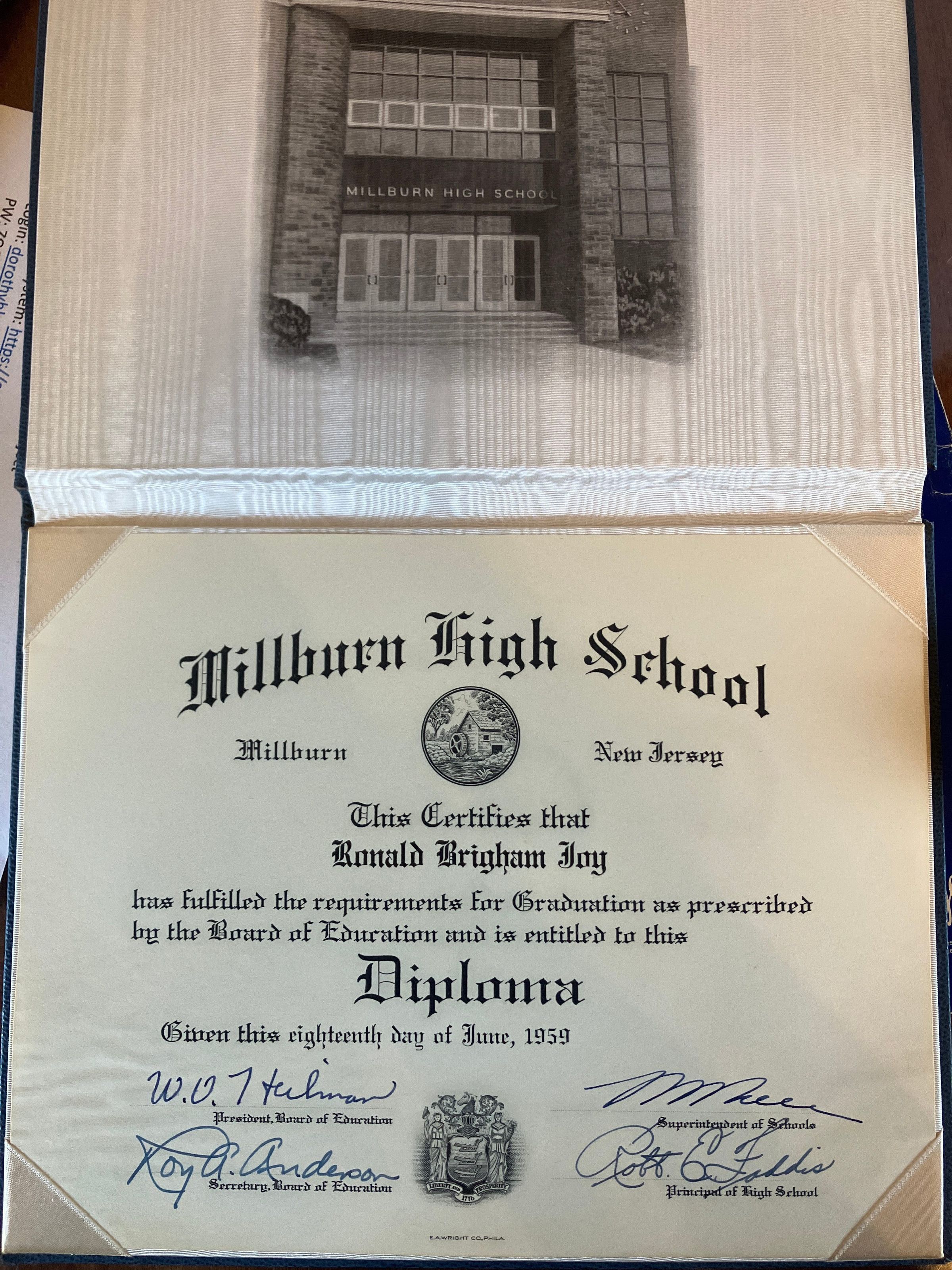 Millburn High School: Diploma of Ronald Day, 1959Entry/Object ID