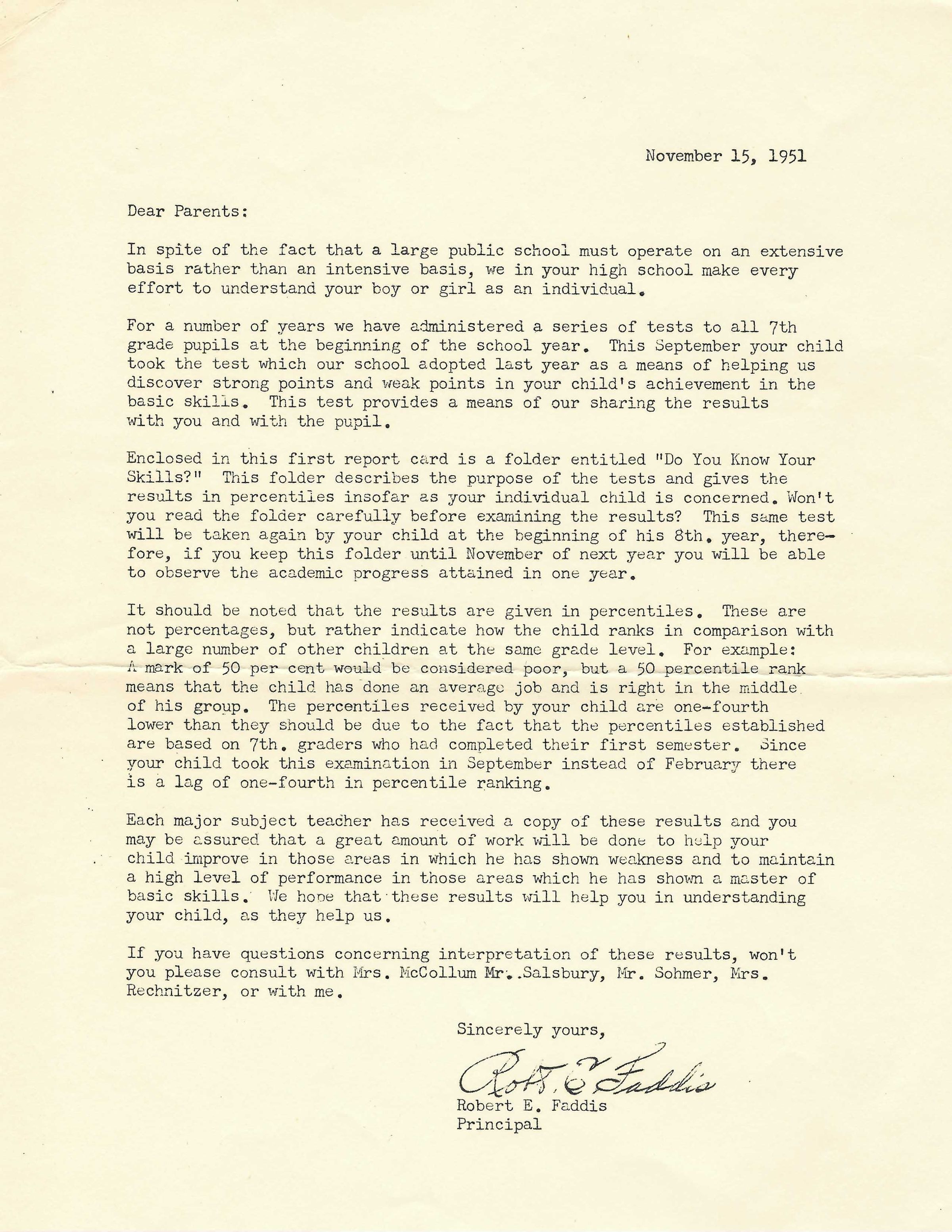Copy of Standardized Testing Booklet (4 pp.) and letter from Robert Faddis from 1951.Acquisition