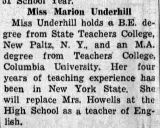 Marion Underhill taught 8th grade at Millburn High School from September 1950-December 31, 1955.Acquisition