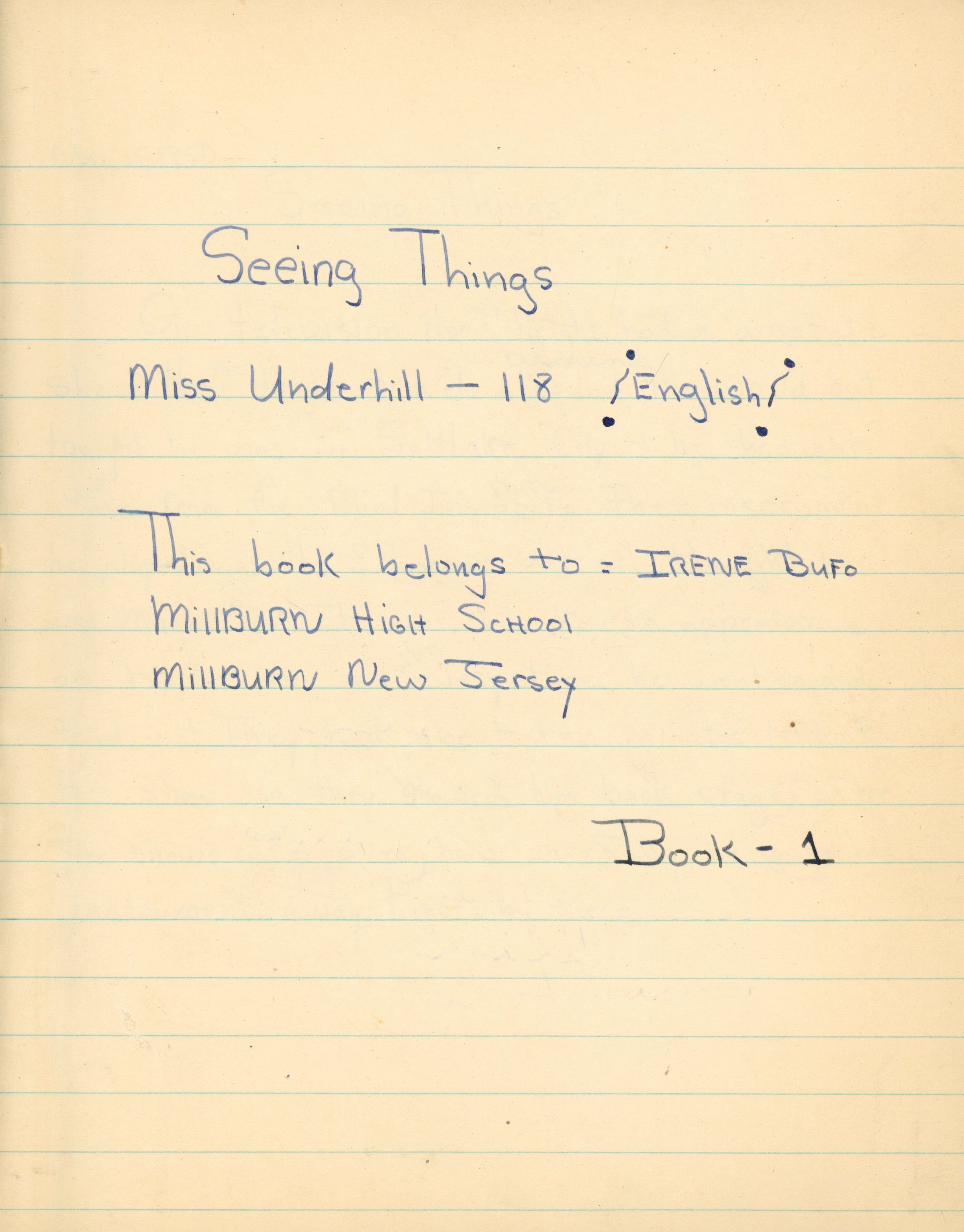 Irene Bufo's (1938-2016) 8th grade MHS English class assignment notebook from 1950. The notebook is entitled "Seeing Things" and consists of short essays about various things observed by students. The essays are illustrated with clippings fro magazines and newspapers. Irene Bufo graduated from MHS in 1956 and married Rick Dolansky in 1958. She was a life-long resident of Millburn and taught at the Open Door Nursery for 44 years.