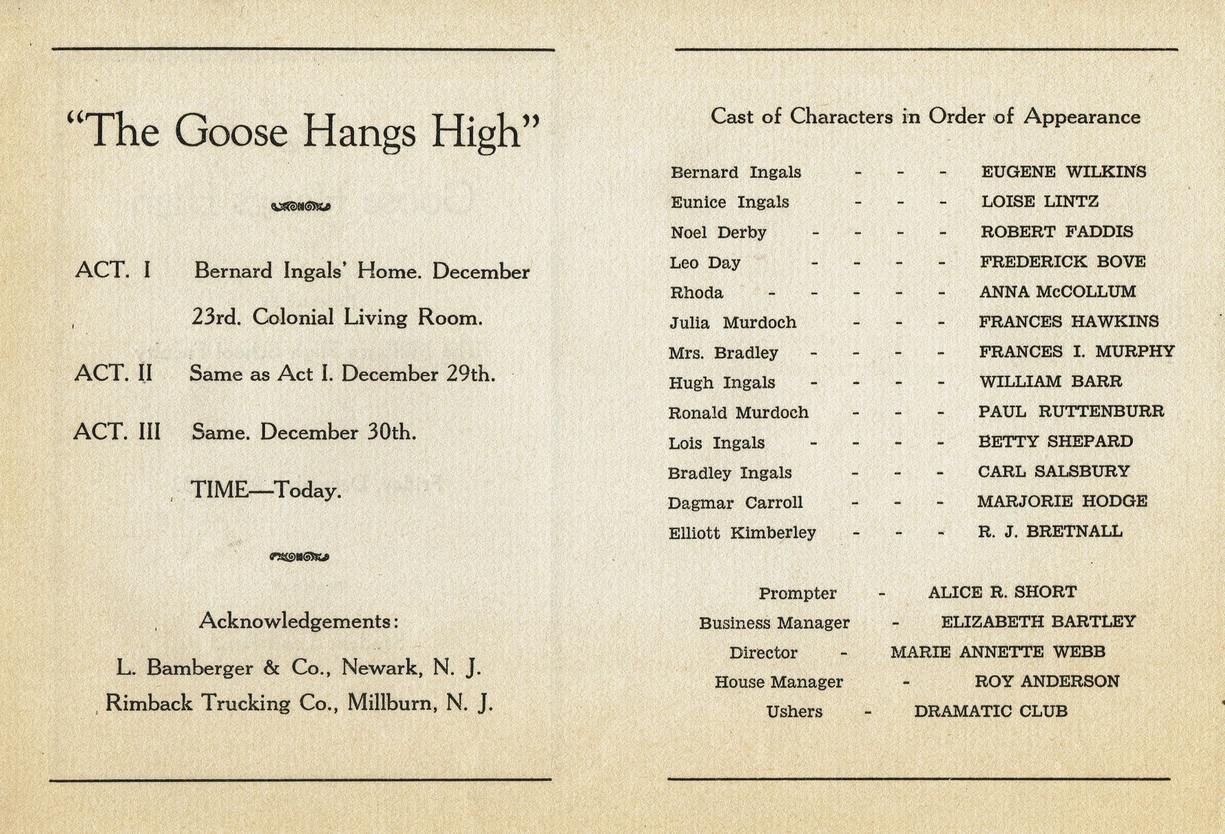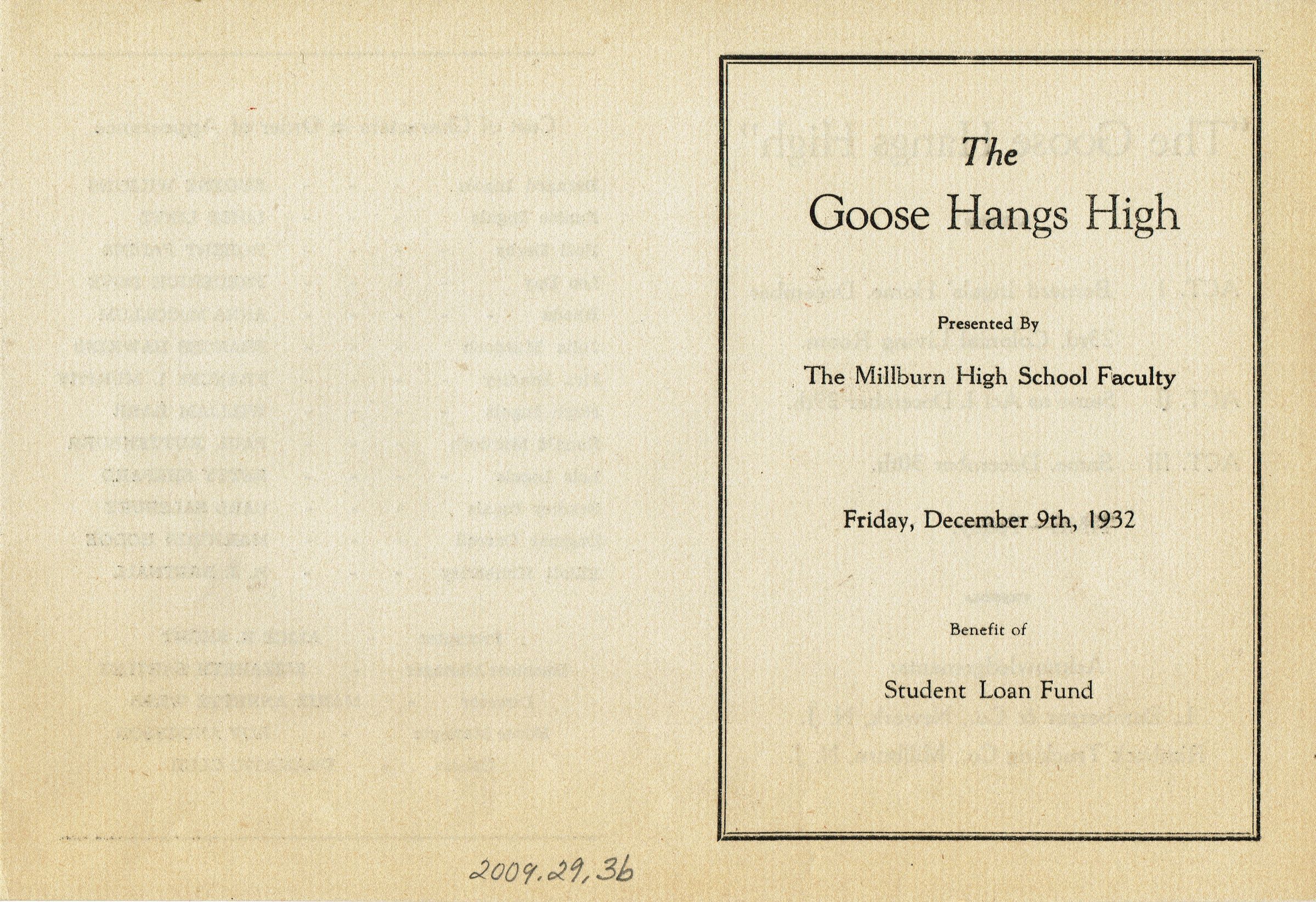 Program for The Goose Hangs High, Presented by The Millburn High School Faculty, Friday, December 9, 1932 for the benefit of the Student Loan Fund. Faculty members in the performance were: Eugene Wilkins, Loise LIntz, Robert Faddis, Frederick Bove, Anna McCollum, Frances Hawkins, Frances I. Murphy, William Barr, Paul Ruttenburr, Betty Shepard, Carl Salsbury, Marjorie Hodge, R. J. Bretnall, Alice R. Short, Elizabeth Bartley, Marie Annette Webb, and Roy Anderson.