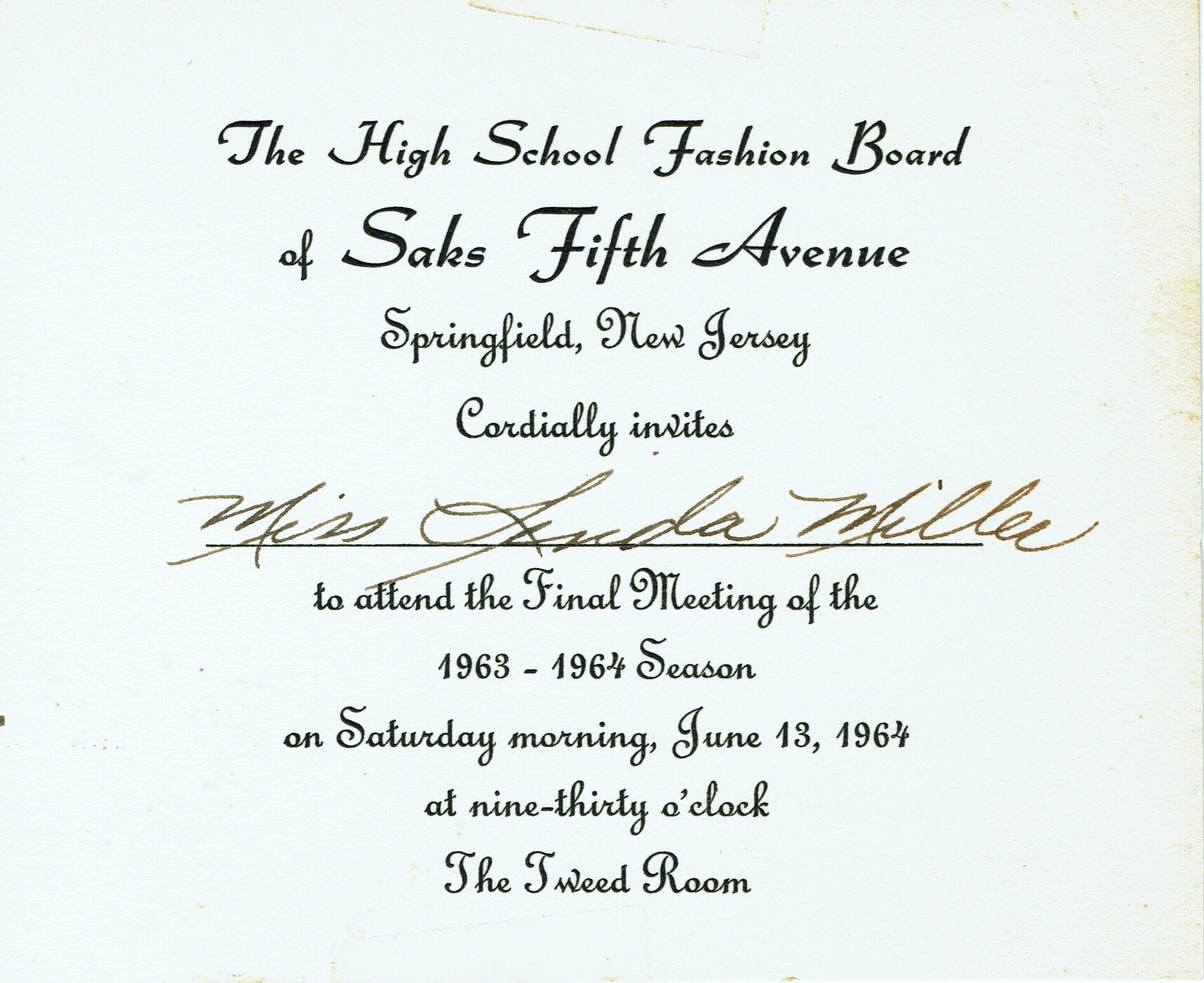 Invitation issued to Linda Miller to attend the Final Meeting of the High School Fashion Board of Saks Fifth Avenue on Saturday, June 13, 1964.Acquisition