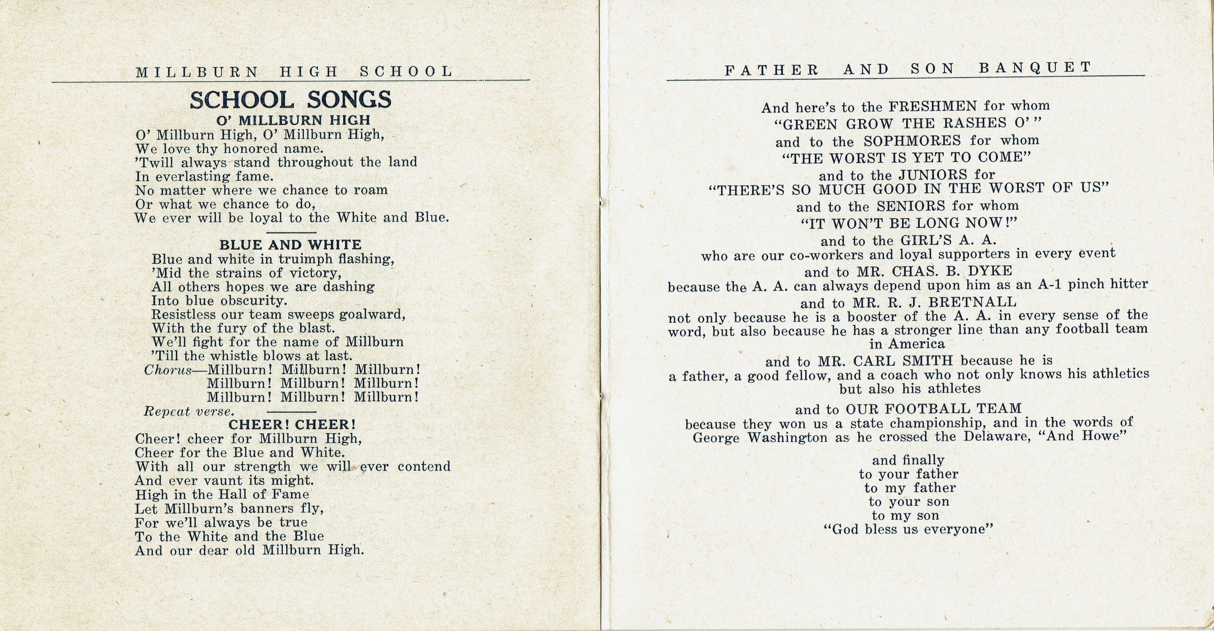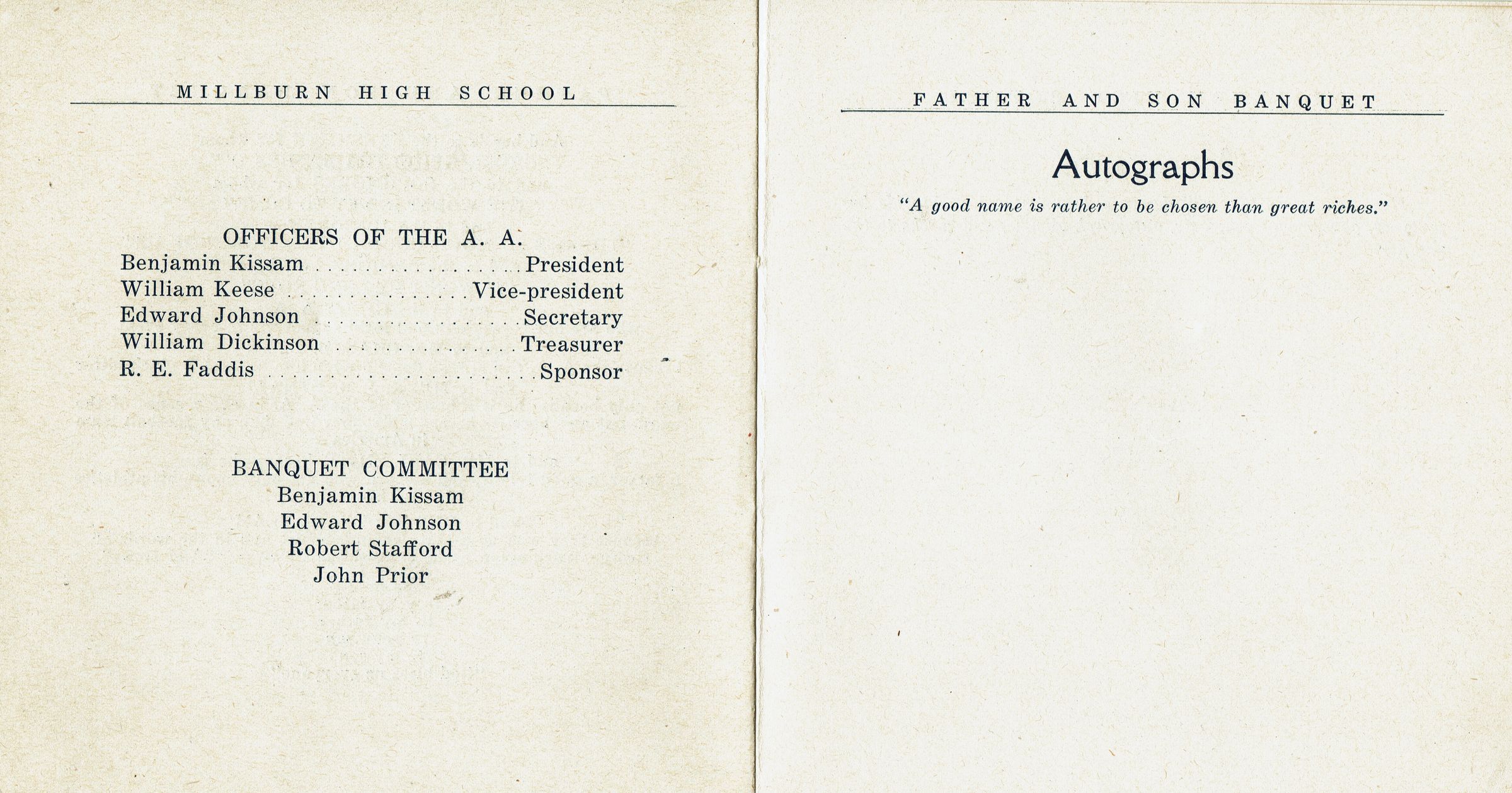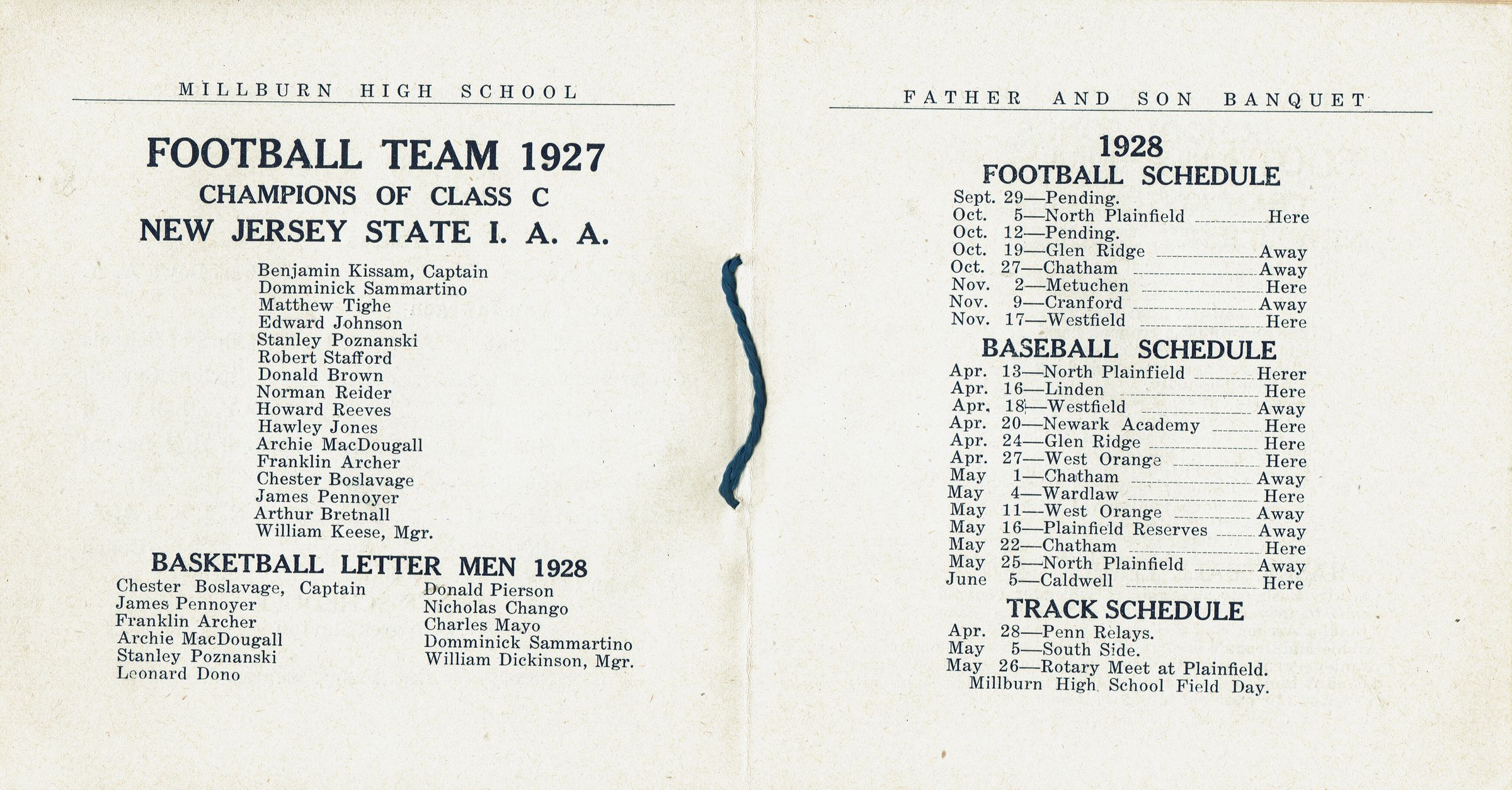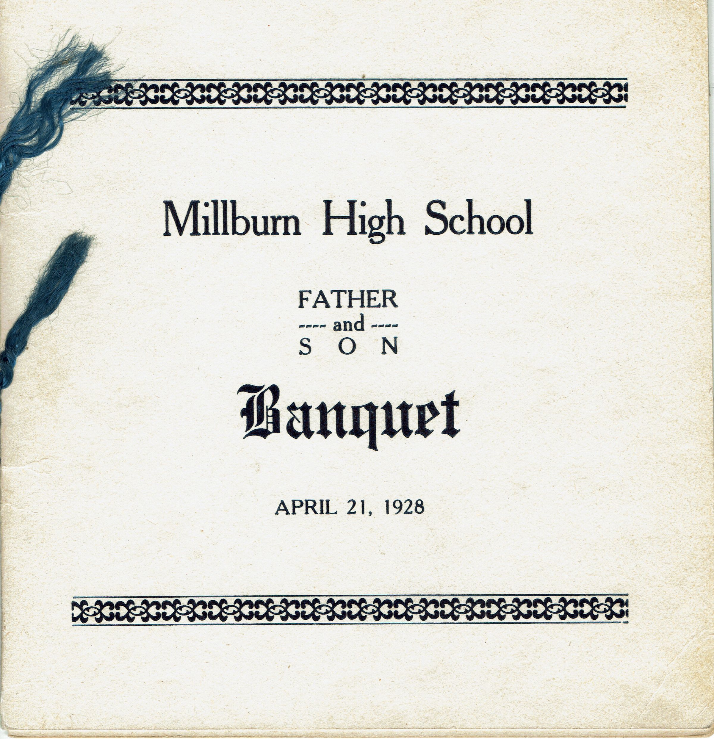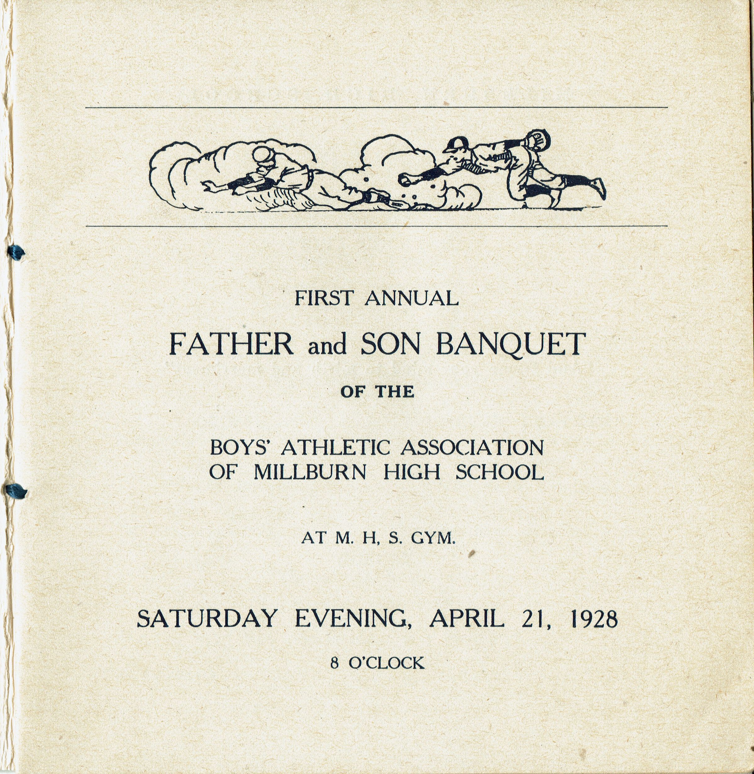 Program from the First Annual Father and Son Banquet of the Boys' Athletic Association of Millburn High School at the M.H.S. Gym. Saturday, April 21, 1928. 16 pages, bound with blue string. Contains Menu, Toasts, 1927-28 Football and Basketball Team Members, 1928 Football, Baseball and Track Schedule, School Songs & Cheers, Officers of the Athletic Association. Officers were: Benjamin Kissam (President), William Kleese (Vice President), Edward Johnson (Secretary), William Dickinson (Treasurer), R.E.Faddis (Sponsor).Acquisition