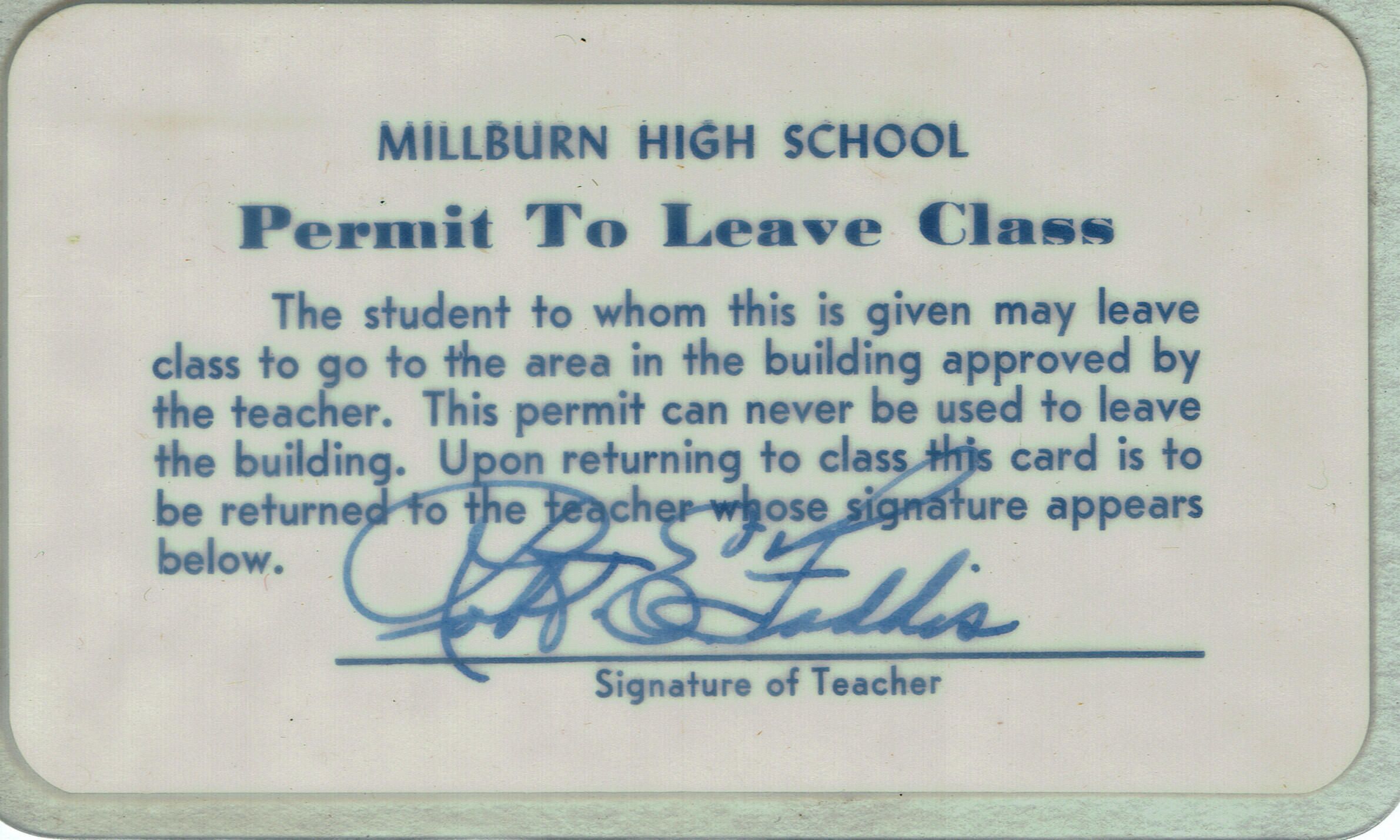 Millburn High School Hall Pass Signed by Robert E. Faddis. The pass permitted a student to leave class to go to the area in the building approved by the teacher. The pass was issued by Robert Faddis, who was a MHS teacher at the time.Collection