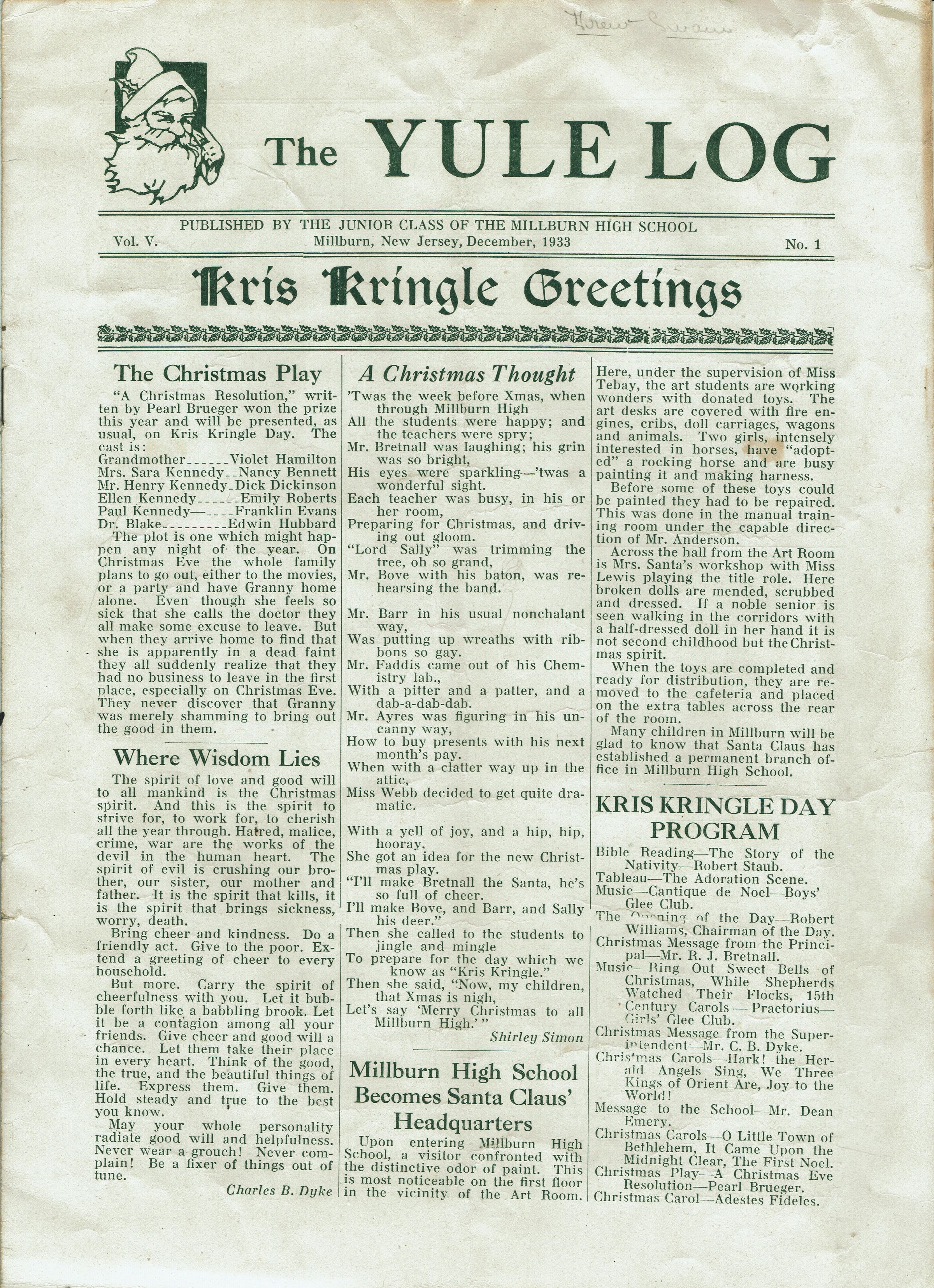 Millburn High School Holiday Newsletter, The Yule Log, December 1933Entry/Object ID