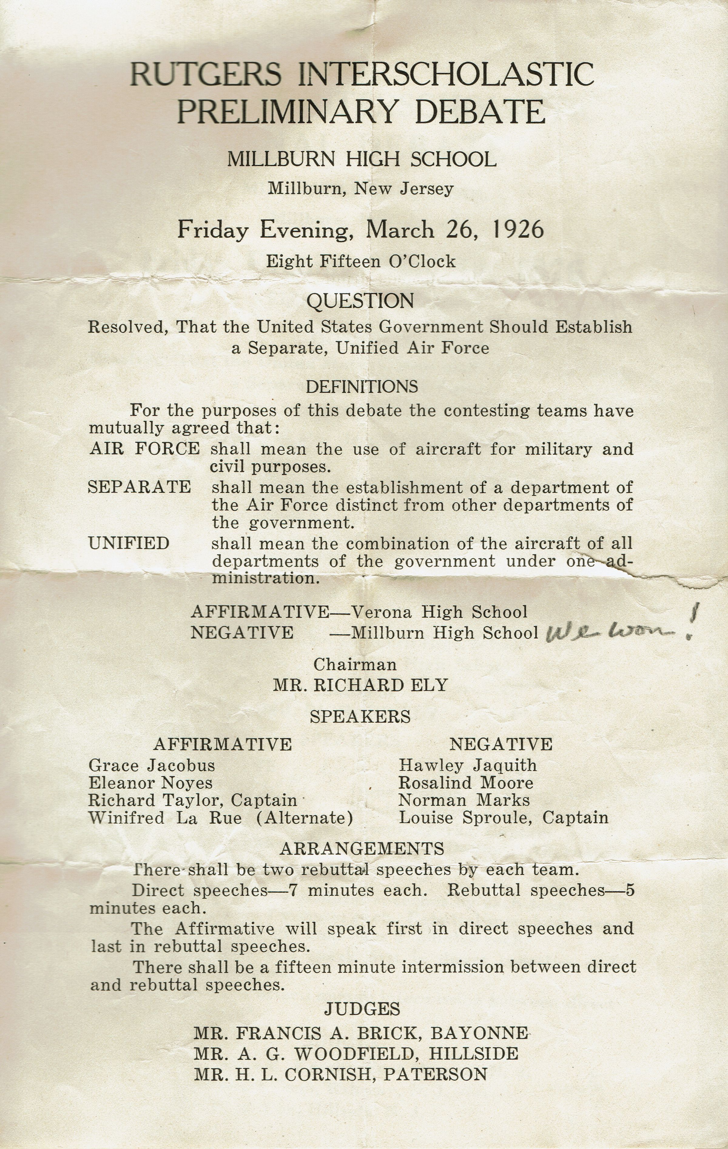 Program for the Rutgers Interscholastic Preliminary Debate, held at Millburn High School on Friday, March 26, 1926 at 8:15 pm. Program contains a hand written note saying "We won!"Acquisition