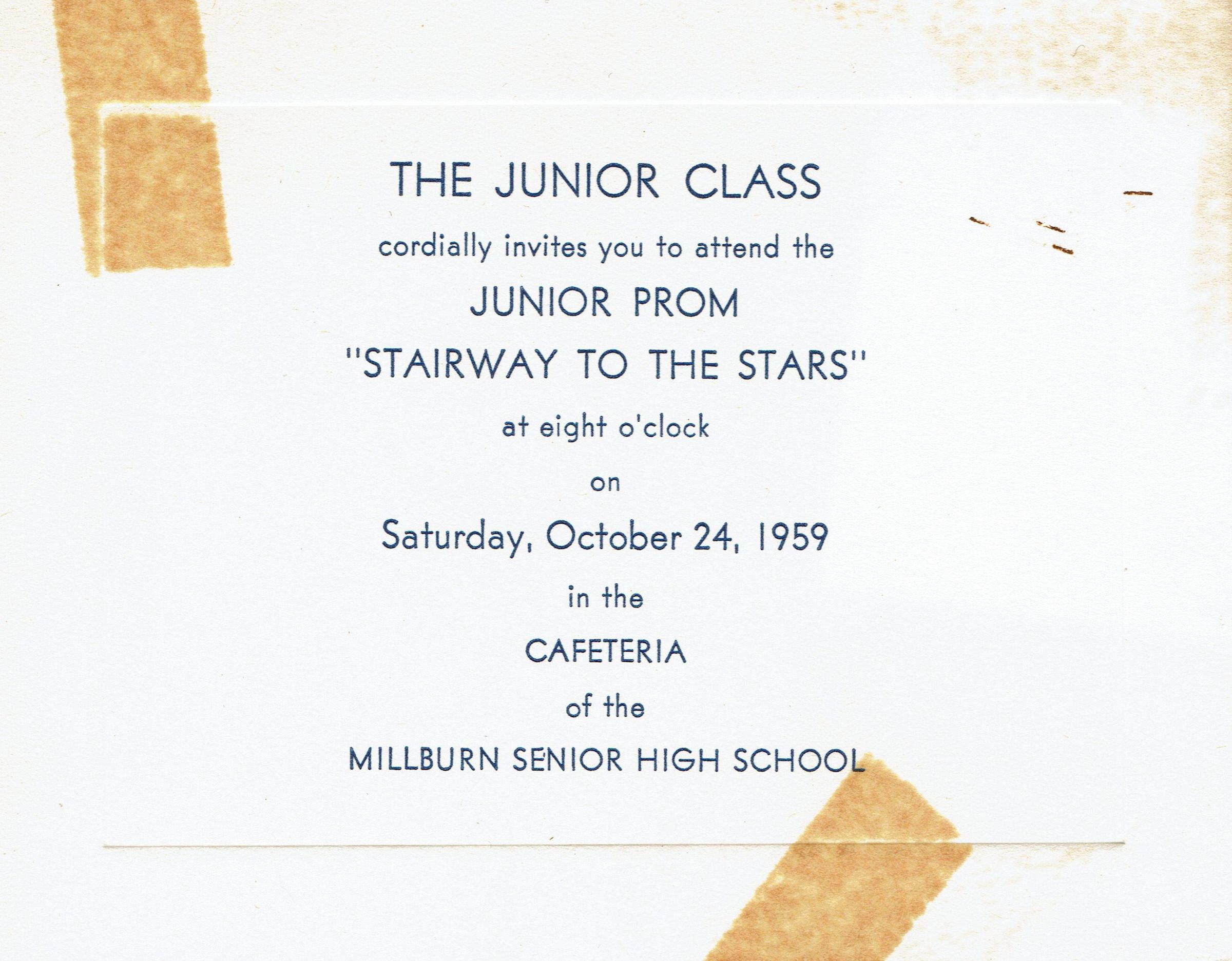 Invitation to the Millburn High School Junior Prom " Stairway to the Stars" at 8:00 pm on Saturday, October 24, 1959 in the Millburn Senior High School Cafeteria.Dimensions