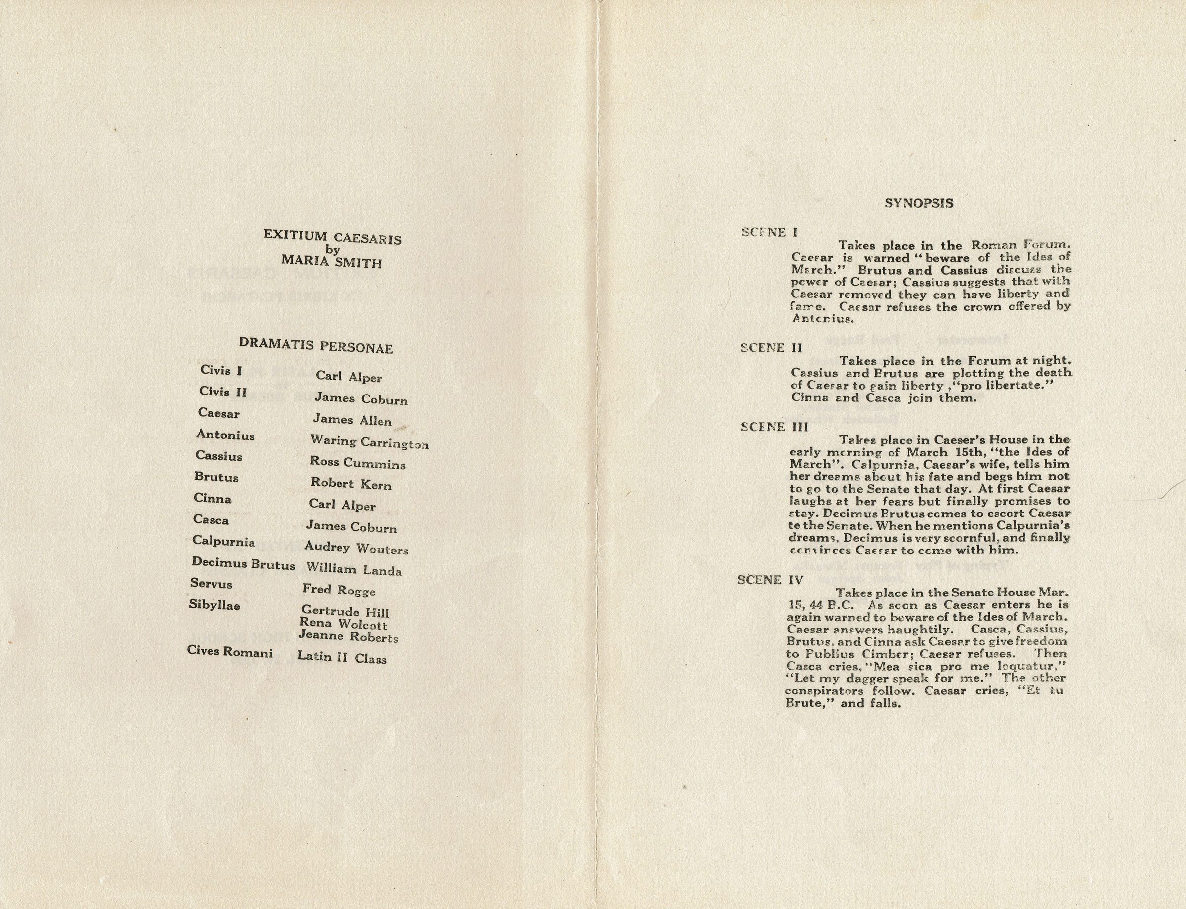Program for "Exitium Caesaris": A Latin Play in Four Scenes presented by the Millburn High School Latin Classes, April 26, 1935. Participants were: Carl Alper, James Coburn, James Allen, Waring Carrington, Ross Cummins, Robert Kern, Audrey Wouters, William Landa, Fred Rogge, Gertrude Hill, Rena Wolcott and Jeanne Roberts. 4 pp.Acquisition