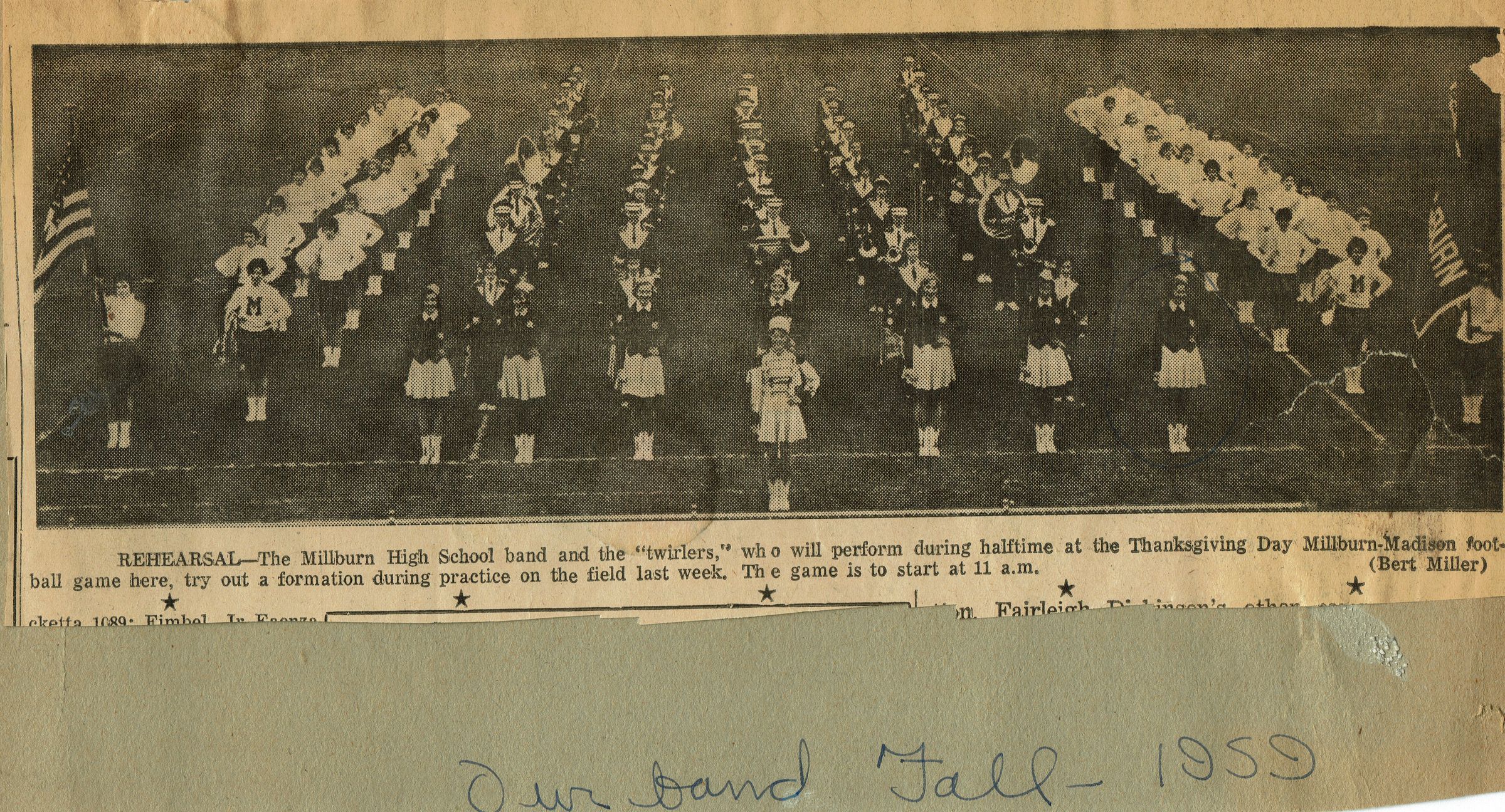 Photograph from the Millburn-Short Hills Item, November 1959 of the Millburn High School Marching Band and Twirlers. Newspaper clipping was taken from a scrapbook.Acquisition