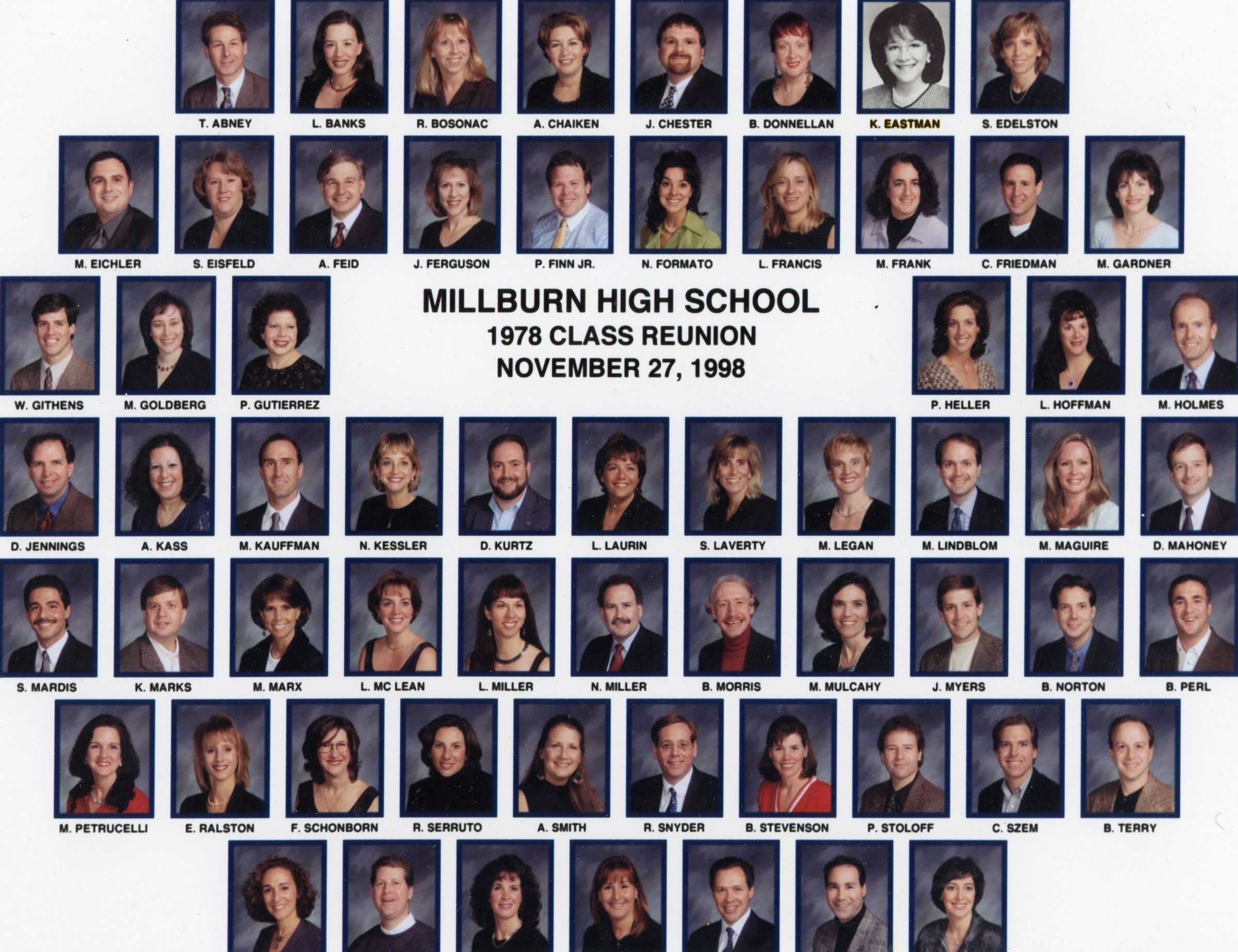 Composite photograph of members of the Millburn High School Class of 1978 from their 20 year reunion, November 27, 1998.Acquisition