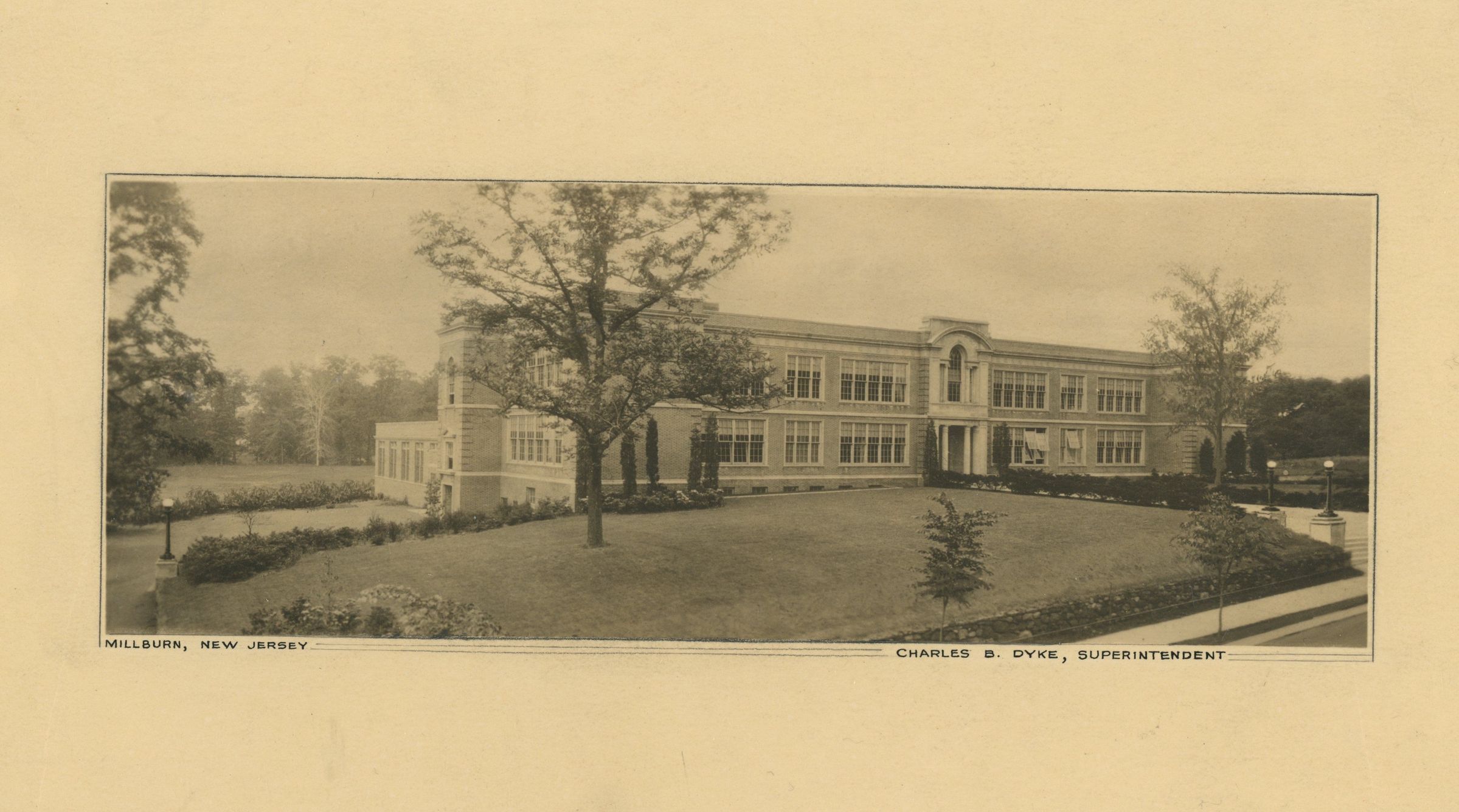 Photograph of the newly constructed Millburn High School on Old Short Hills Road taken from Old Short Hills Road looking north west. Charles B. Dyke was Superintendent.Acquisition